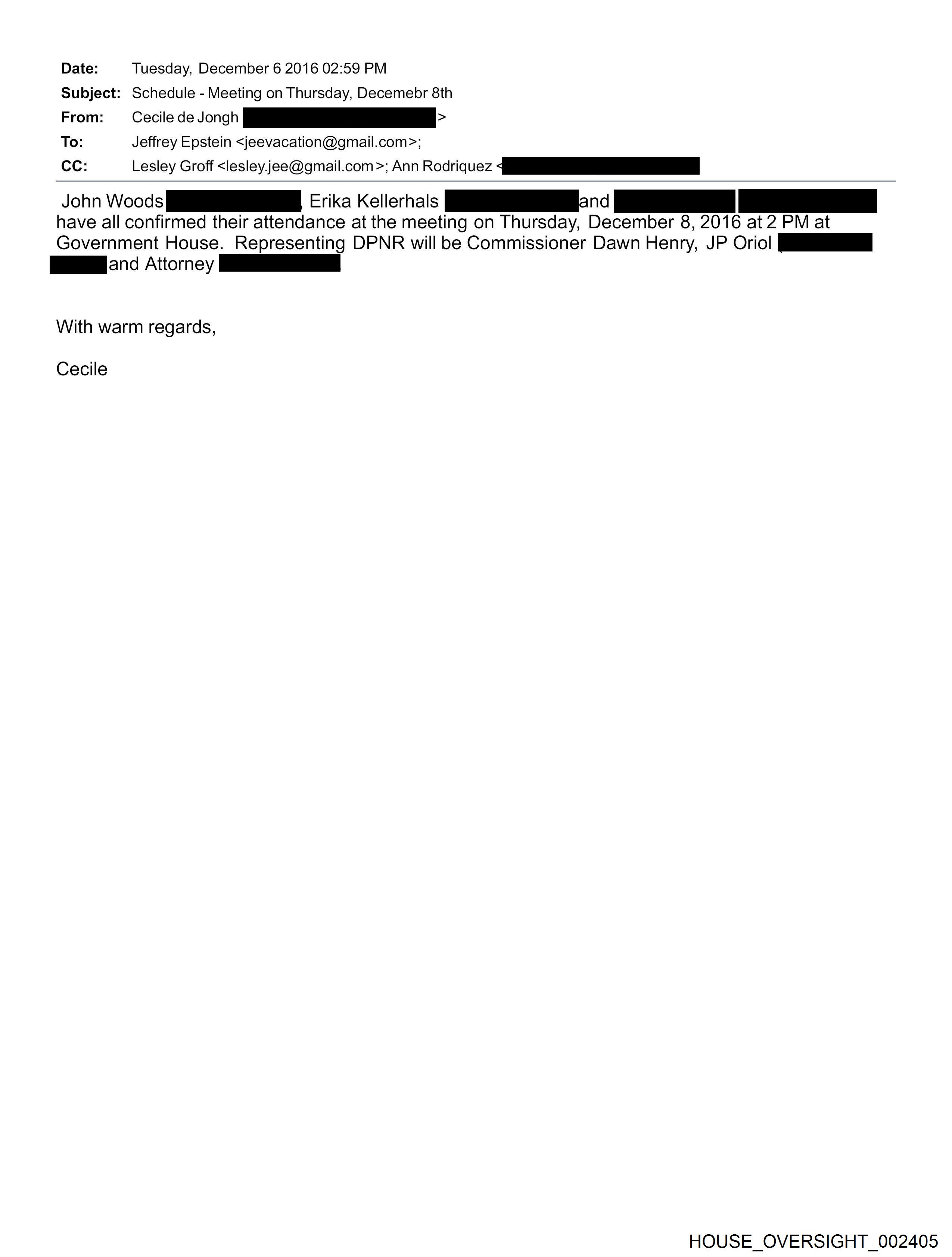 Date: Tuesday, December 6 2016 02:59 PM Subject: Schedule - Meeting on Thursday, Decemebr 8th From: Cecile de Jongh i ~ To: Jeffrey Epstein <jeevacation@gmail.com>; Cc: Lesley Groff <lesley.jee@gmail.com>; Ann Rodriquez ia John Woods gE «Erika Kellerhals and have all confirmed their attendance at the meeting on Thursday, December 8, 2016 at 2 PM at Government House. Representing DPNR will be Commissioner Dawn Henry, JP Oriol (iia GR and Attorney With warm regards, Cecile HOUSE_OVERSIGHT_002405