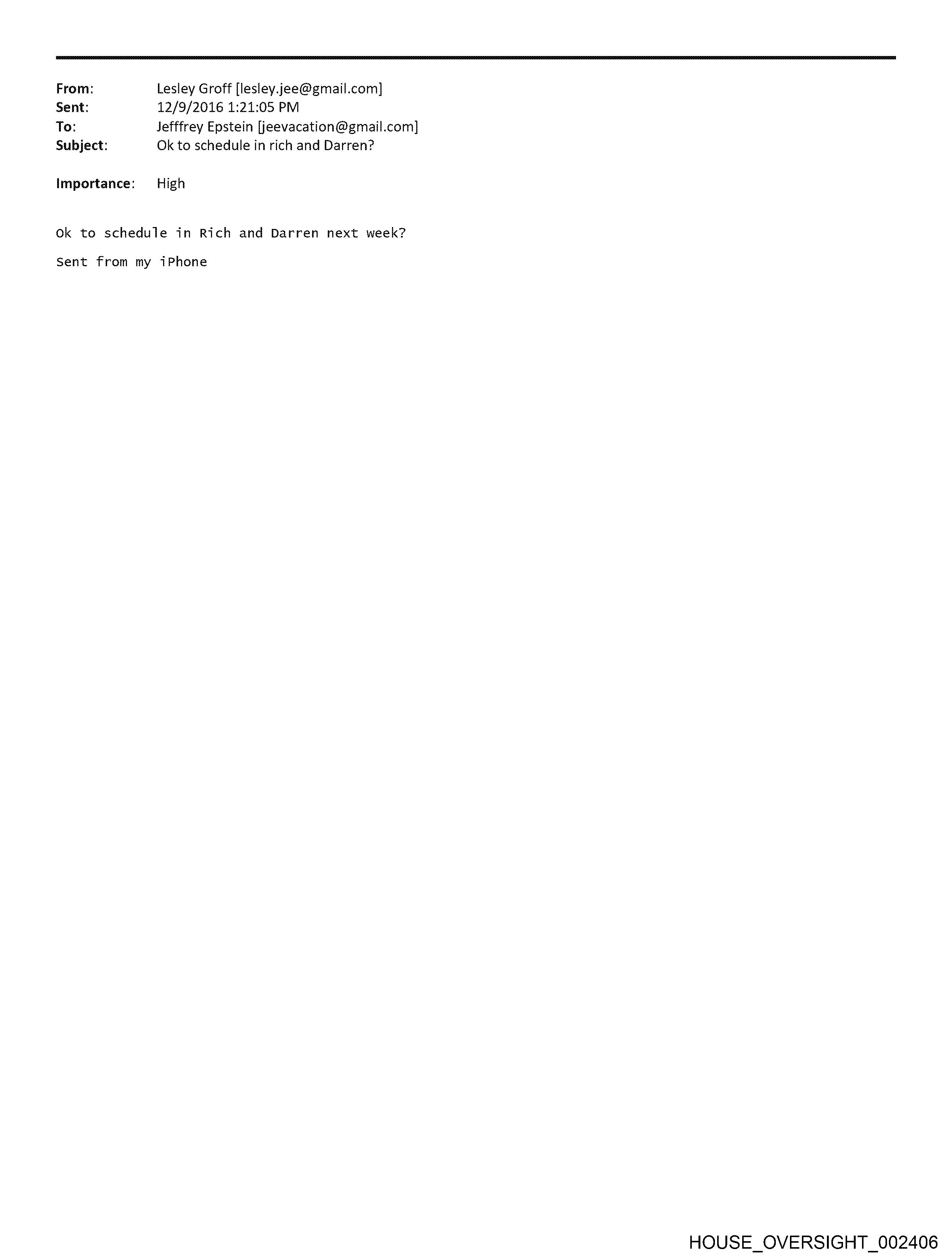 From: Lesley Groff <lesley.jee@qmail.com> Sent: Monday, December 12, 2016 12:36 PM To: jeffrey E. Subject: Re: Schedule Mon. Dec. 12, 2016 Importance: High I think Patrick has off on Mondays. Will double check. Who will send script for blood work and I will follow up for you. Sent from my iPhone On Dec 12, 2016, at 5:32 AM, jeffrey E. <jeevacation@gmail.com> wrote: is patrcik in today. . also have to go for blood test On Mon, Dec 12, 2016 at 5:15 AM, Lesley Groff <lesley.jee@gmail.com> wrote: Mon. Dec. 12, 2016 NY 1:00pm TENTATIVE Appt w/Jabor (waiting for his reply) 3:00pm Appt w/Rich and Darren 4:30pm Appt w/Anthony neif—_ 5:00pm Louella eo to depart JFK via Jet Blue#553 (Louella: Rec. Loc# EYKGBF) (GR Rec. Loc#RHRPXI) HOUSE_OVERSIGHT_002414