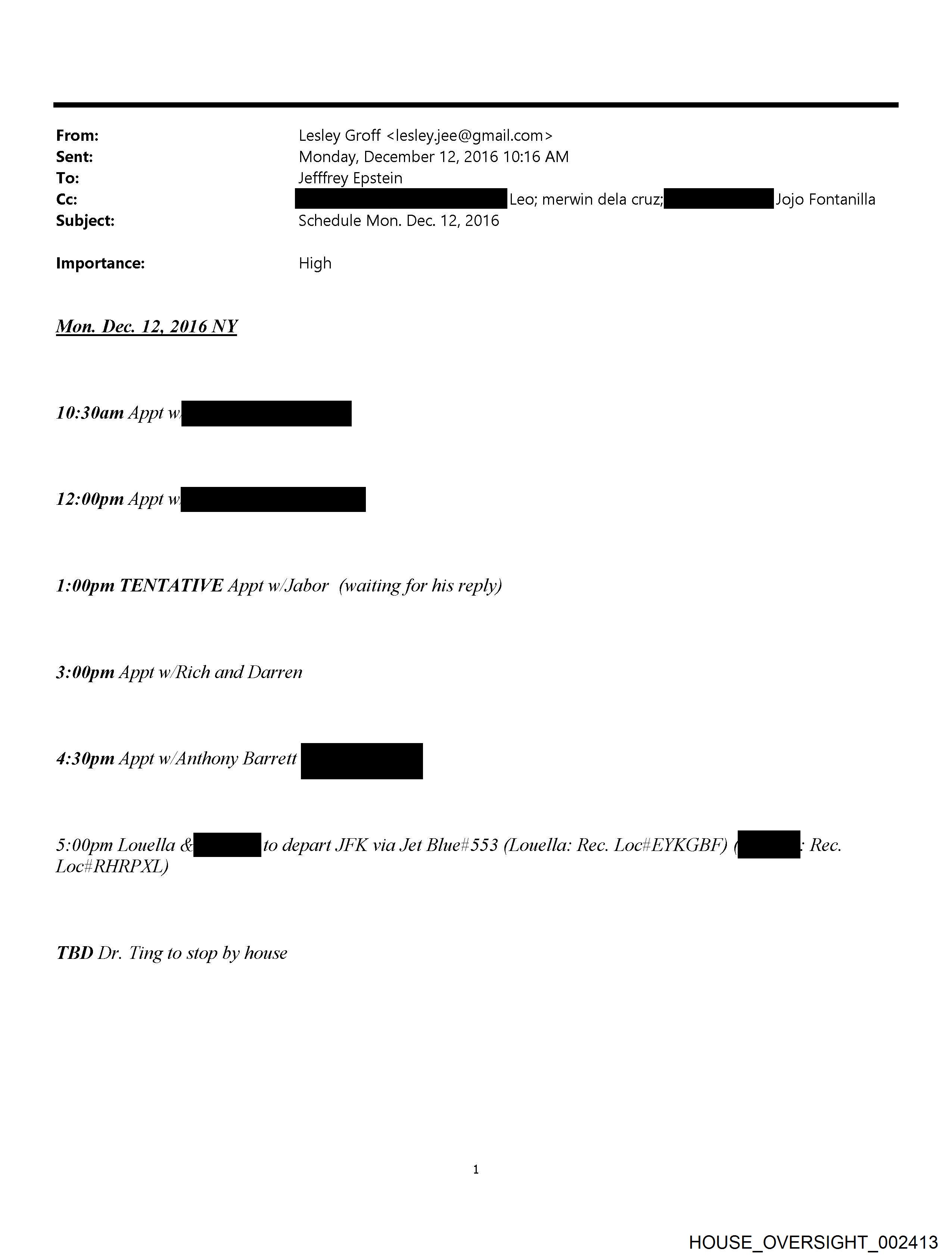 From: Lesley Groff <lesley.jee@qmail.com> Sent: Monday, December 12, 2016 10:16 AM To: Jefffrey Epstein Ce: ae -0. merwin dela cruz TE | ojo Fontanilla Subject: Schedule Mon. Dec. 12, 2016 Importance: High Mon. Dec. 12, 2016 NY 0:30am 4p 20pm 1:00pm TENTATIVE Appt w/Jabor (waiting for his reply) 3:00pm Appt w/Rich and Darren 4:30pm Appt w/Anthony Barrett a 5:00pm Louella Ci 10 depart JFK via Jet Blue#553 (Louella: Rec. Lock EYKGBF) , of Ree. Loc# RHRPXL) TBD Dr. Ting to stop by house HOUSE_OVERSIGHT_002413