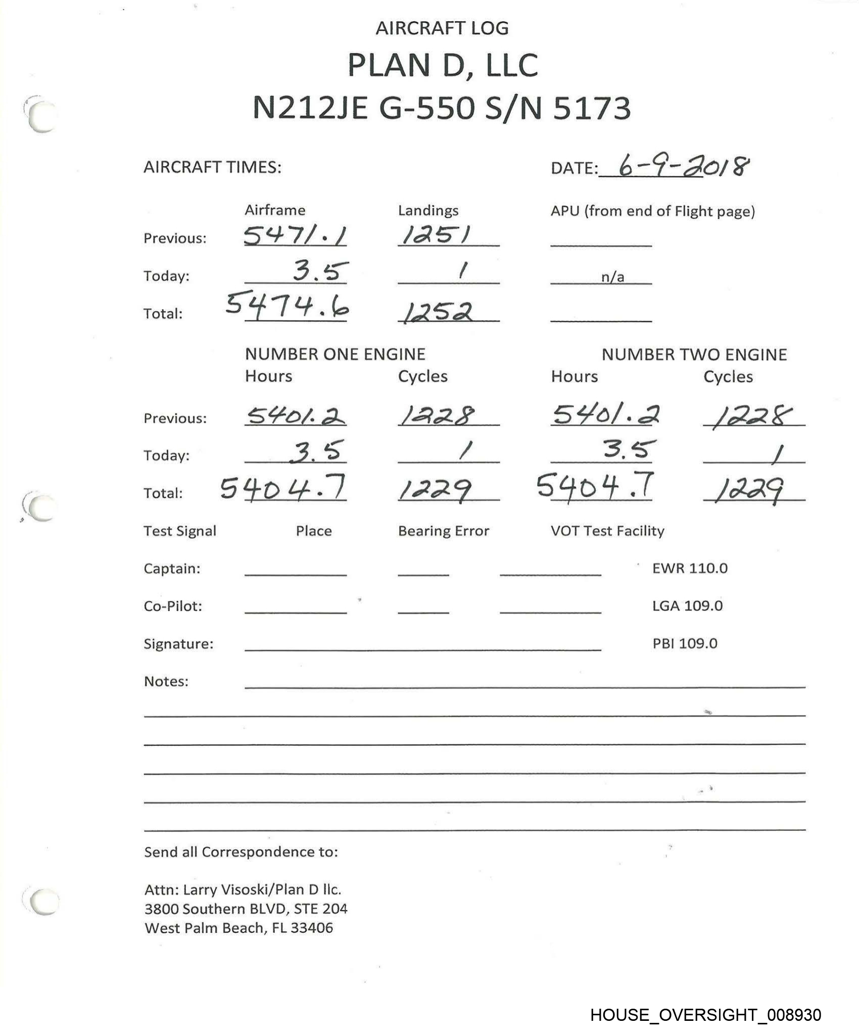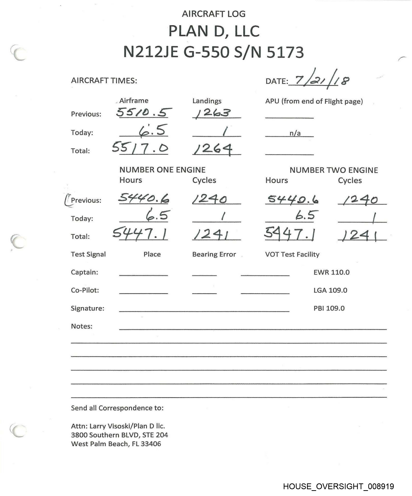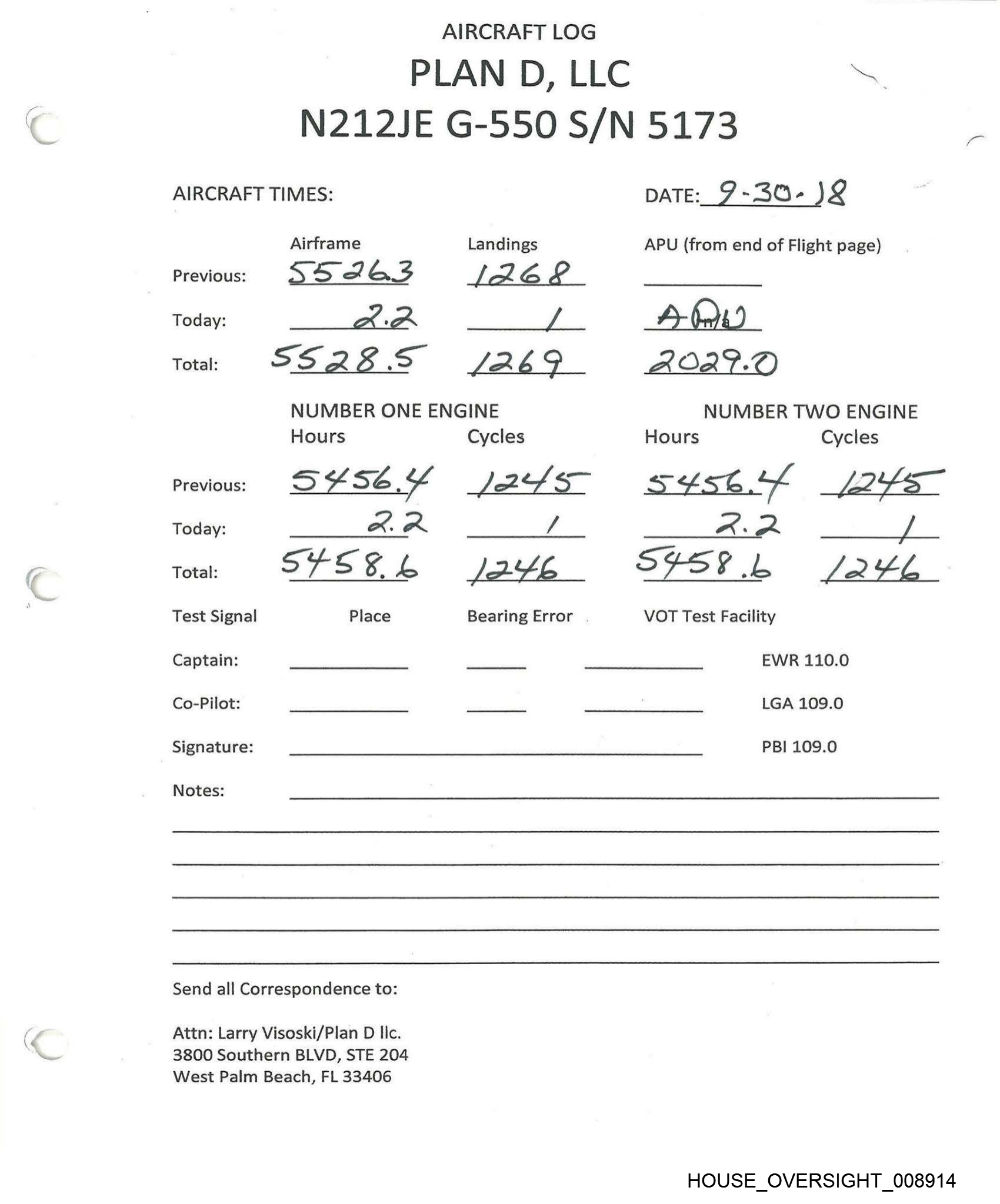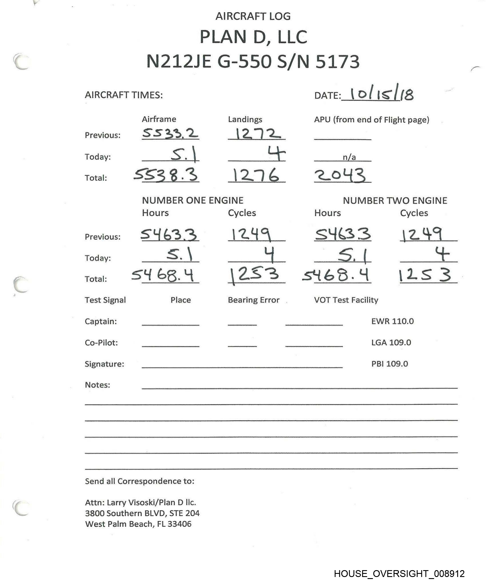 PLAN D, LLC AIRCRAFT LOG N212JE G-550 S/N 5173 AIRCRAFT TIMES: Airframe Landings Previous: SS 26.0 \ 2G | Today: “om he NUMBER ONE ENGINE Hours Cycles Previous: SY Sc. \ | 2.4 Today: 2 3 SUSE.Y Place Total: Test Signal Captain: Co-Pilot: Signature: Notes: Send all Correspondence to: Attn: Larry Visoski/Plan D llc. 3800 Southern BLVD, STE 204 West Palm Beach, FL 33406 \ A24us Bearing Error DATE: & log] IS APU (from end of Flight page) n/a 2.02.0 NUMBER TWO ENGINE Hours Cycles S4sbh) i249 — BS _ S4Ss6 4+ (24S VOT Test Facility EWR 110.0 LGA 109.0 PBI 109.0 HOUSE_OVERSIGHT_008915
