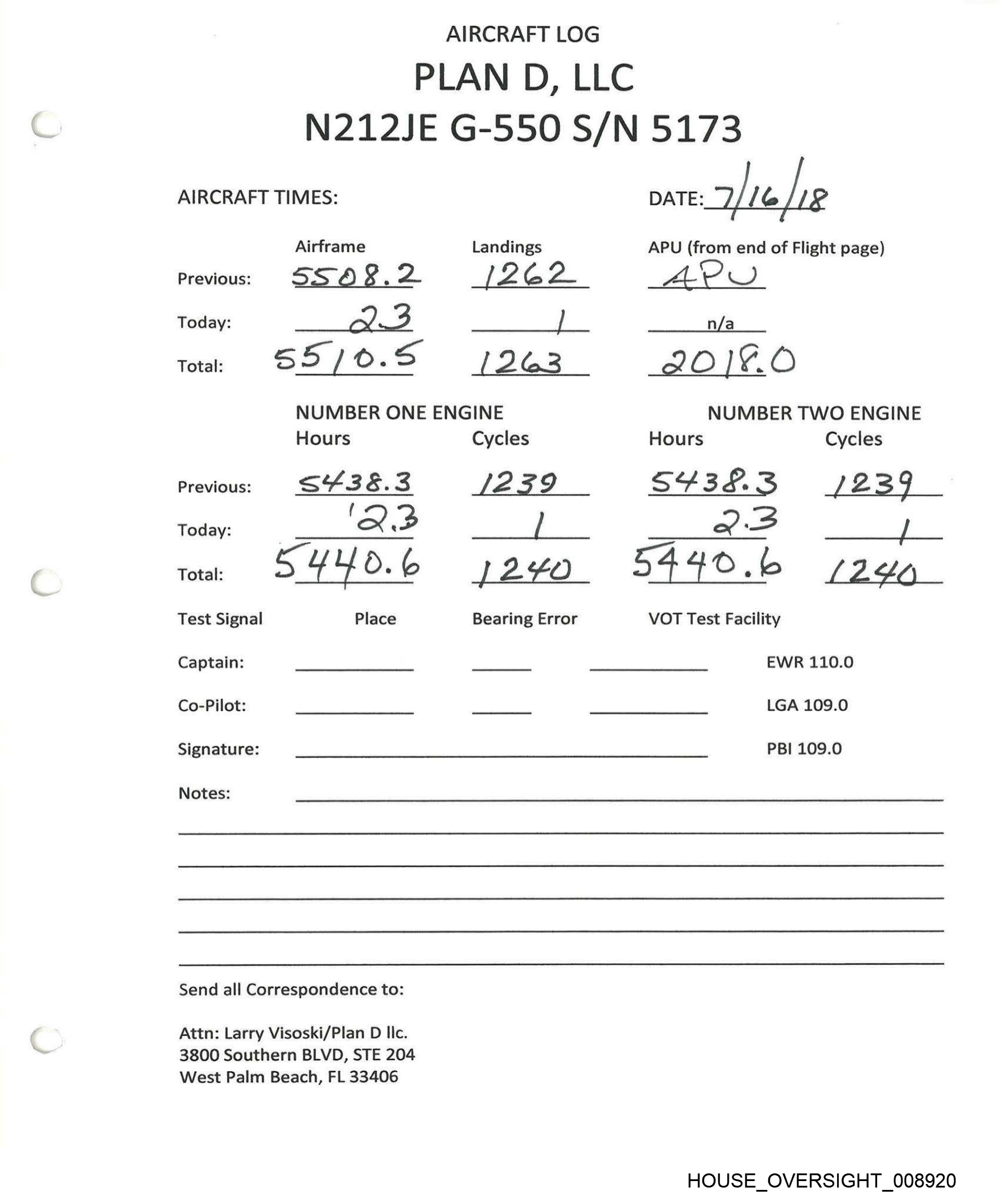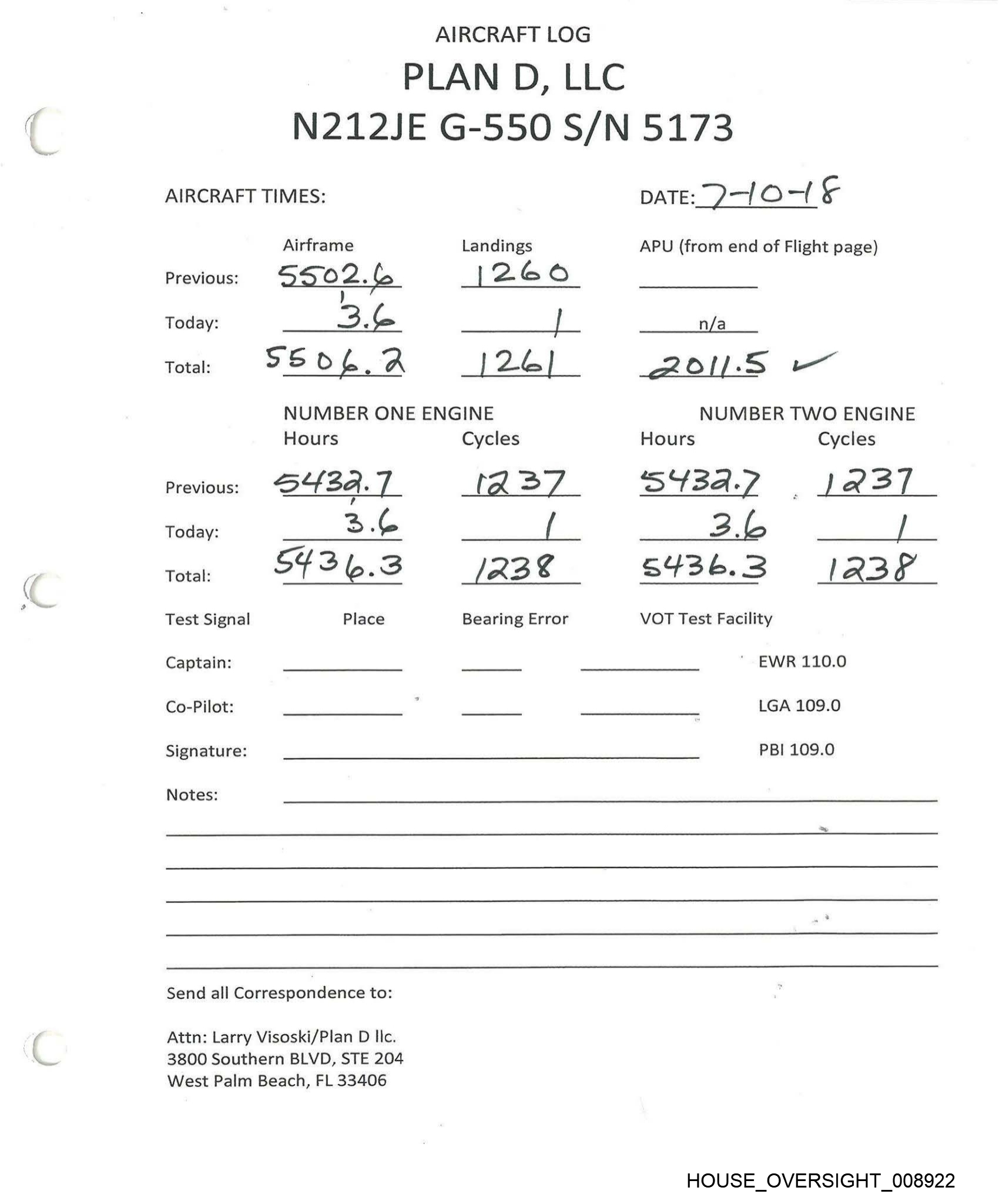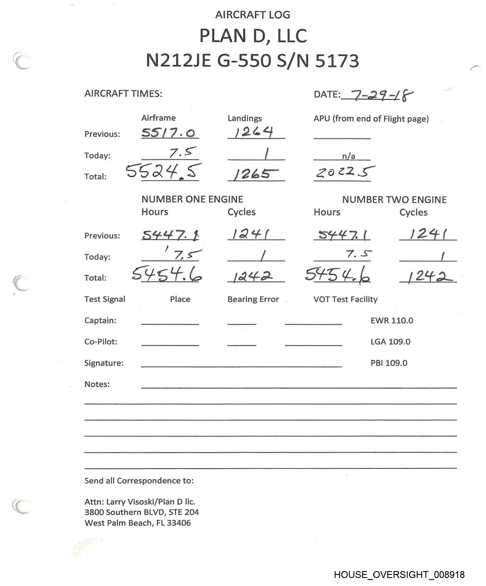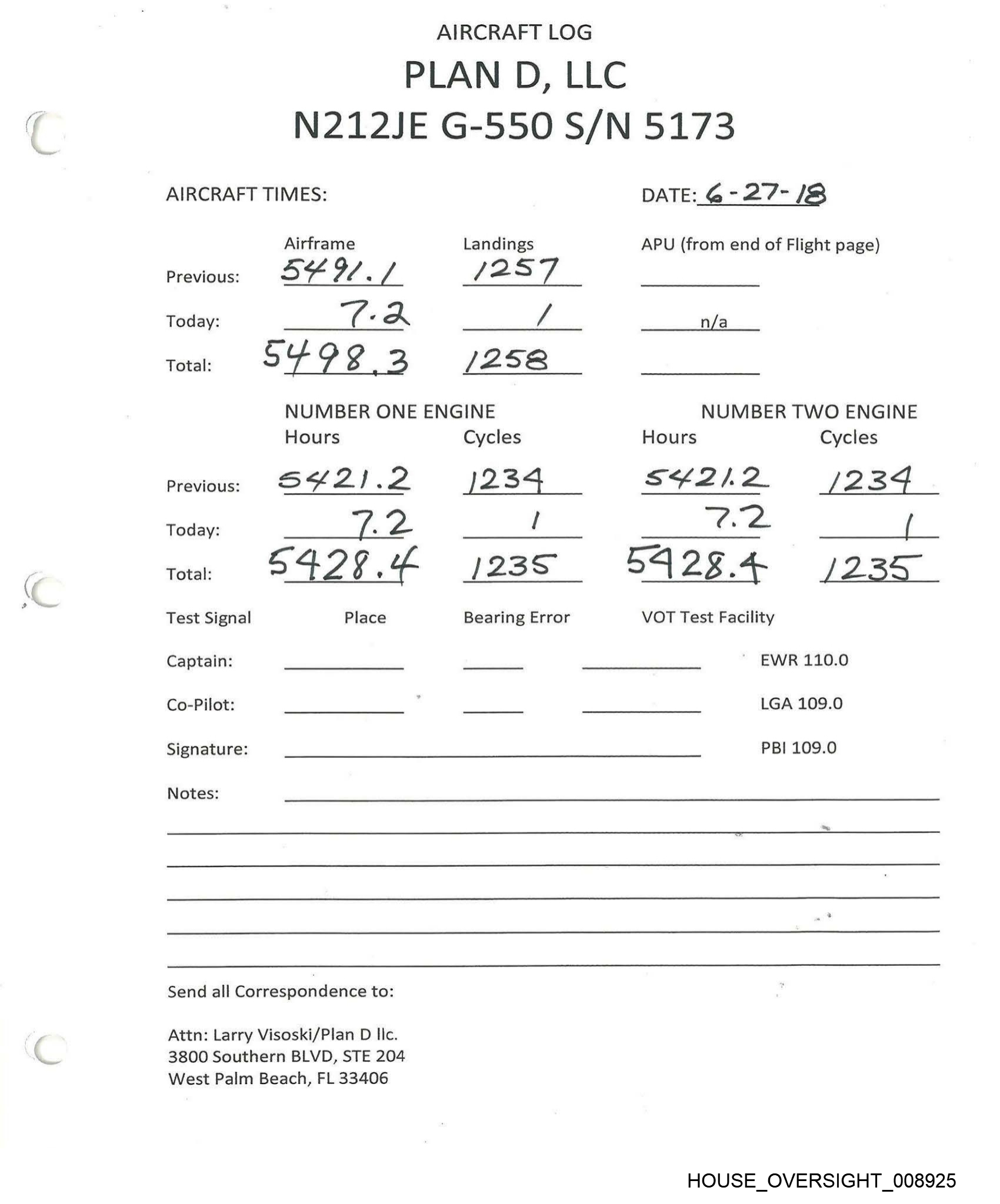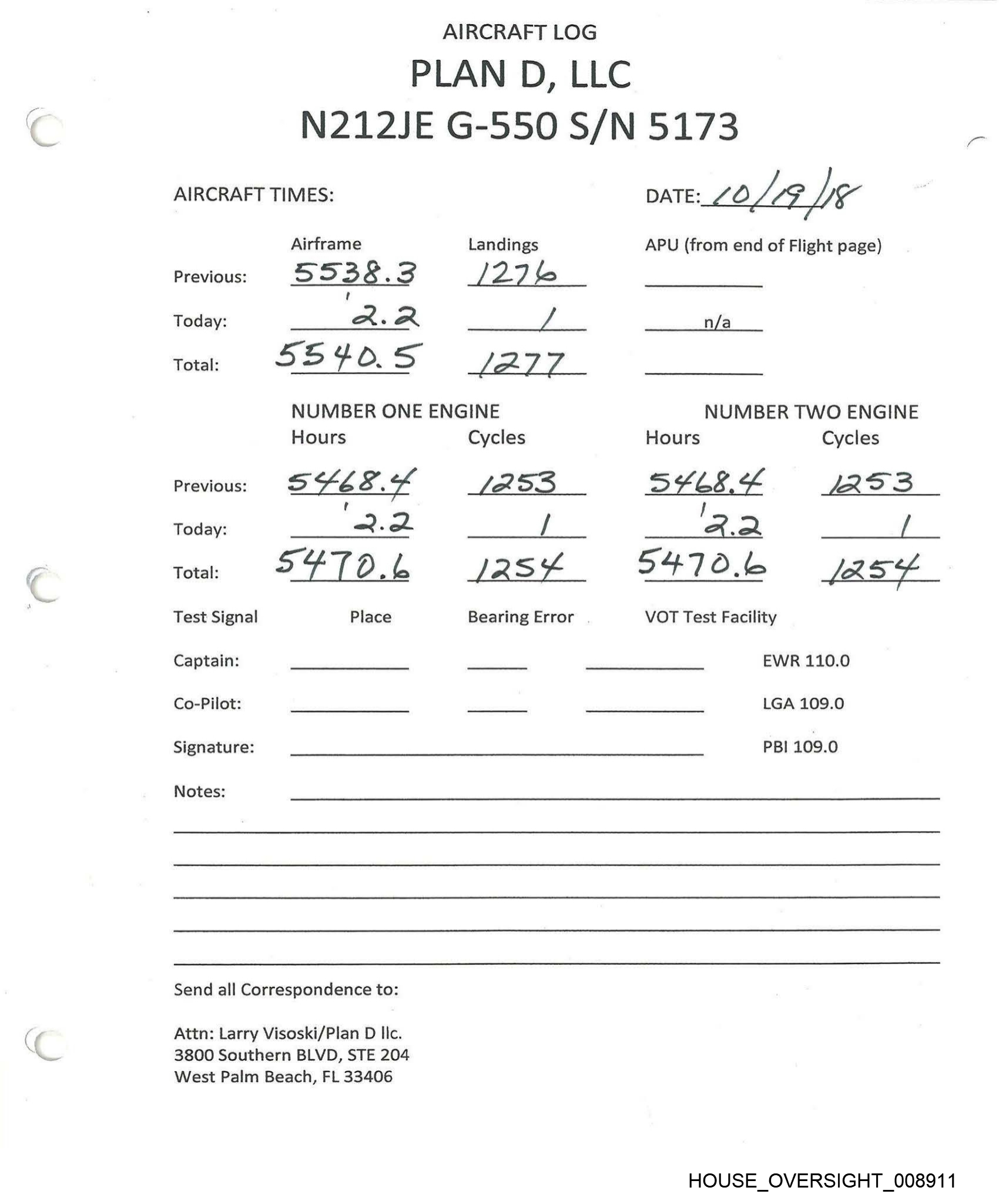 PLAN D, LLC AIRCRAFT LOG N212JE G-550 S/N 5173 AIRCRAFT TIMES: Airframe Landings Previous: SS 26.0 \ 2G | Today: “om he NUMBER ONE ENGINE Hours Cycles Previous: SY Sc. \ | 2.4 Today: 2 3 SUSE.Y Place Total: Test Signal Captain: Co-Pilot: Signature: Notes: Send all Correspondence to: Attn: Larry Visoski/Plan D llc. 3800 Southern BLVD, STE 204 West Palm Beach, FL 33406 \ A24us Bearing Error DATE: & log] IS APU (from end of Flight page) n/a 2.02.0 NUMBER TWO ENGINE Hours Cycles S4sbh) i249 — BS _ S4Ss6 4+ (24S VOT Test Facility EWR 110.0 LGA 109.0 PBI 109.0 HOUSE_OVERSIGHT_008915