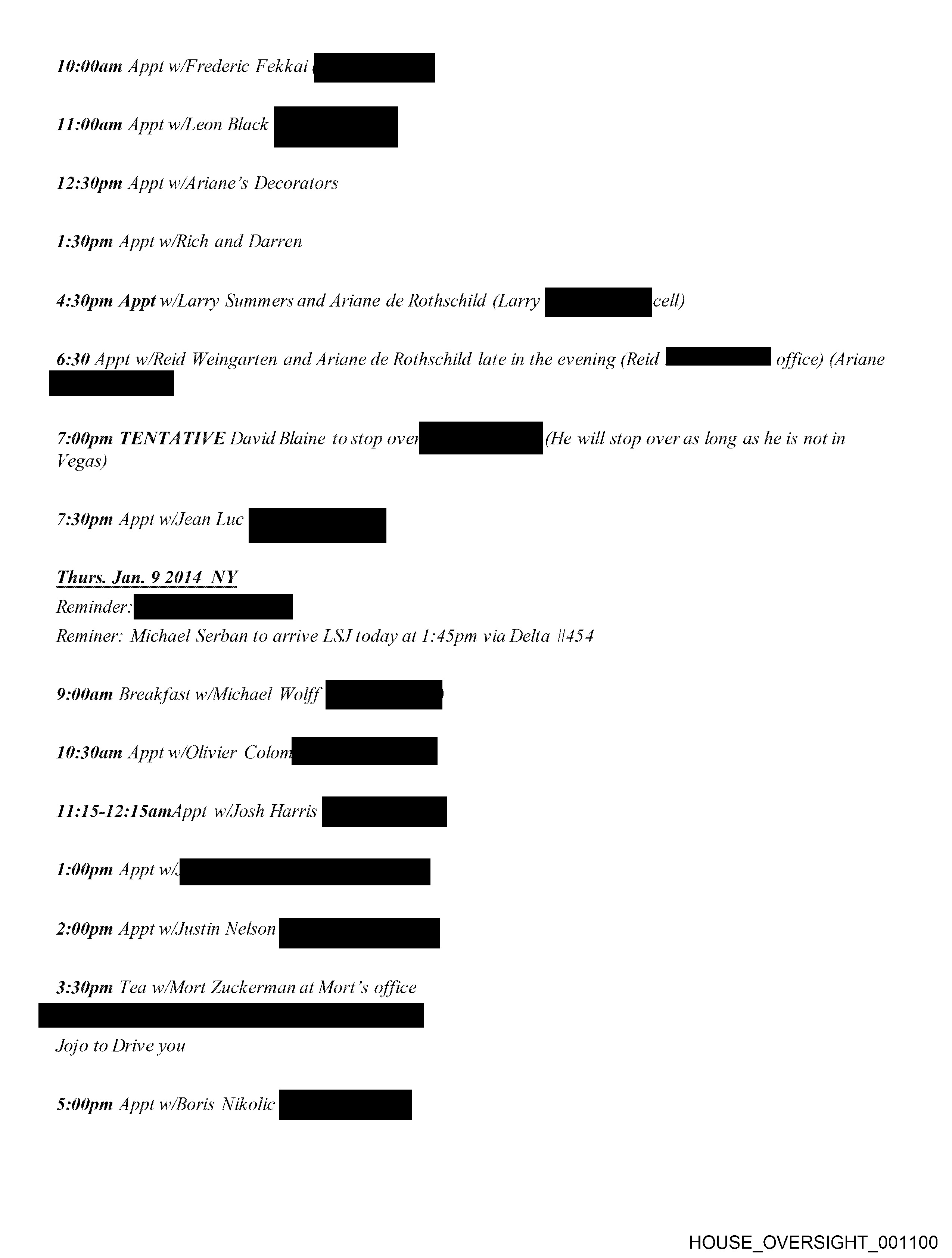 10:00am Appt w/Frederic Fekkai pO 11:00am Appt w/Leon Black a 12:30pm Appt w/Ariane’s Decorators 1:30pm Appt w/Rich and Darren 4:30pm Appt w/Larry Summers and Ariane de Rothschild (Larry pT ) 6:30 Appt w/Reid Weingarten and Ariane de Rothschild late in the evening (Reid pe office) (Ariane 7:00pm TENTATIVE David Blaine to stop vi— (He will stop over as long as he is notin Vegas) 7:30pm Appt wiJean Luc a Thurs. Jan. 9 2014 NY Reminer: Michael Serban to arrive LSJ today at 1:45pm via Delta i454 9:00am Breakfast w/Michael Wolff pS 10:30am Appt w/Olivier on _ 117:15-12:15amAppt w/Josh Harris pe 1:00pm Appt Oe 2:00pm Appt w/Justin Nelson ps 3:30pm Tea w/Mort Zuckerman at Mort’s office Jojo to Drive you 5:00pm Appt w/Boris Nikolic pe HOUSE_OVERSIGHT_001100