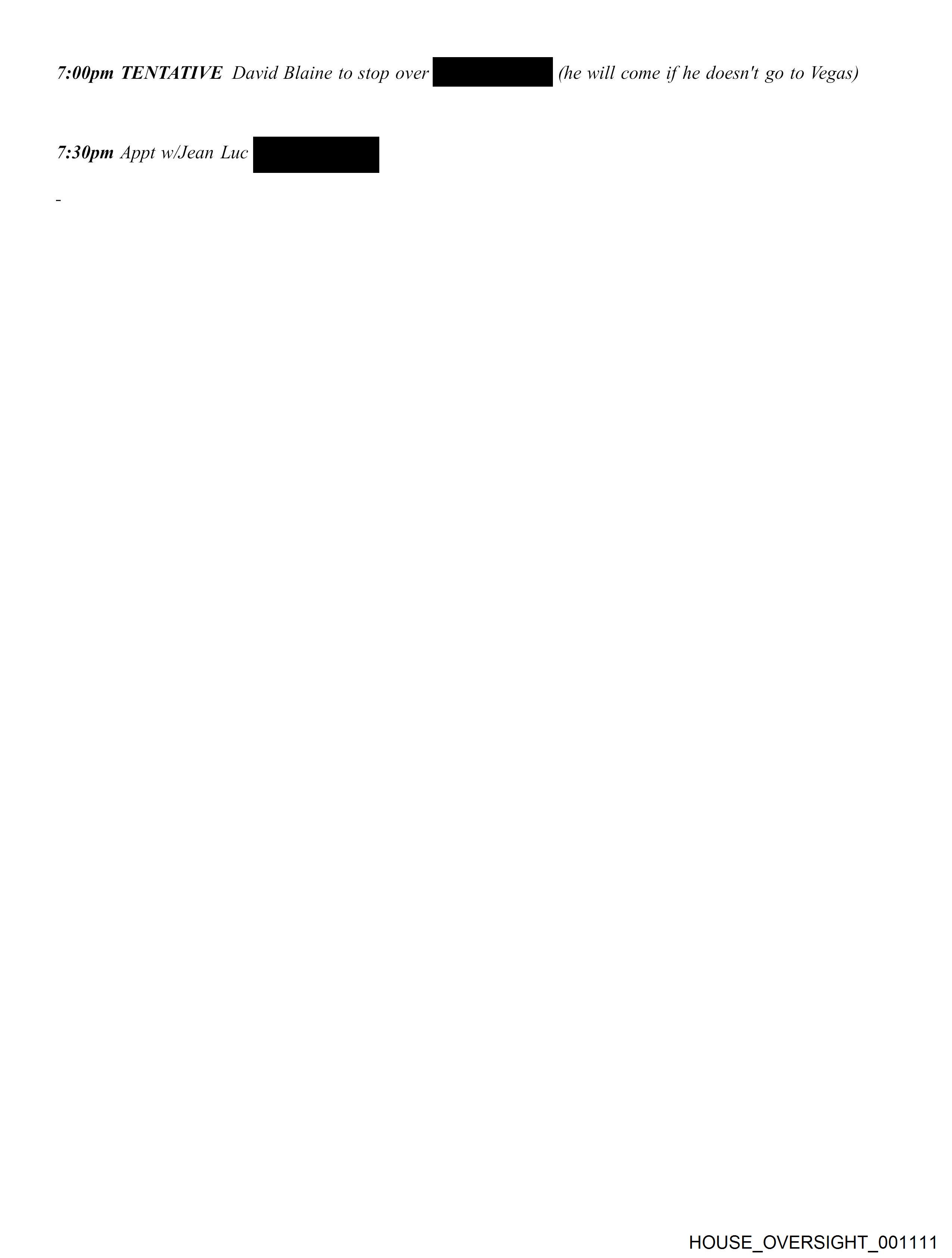7:00pm TENTATIVE David Blaine to stop vr ll (he will come if he doesn't go to Vegas) 7:30pm Appt w/Jean Luc ae HOUSE_OVERSIGHT_001111
