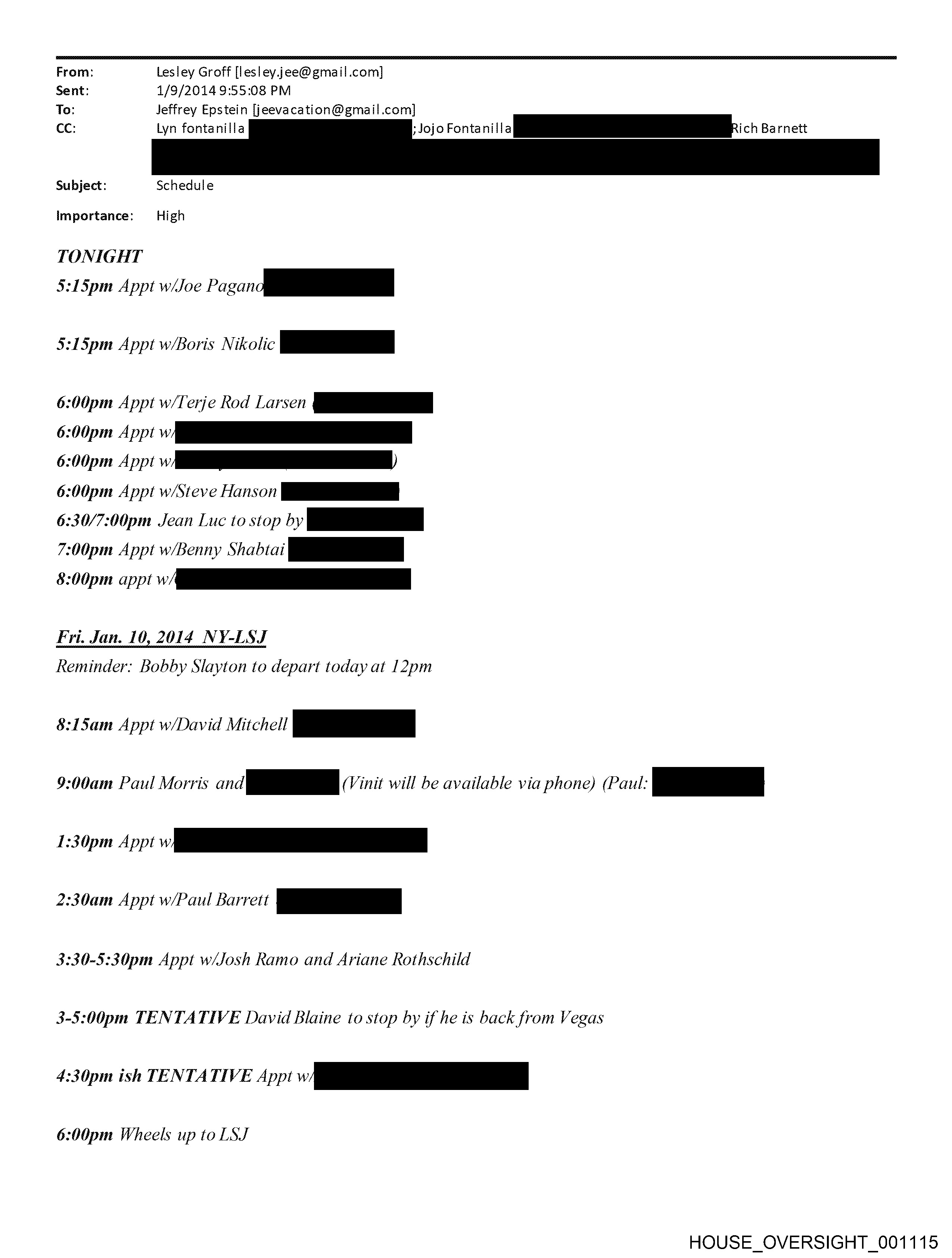 From: Lesley Groff [lesley.jee@ gmail.com] Sent: 1/9/2014 9:55:08 PM To: Jeffrey Epstein [jeevacation@gmail.com] cc: Lyn fontanilla s Jojo Fontani|/a[fiiiER: ch Barnett Subject: Schedule Importance: High TONIGHT 5:15pm Appt w/Joe Pagani 5:15pm Appt w/Boris Nikolic pe 6:00pm Appt w/Terje Rod Lane: Fi 6:00pm pp: v rrr 6:00pm Appt ms 6:00pm Appt w/Steve Hoo Ei 6:30/7:00pm Jean Luc to stop by pe 7:00pm Appt w/Benny Shabtai ae 8:00pm app vr Reminder: Bobby Slayton to depart today at 12pm 8:15am Appt w/David Mitchell pe 9:00am Paul Morris and pe (Vinit will be available via phone) (Paul: a 130pn Jp _—_— 2:30am Appt w/Paul Barrett po 3:30-5:30pm Appt w/Josh Ramo and Ariane Rothschild 3-5:00pm TENTATIVE David Blaine to stop by if he is back from Vegas 4:30pm ish TENTATIVE Appt 1 6:00pm Wheels up to LSJ HOUSE_OVERSIGHT_001115