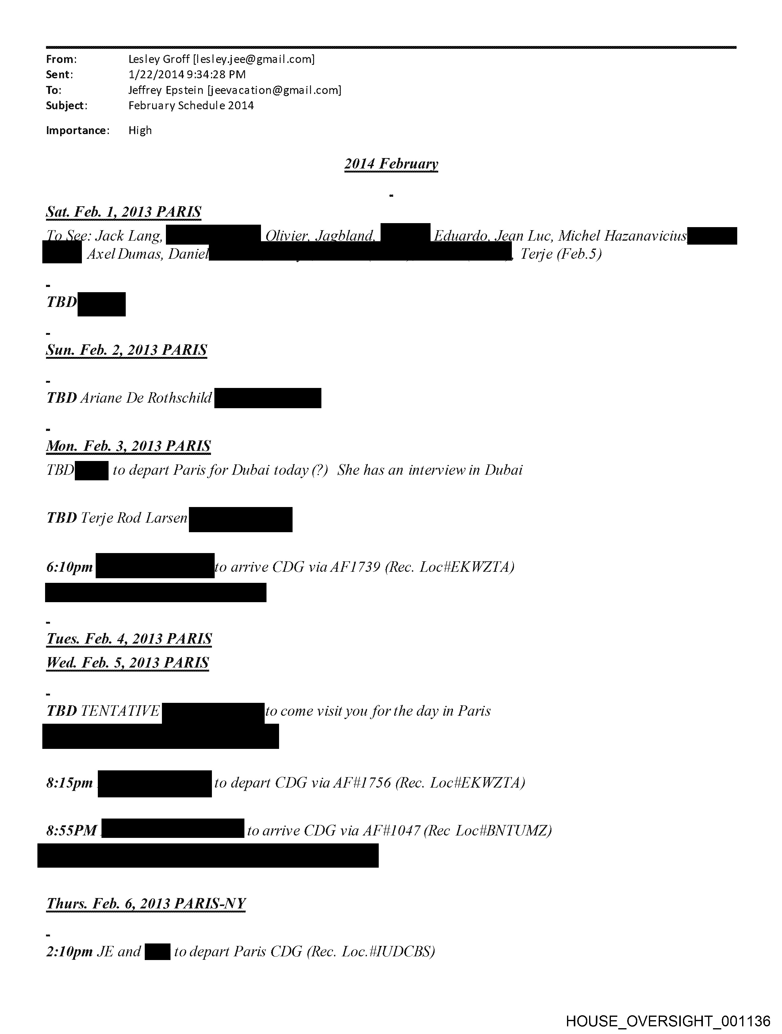From: Lesley Groff [lesley.jee@ gmail.com] Sent: 1/22/2014 9:34:28 PM To: Jeffrey Epstein [jeevacation@gmail.com] Subject: February Schedule 2014 Importance: High : Jack Lang, Axel Dumas, Danie Sun. Feb. 2, 2013 PARIS TBD Ariane De Rothschild Be Mon. Feb. 3, 2013 PARIS roo to depart Paris for Dubai today (7?) She has an interview in Dubai TBD Terje Rod el L_—_ 6:10pm ae arrive CDG via AF'1739 (Rec. Loc#EK WZTA) Tues. Feb. 4, 2013 PARIS Wed. Feb. 5, 2013 PARIS TBD TENTATIVE to come visit you for the day in Paris 8:15pm ee to depart CDG via AF #1756 (Rec. LocHE KWZTA) 8:55PM Po to arrive CDG via AF#I047 (Rec LocHBNTUMZ) Thurs. Feb. 6, 2013 PARIS-NY 2:10pm JE and ¥@ to depart Paris CDG (Rec. Loc.HIUDCBS) Eduardo, Jean Luc, Michel Hazanavici iiii/ Terje (Feb.5) HOUSE_OVERSIGHT_001136