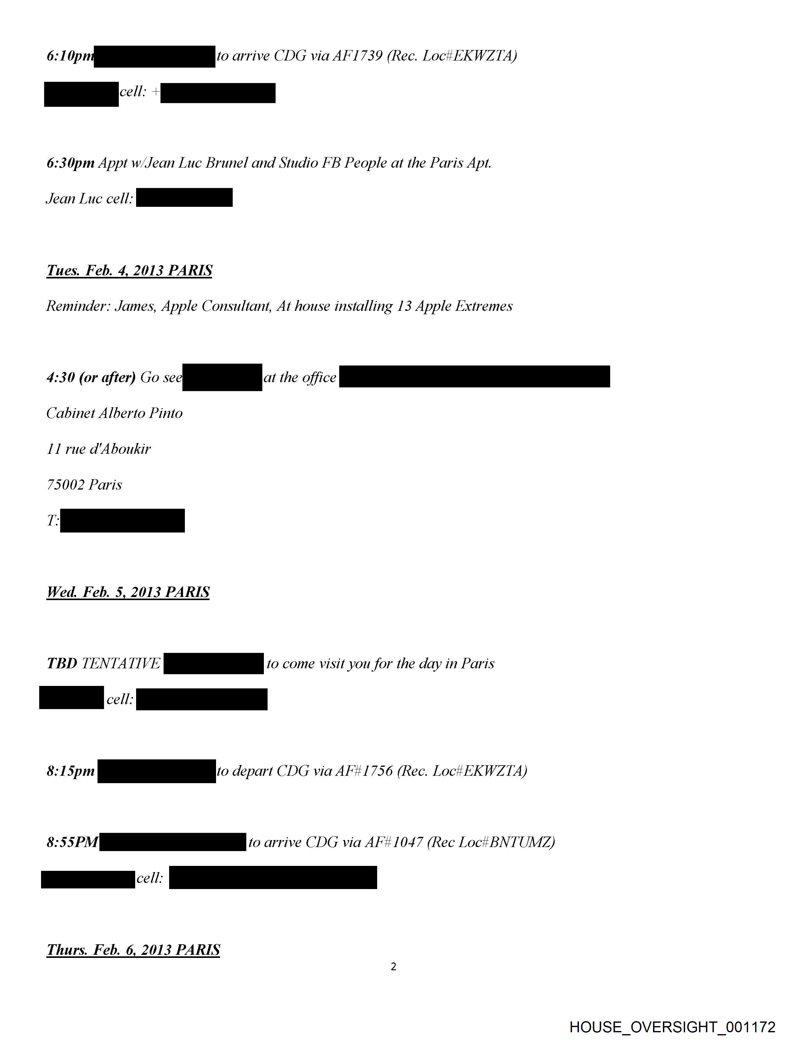 6:1 Tt té<‘<s«é‘« arrive CDG via AF'1739 (Rec. Loc#H EKWZTA) 6:30pm Appt w/Jean Luc Brunel and Studio FB People at the Paris Apt. Jean Luc cell: pe Tues. Feb. 4, 2013 PARIS Reminder: James, Apple Consultant, At house installing 13 Apple Extremes Cabinet Alberto Pinto 11 rue d'Aboukir 75002 Paris Wed. Feb. 5, 2013 PARIS TBD TENTATIVE a to come visit you for the day in Paris 8:15pm ae depart CDG via AF #1756 (Rec. Lock EKWZTA) 8:55PM a 0. arrive CDG via AF#1047 (Rec Loc! BNTUMZ) ee: Thurs. Feb. 6, 2013 PARIS HOUSE_OVERSIGHT_001172