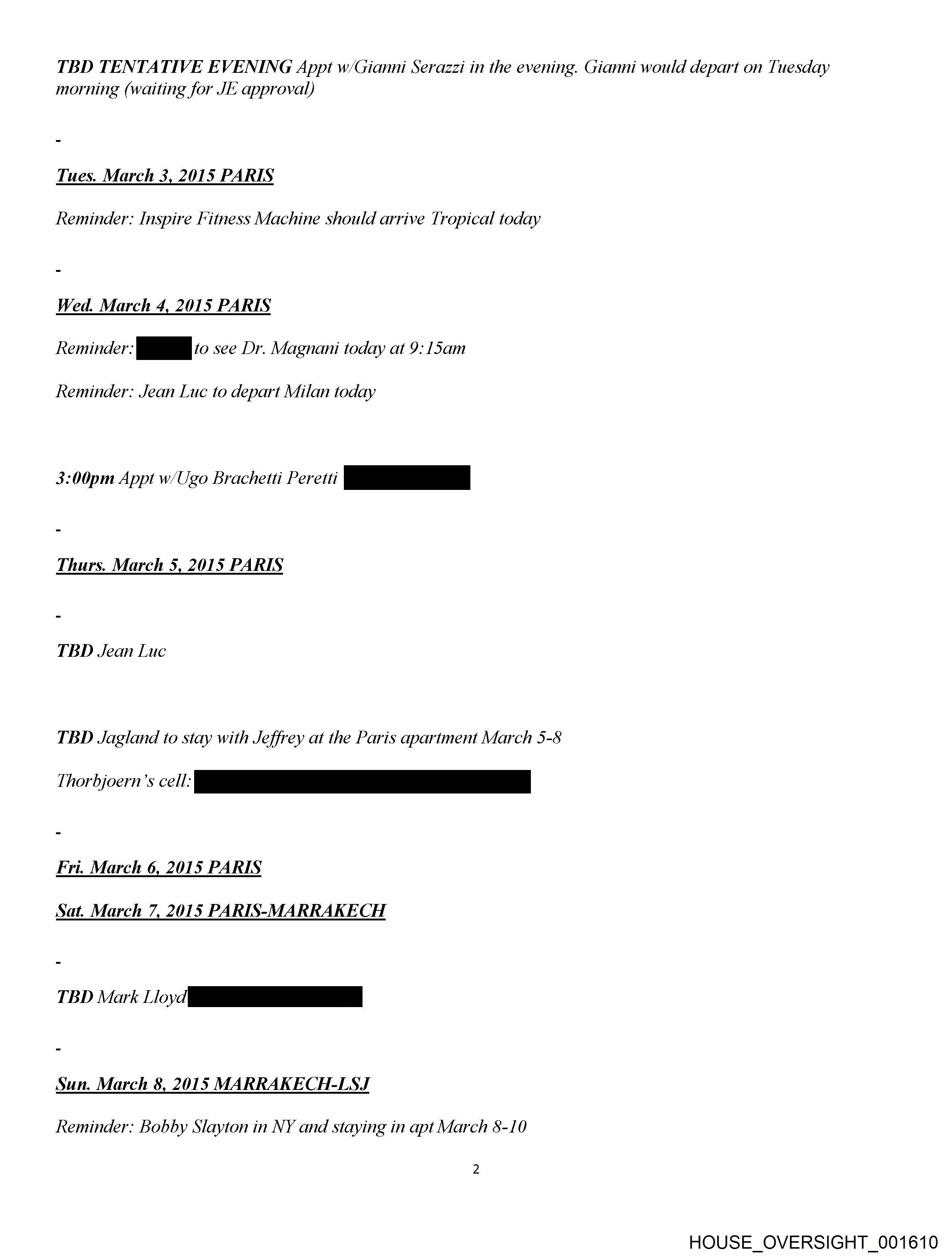 TBD TENTATIVE EVENING Appt w/Gianni Serazzi in the evening. Gianni would depart on Tuesday morning (waiting for JE approval) Tues. March 3, 2015 PARIS Reminder: Inspire Fitness Machine should arrive Tropical today Wed. March 4, 2015 PARIS Reminder: a to see Dr. Magnani today at 9:15am Reminder: Jean Luc to depart Milan today 3:00pm Appt w/Ugo Brachetti Peretti Be Thurs. March 5, 2015 PARIS TBD Jean Luc TBD Jagland to stay with Jeffrey at the Paris apartment March 5-8 Fri. March 6, 2015 PARIS Sat. March 7, 2015 PARIS-MARRAKECH TR ork ii Sun. March 8, 2015 MARRAKECH-LSJ Reminder: Bobby Slayton in NY and staying in apt March 8-10 2 HOUSE_OVERSIGHT_001610