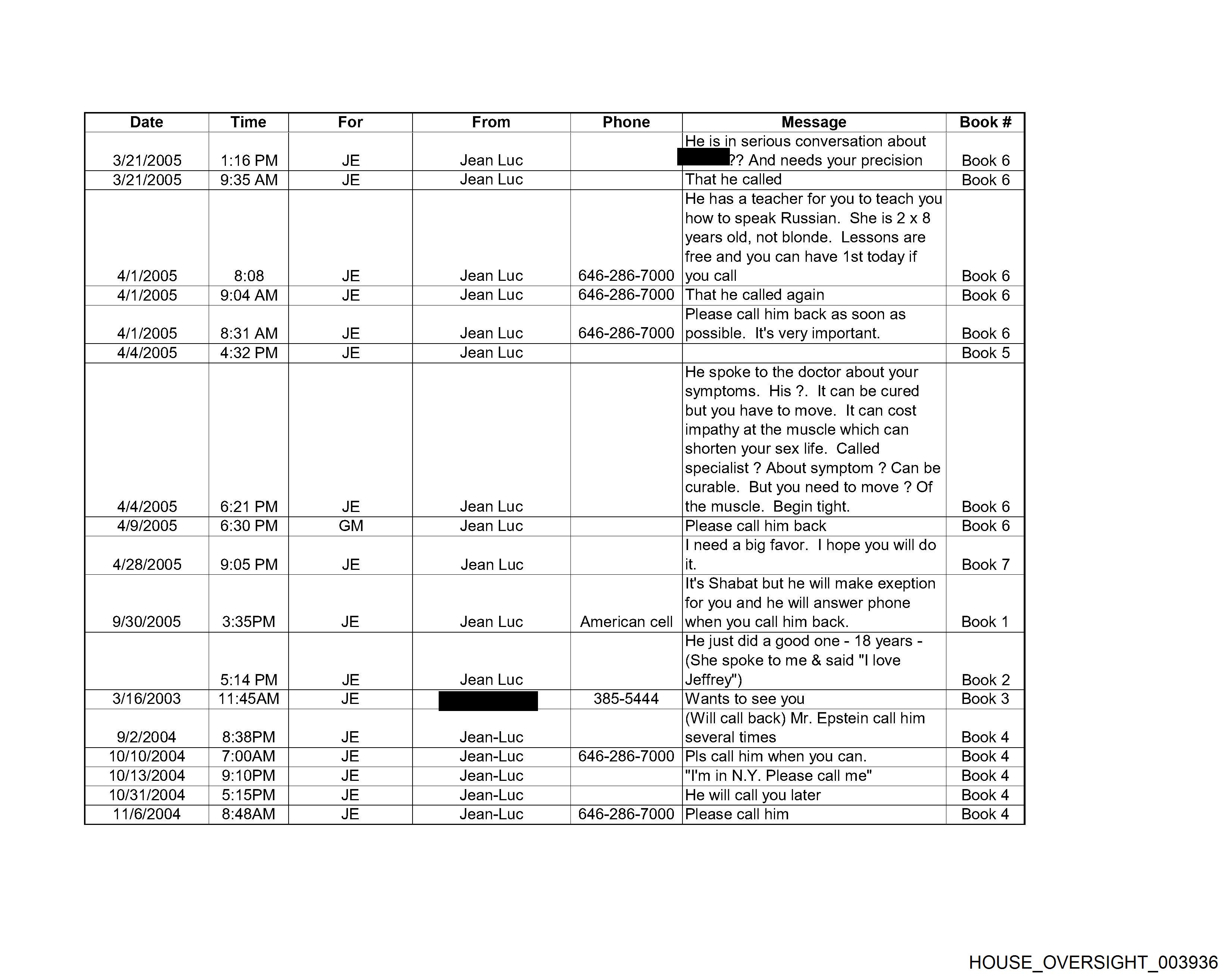 Date From Message 3/21/2005 Jean Luc He is in serious conversation about 3/21/2005 | 9:35 AM 4/1/2005 Jean Luc ?? And needs your precision He has a teacher for you to teach you how to speak Russian. She is 2 x 8 years old, not blonde. Lessons are free and you can have ‘st today if 646-286-7000 |you call That he called Book 6 4/1/2005 Jean Luc 646-286-7000 | That he called again 4/1/2005 4/4/2005 | 4:32 PM He spoke to the doctor about your symptoms. His ?. It can be cured but you have to move. It can cost impathy at the muscle which can shorten your sex life. Called specialist ? About symptom ? Can be curable. But you need to move ? Of a Jean Luc the muscle. Begin tight. Jean Luc 4/4/2005 4/9/2005 Jean Luc Please call him back as soon as 646-286-7000 |possible. It's very important. Please call him back Book 5 4/28/2005 JE Jean Luc | need a big favor. | hope you will do it. 9/30/2005 3/16/2003 11:45AM 9/2/2004 8:38PM JE 10/10/2004 JE Jean Luc He just did a good one - 18 years - (She spoke to me & said "I love 5:14 PM = — Luc Jeffrey") Wants to see you (Will call back) Mr. Epstein call him several times 646-286-7000 |Pls call him when you can. Jean-Luc Jean-Luc It's Shabat but he will make exeption for you and he will answer phone American cell |when you call him back. 385-5444 10/13/2004 JE Jean-Luc “I'm in N.Y. Please call me" 10/31/2004 JE Jean-Luc He will call you later 11/6/2004 8:48AM Jean-Luc 646-286-7000 |Please call him Book 4 HO