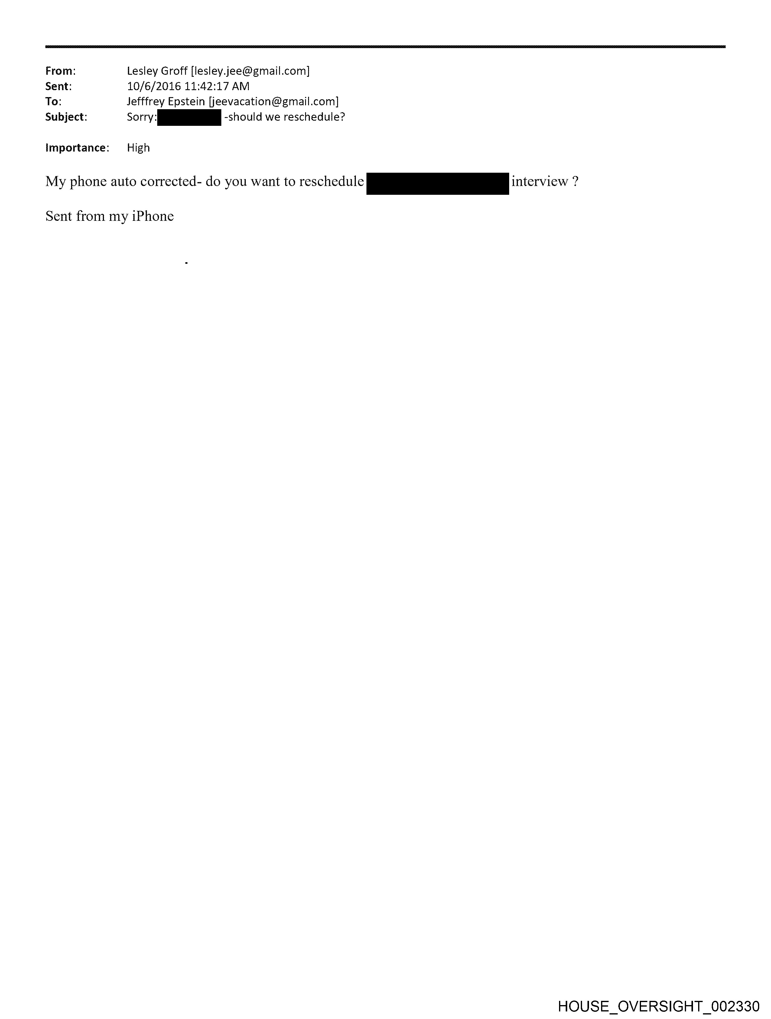 From: Lesley Groff [lesley.jee@gmail.com] Sent: 10/6/2016 11:42:17 AM To: Jefffrey Epstein [jeevacation@gmail.com] Subject: cory ii -should we reschedule? Importance: High My phone auto corrected- do you want to reschedule pe interview ? Sent from my iPhone HOUSE_OVERSIGHT_002330