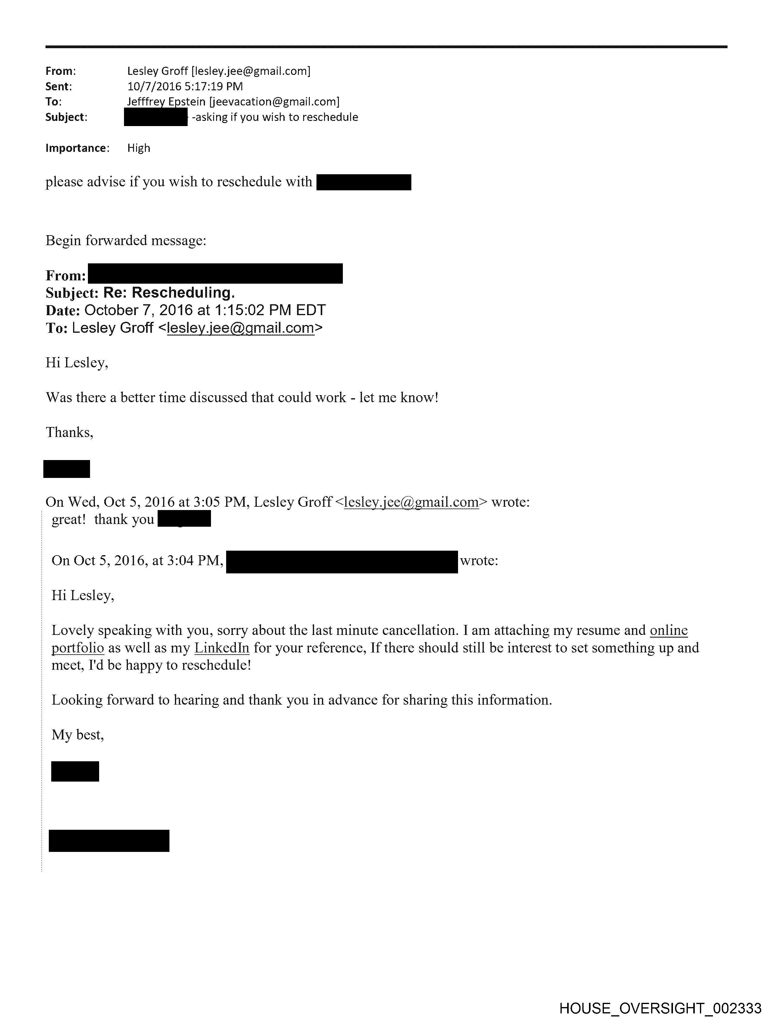 From: Lesley Groff [lesley.jee@gmail.com] Sent: 10/7/2016 5:17:19 PM To: Jefffrey Epstein [jeevacation@gmail.com] Subject: | -asking if you wish to reschedule Importance: High please advise if you wish to reschedule with qa Begin forwarded message: From: Subject: Re: Rescheduling. Date: October 7, 2016 at 1:15:02 PM EDT To: Lesley Groff <lesiey jee@aqmail.com> Hi Lesley, Was there a better time discussed that could work - let me know! Thanks, On Wed, Oct 5, 2016 at 3:05 PM, Lesley Groff <lesley.jce@gmail.com> wrote: _ great! thank you On Oct 5, 2016, at 3:04 PM, ee 0c: Hi Lesley, Lovely speaking with you, sorry about the last minute cancellation. | am attaching my resume and online _ portfolio as well as my LinkedIn for your reference, If there should still be interest to set something up and _ meet, I'd be happy to reschedule! Looking forward to hearing and thank you in advance for sharing this information. My best, HOUSE_OVERSIGHT_002333