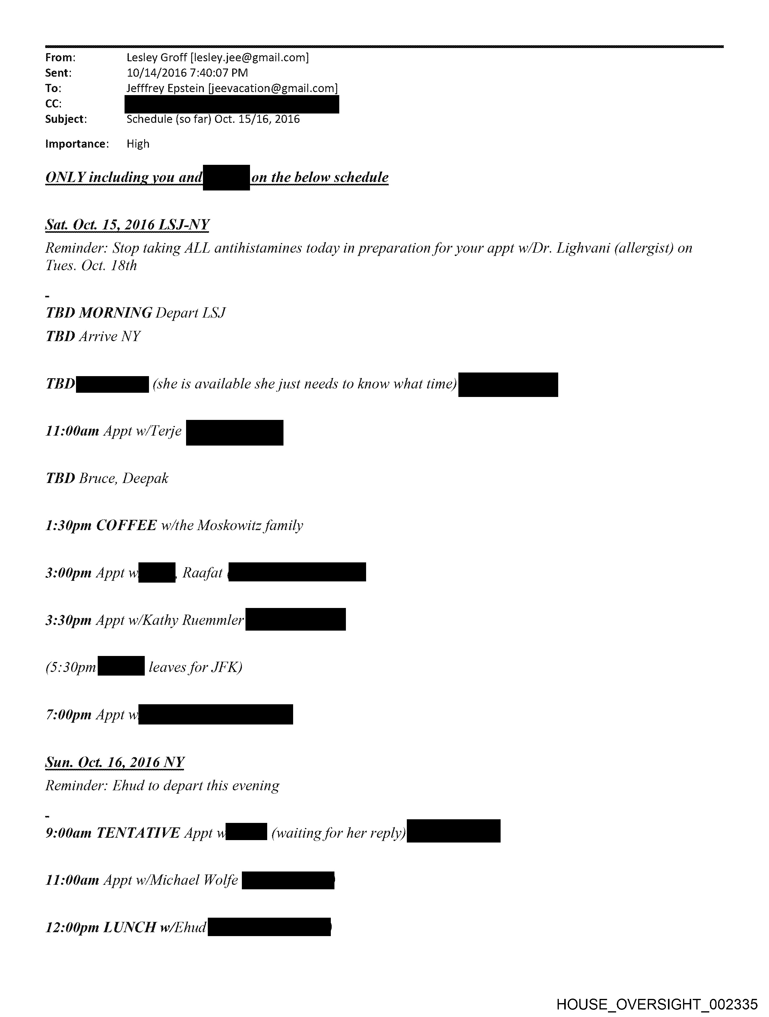 From: Lesley Groff [lesley.jee@gmail.com] Sent: 10/14/2016 7:40:07 PM To: Jefffrey Epstein [jeevacation@gmail.com] Cc: Subject: Schedule (so far) Oct. 15/16, 2016 Importance: High ONLY including y Reminder: Stop taking ALL antihistamines today in preparation for your appt w/Dr. Lighvani (allergist) on Tues. Oct. 18th TBD MORNING Depart LSJ TBD Arrive NY TBD RRR (se is available she just needs to know what mn _—_——_—_- 11:00am Appt w/Terje pe TBD Bruce, Deepak 1:30pm COFFEE w/the Moskowitz family 3:00pm Appt viii Raafat pO 3:30pm Appt w/Kathy rei’ ———— (5:30 = leaves for JFK) ‘pm (pp Sun. Oct. 16, 2016 NY Reminder: Ehud to depart this evening 9:00am TENTATIVE Appt iii (waiting for her mpl 11:00am Appt w/Michael Wolfe a 12:00pm LUNCH 0/ En ee HOUSE _OVERSIGHT_002335