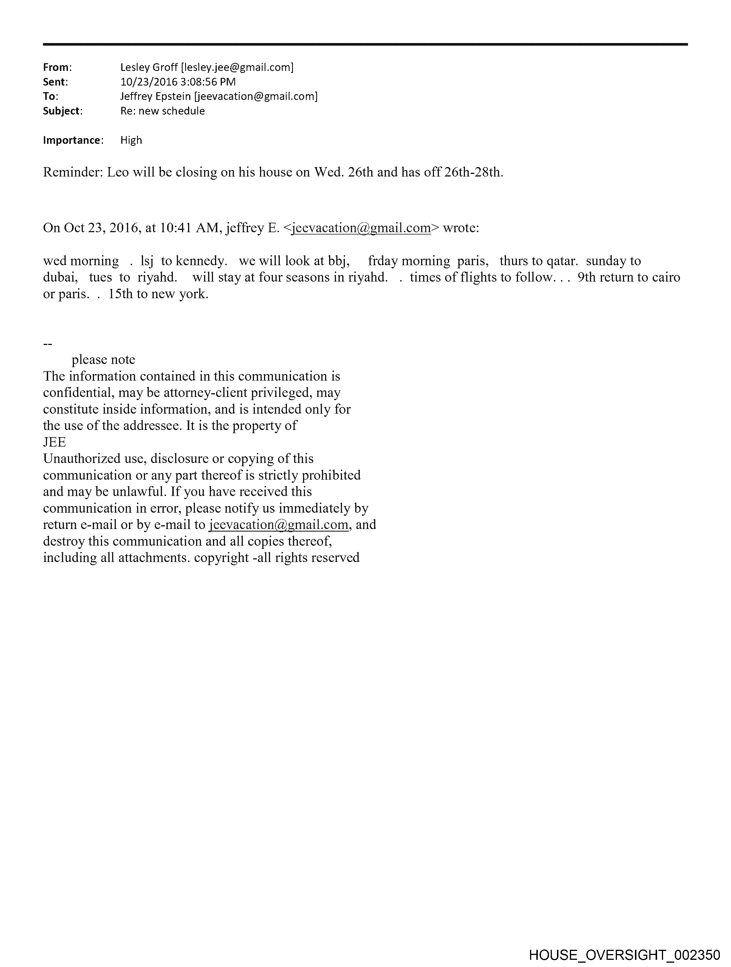 From: Lesley Groff [lesley.jee@gmail.com] Sent: 10/23/2016 3:08:56 PM To: Jeffrey Epstein [jeevacation@gmail.com] Subject: Re: new schedule Importance: High Reminder: Leo will be closing on his house on Wed. 26th and has off 26th-28th. On Oct 23, 2016, at 10:41 AM, jeffrey E. <jeevacation(@® mail.com> wrote: wed morning . lsj tokennedy. we will look at bbj, frday moming paris, thurs to qatar. sunday to dubai, tues to riyahd. will stay at four seasons inriyahd. . times of flights to follow. .. 9th return to cairo or paris. . 15th to new york. please note The information contained in this communication is confidential, may be attorney-client privileged, may constitute inside information, and is intended only for the use of the addressee. It 1s the property of JEE Unauthorized use, disclosure or copying of this communication or any part thereof is strictly prohibited and may be unlawful. If you have received this communication in error, please notify us immediately by return e-mail or by e-mail to jeevacation@gmail.com, and destroy this communication and all copies thereof, including all attachments. copyright -all rights reserved HOUSE_OVERSIGHT_002350