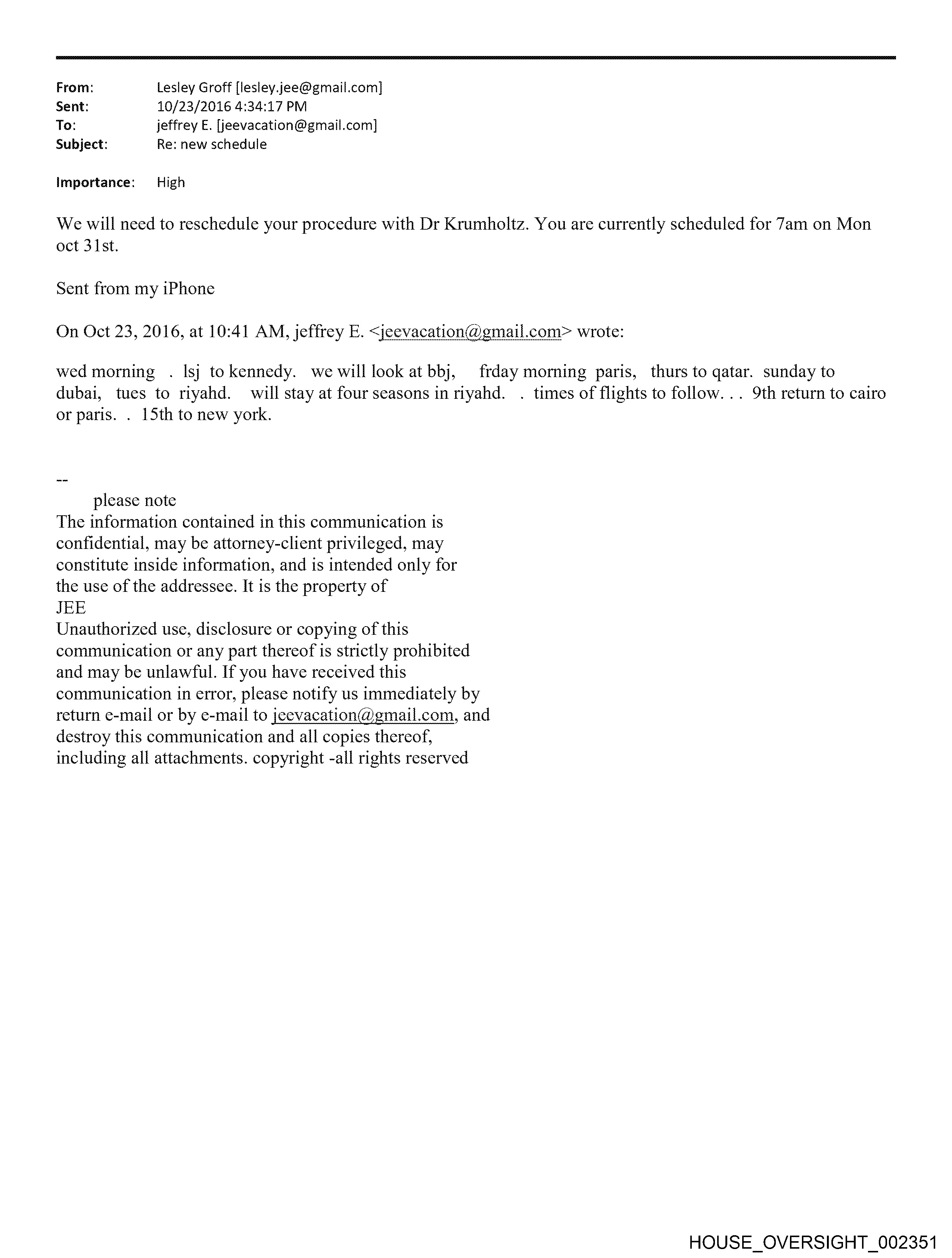 From: Lesley Groff [lesley.jee@gmail.com] Sent: 10/23/2016 4:34:17 PM To: jeffrey E. [jeevacation@gmail.com] Subject: Re: new schedule Importance: High We will need to reschedule your procedure with Dr Krumholtz. You are currently scheduled for 7am on Mon oct 31st. Sent from my iPhone wed morning . lsj tokennedy. we will look at bbj, frday moming paris, thurs to qatar. sunday to dubai, tues to riyahd. will stay at four seasons inriyahd. . times of flights to follow... 9th return to cairo or paris. . 15th to new york. please note The information contained in this communication is confidential, may be attorney-client privileged, may constitute inside information, and is intended only for the use of the addressee. It 1s the property of JEE Unauthorized use, disclosure or copying of this communication or any part thereof is strictly prohibited and may be unlawful. If you have received this communication in error, please notify us immediately by return e-mail or by e-mail to jeevacation@gmail.com, and destroy this communication and all copies thereof, including all attachments. copyright -all rights reserved HOUSE_OVERSIGHT_002351