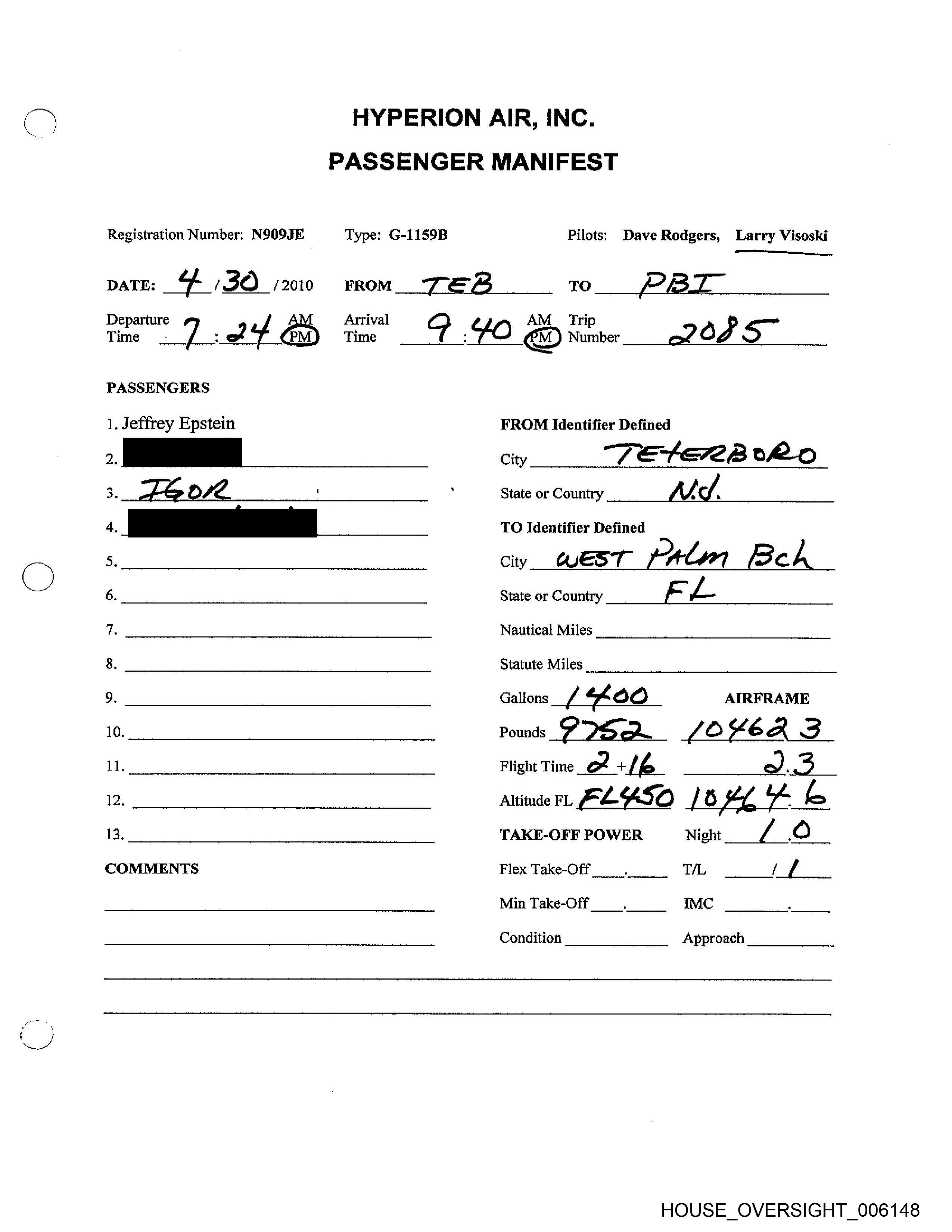 Registration Number: N909JE Type: G-1159B Pilots; Dave Rodgers, ‘ferry"*vevkee