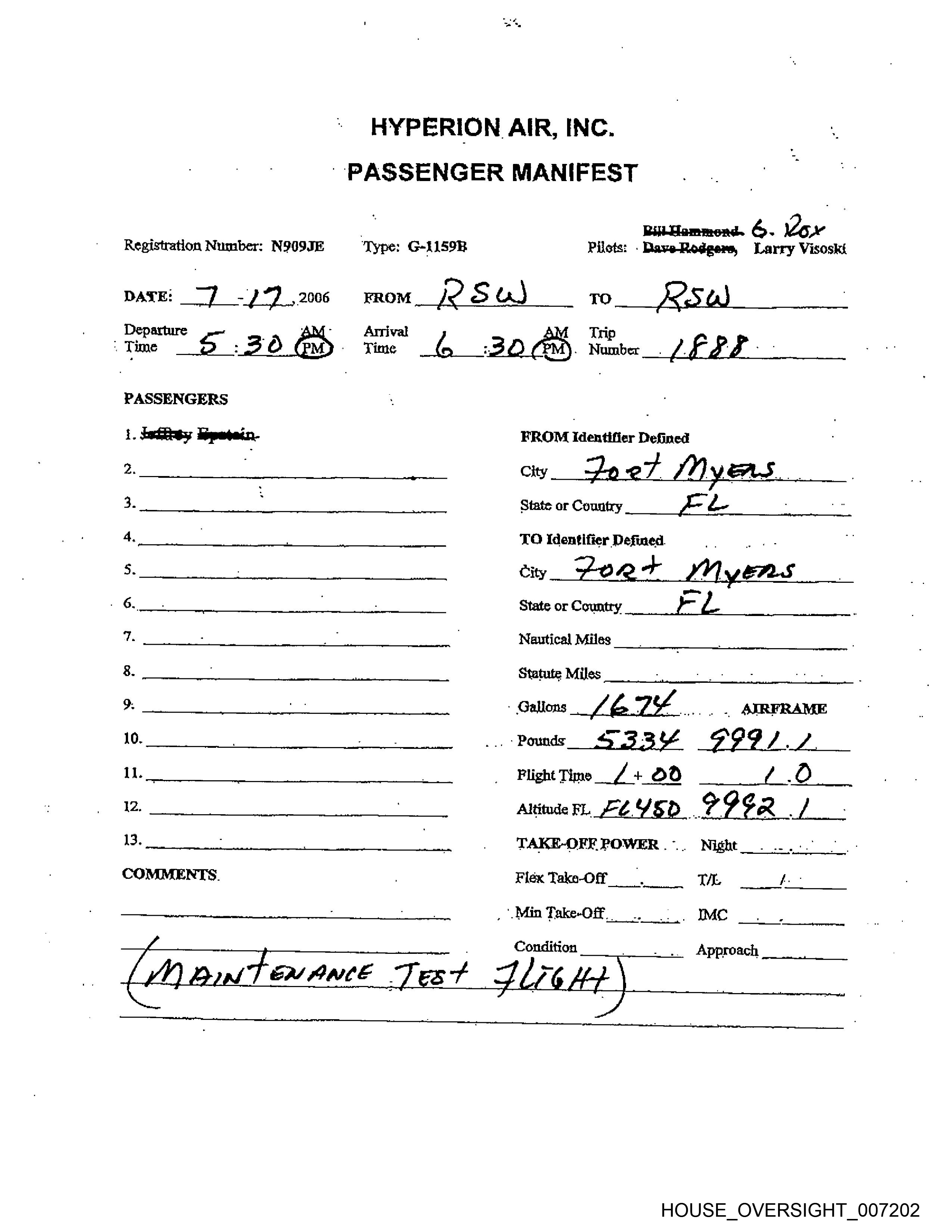 oan ll sd AO. hup Fatih id Lith rele @ULeHdaelil Pp.2 HYPERION AIR, INC. PASSENGER MANIFEST Bili Hammond Registration Number: NSO9JE . ‘Type: G-1159B =. ' Pilots: Daye Rodgers, Larry Visoski DATE: 2 - 2006 FROM (¢¢ TO. 7 / fF Departure ap Arrival A Trip Time ox? : 3 S pm Time { : Zf , Number lex bs ou PASSENGERS 1. Jeffrey Epstein ” FROM Identifier Defined 2, City C /eve / o>” Se. 3, frwOow?s Eww 7a Dod. State or Country oe 4 /O TO Identifier Defined | 4. 5. City S 7: 7 Ao n- A 5 “ 6. . State or Country Lacs i’ f ts . Nautical Miles / 2 ls 8. Statute Miles 2 [ 9? 7 eo 9. Gallons {EOD AIRFRAME 10. Pounds “3 232. 2925 4 il. |. Flight Time <5 IS 3 Aan (2 | Altitude FL Yo 7 7? 3 oe _ 13. | ot | TAKE-OFF POWER, Night. COMMENTS sot : FlexTake-Off_ TH AIA Min Take-Off. Ss Condition Approach HOUSE_OVERSIGHT_007176