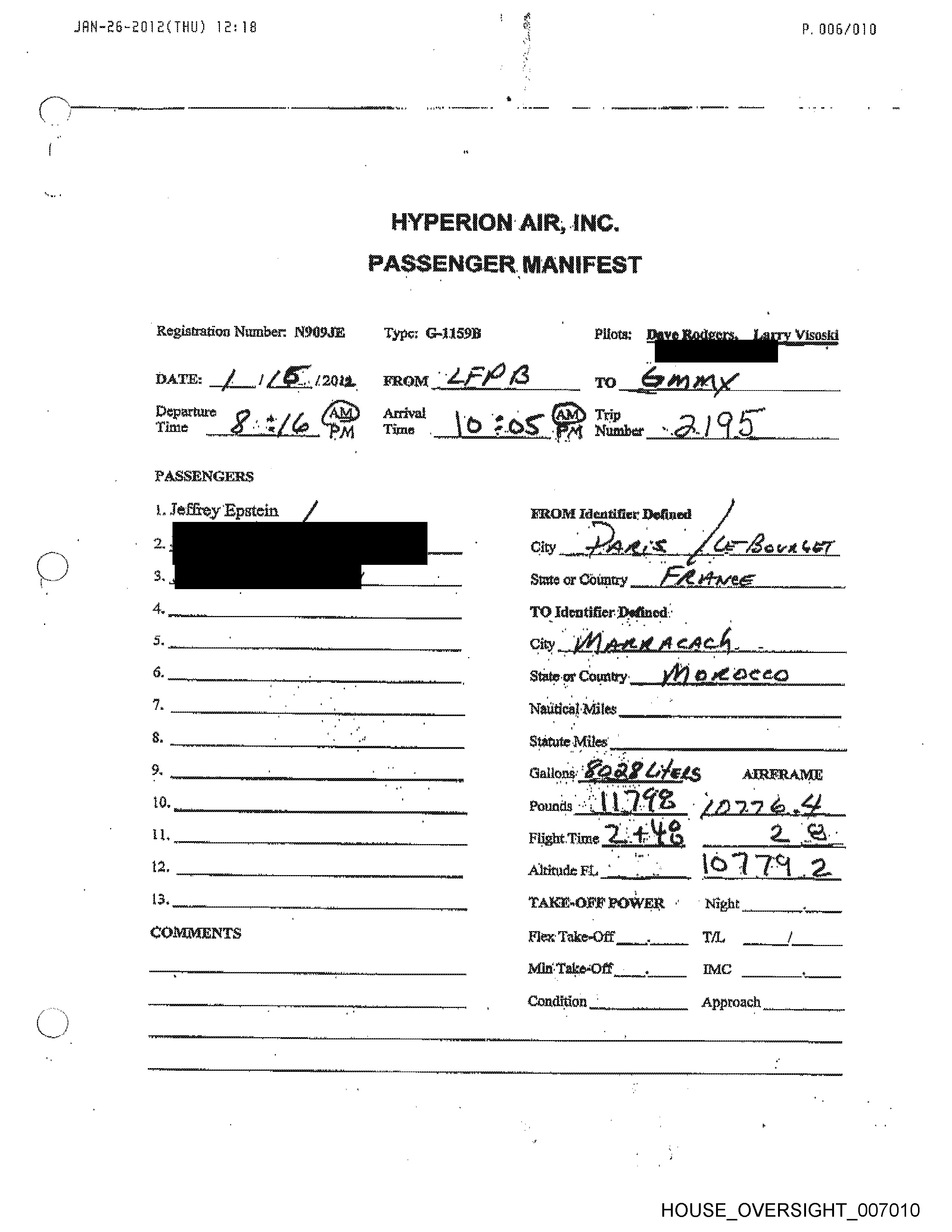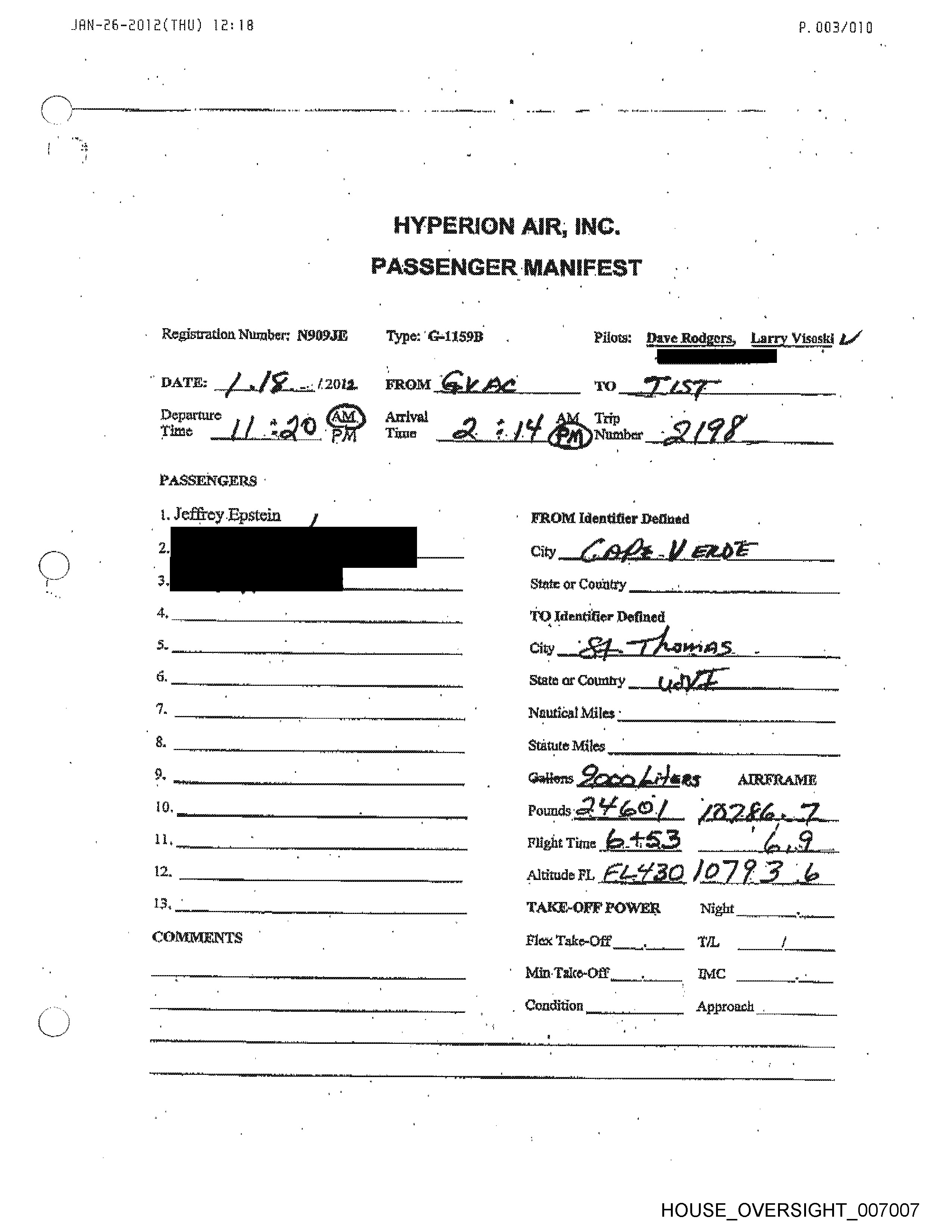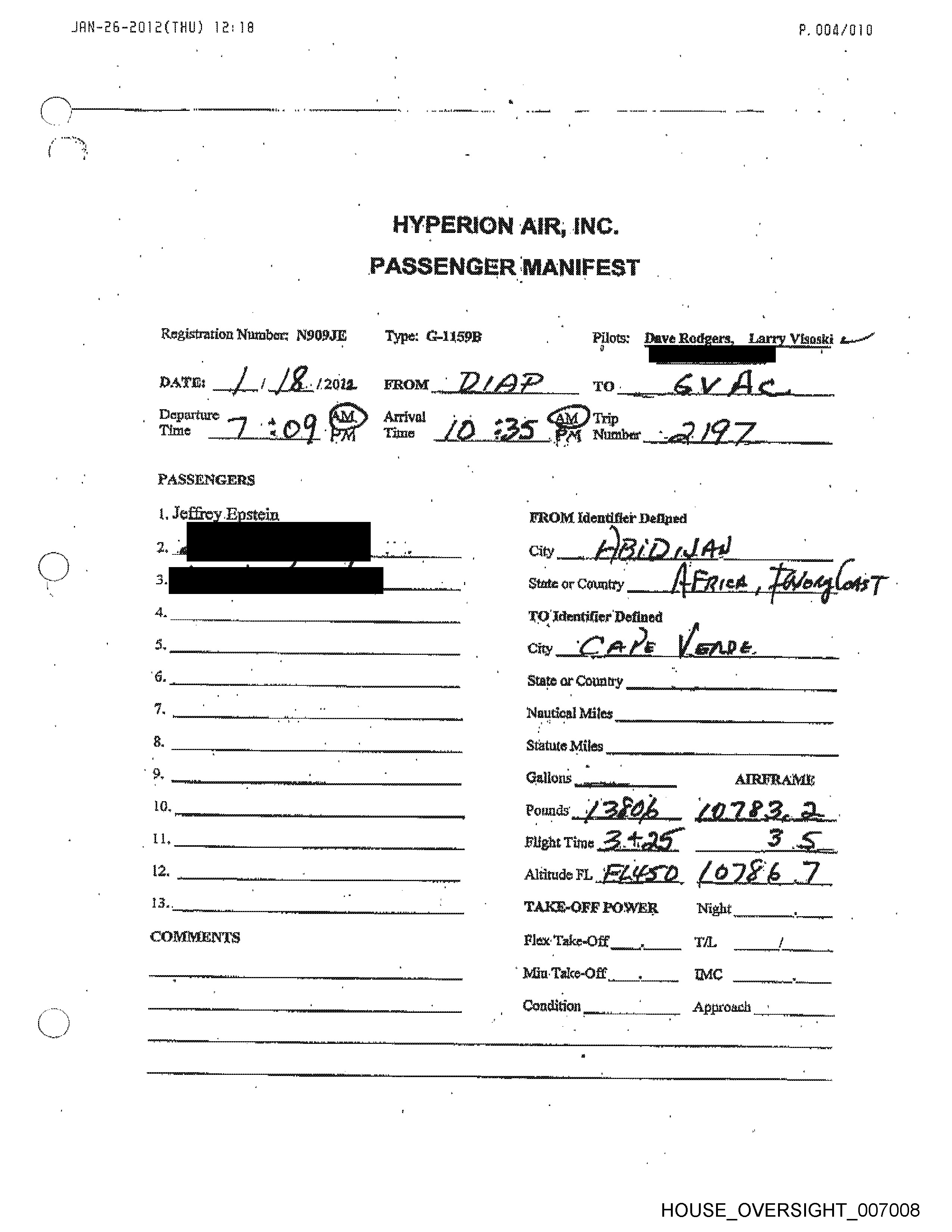 Passenger 1: Jeffrey Epstein