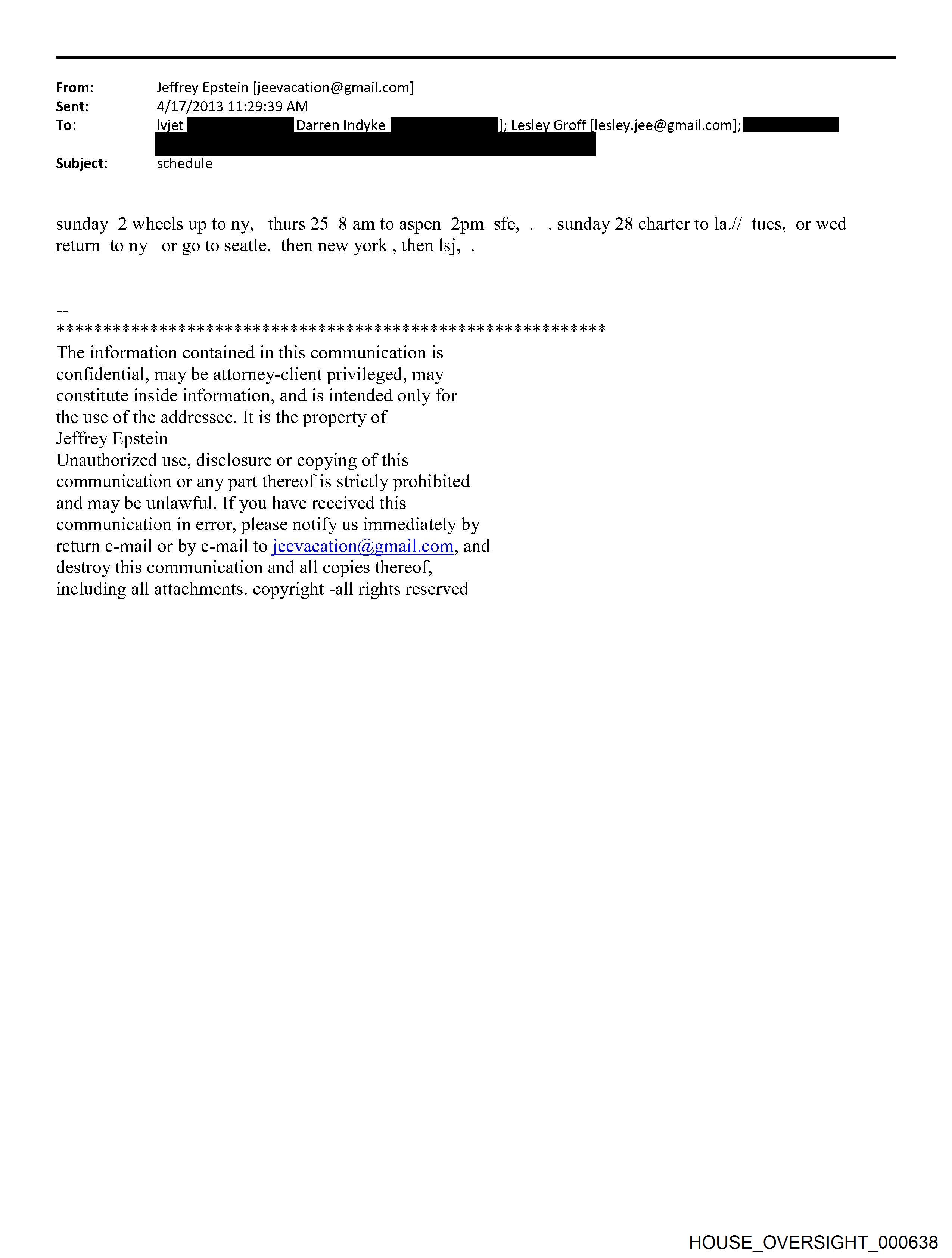 From: Jeffrey Epstein [jeevacation@gmail.com] Sent: 4/17/2013 11:29:39 AM To: lvjet Darren Indyke - Lesley Groff [lesley.jee@gmail.com] ; Subject: schedule sunday 2 wheels up tony, thurs 25 8 amto aspen 2pm sfe, . return tony or goto seatle. then new york , then ls], . DIS DIS 3S 21S 24S 3S 21S 24S 3S 21S 24S BIS 21S OS FS IS OS FIs IS OS FS IS 31S OS IS 31S DIS IS 21S DIS IS 21S DIS IS 21S OI IS 21S 24 IS 21S 24 iS 21S 24 is 2S 24S Fis 2S OS Fis 2S OI Fis 2s Ok is 2s The information contained in this communication is confidential, may be attorney-client privileged, may constitute inside information, and is intended only for the use of the addressee. It 1s the property of Jeffrey Epstein Unauthorized use, disclosure or copying of this communication or any part thereof is strictly prohibited and may be unlawful. If you have received this communication in error, please notify us immediately by return e-mail or by e-mail to jeevacation@gmail.com, and destroy this communication and all copies thereof, including all attachments. copyright -all rights reserved . sunday 28 charter to la.// tues, or wed HOUSE_OVERSIGHT_000638