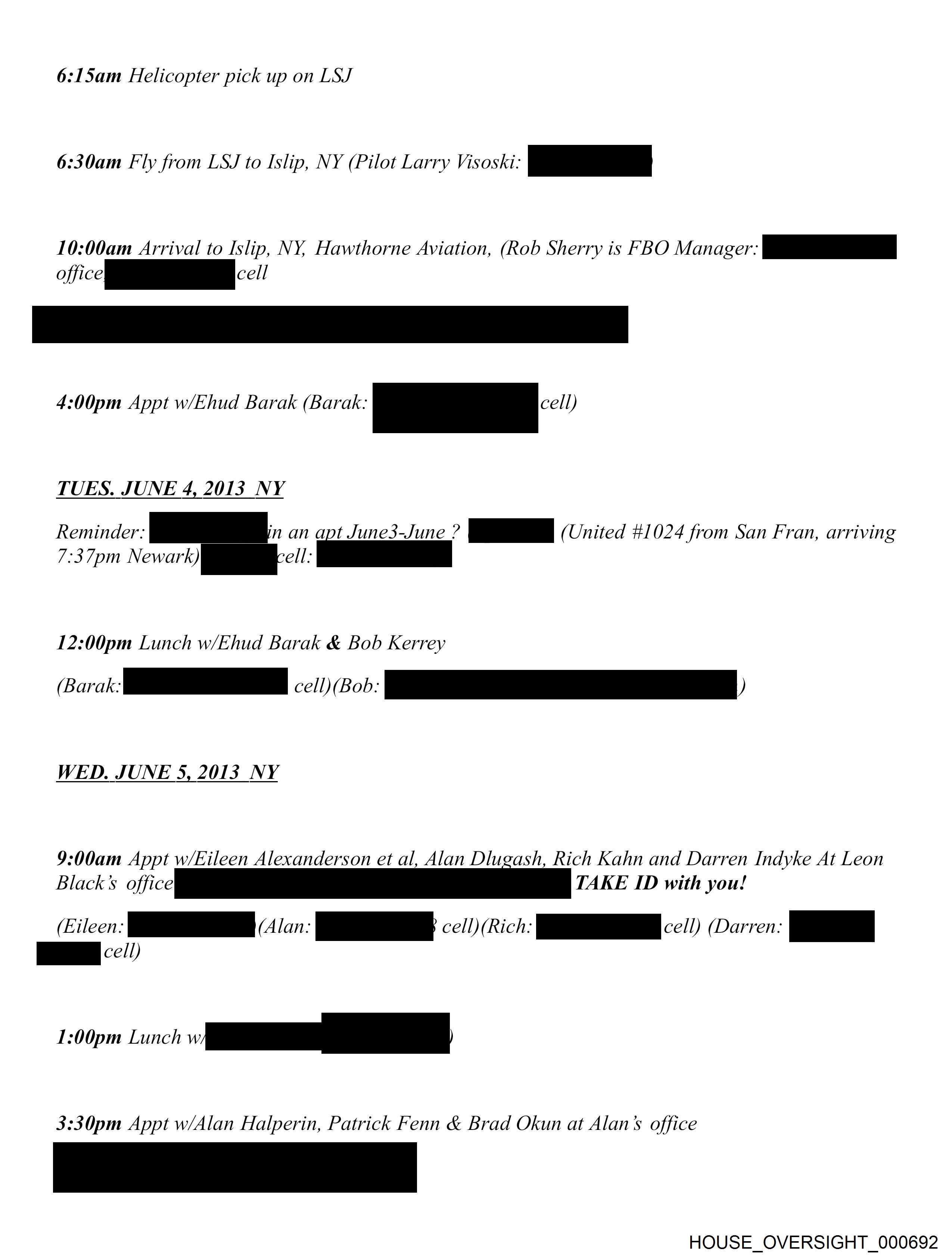 6:15am Helicopter pick up on LSJ 6:30am Fly from LSJ to Islip, NY (Pilot Larry Visoski: pe 10:00am Arrival to Islip, NY, Hawthorne Aviation, (Rob Sherry is FBO Manager: pS 4:00pm Appt w/Ehud Barak Cook: a 1) 6:00pm Appt w/Mort Zuckerman ay) TBD Jes to come by in the evening TUES. JUNE 4, 2013 NY 7pm Never lt apt June3-June ? , (United #1024 from San Fran, arriving 7:37pm Newark) ell: 12:00pm Lunch w/Ehud Barak & Bob Kerrey (Barak: ae cell) (Bob: rrr TBD TENTATIVE Appt w/Reid Weingarten (Food??) WED. JUNE 5, 2013 NY 9:00am Appt w/Eileen Alexanderson et al, Alan Dlugash, Rich Kahn and Darren Indyke At Leon Blacks office TAKE ID with you! HOUSE_OVERSIGHT_000698
