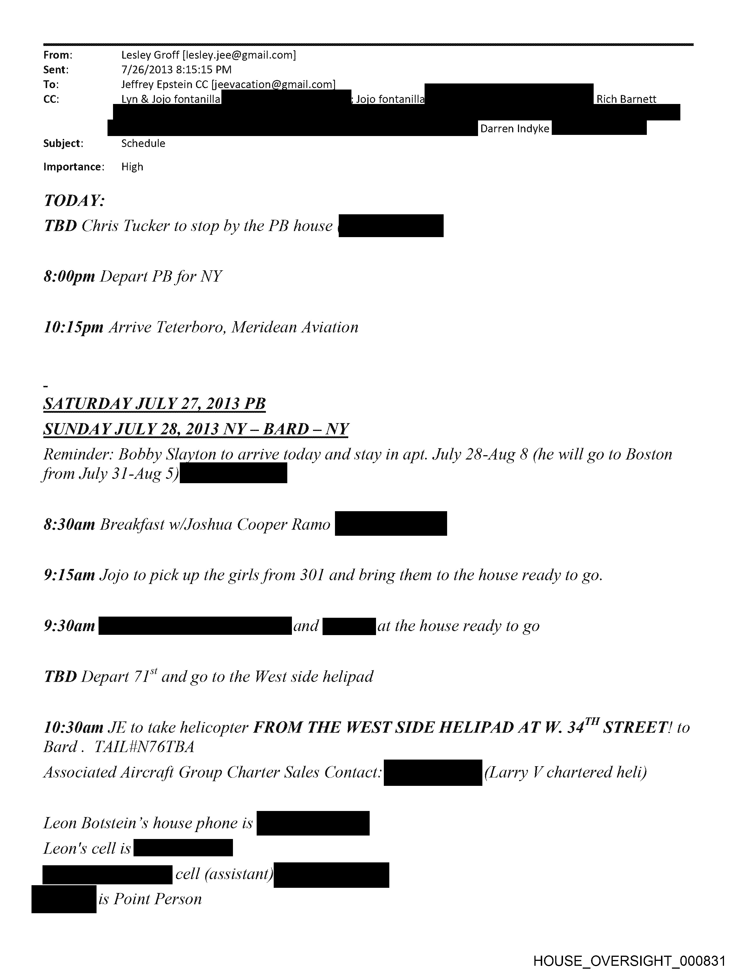 From: Lesley Groff [lesley.jee@gmail.com] Sent: 7/26/2013 8:15:15 PM To: Jeffrey Epstein CC [jeevacation Cc: Lyn & Jojo fontanilla Subject: Schedule Importance: High TODAY: TBD Chris Tucker to stop by the PB house pO 8:00pm Depart PB for NY 10:15pm Arrive Teterboro, Meridean Aviation SATURDAY JULY 27, 2013 PB SUNDAY JULY 28, 2013 NY — BARD — NY Reminder: Bobby Slayton to arrive today and stay in apt. July 25-Aug & (he will go to Boston from ily 3- aes, 8:30am Breakfast w/Joshua Cooper Ramo pe 9:15am Jojo to pick up the girls from 301 and bring them to the house ready to go. 9300 |: GH «the house ready to go TBD Depart 71” and go to the West side helipad 10:30am JE to take helicopter FROM THE WEST SIDE HELIPAD AT W. 34" STREET! to Bard. TAILHN76TBA Associated Aircraft Group Charter Sales Contact: ES (carry V chartered heli) Leon Botstein’s house phone is pe leon ll Ss == a is Point Person HOUSE_OVERSIGHT_000831