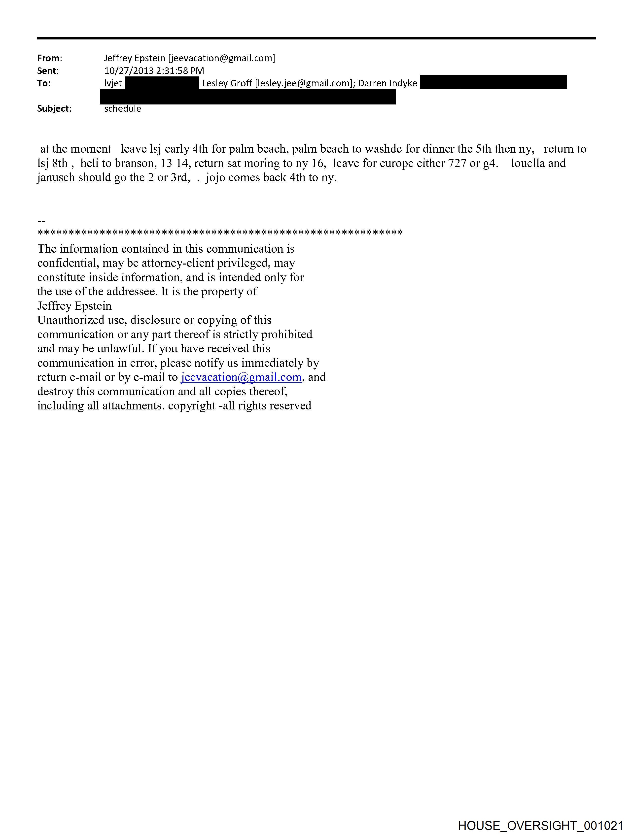 From: Jeffrey Epstein [jeevacation@gmail.com] Sent: 10/27/2013 2:31:58 PM To: Ivjet ae Lesley Groff [lesley.jee@gmail.com]; Darren Indyke Be Subject: schedule at the moment leave lsj early 4th for palm beach, palm beach to washdc for dinner the 5th then ny, return to lsj 8th , heli to branson, 13 14, return sat moring to ny 16, leave for europe either 727 or g4. louella and janusch should go the 2 or 3rd, . jojo comes back 4th to ny. DIS DIS BIS 21S DIS BIS 21S 24S 3S 21S 24S FIs 21S OS BIS IS OS FIs IS 31S FS IS OS OS IS DIS DIS IS 31S OI IS 21S OI IS 31S Of IS 21S 24S IS 21S 24S IS 21S 24 is 2S 24 Fis 2S OS Fis 2s OS Fis 2s OS is 2s The information contained in this communication is confidential, may be attorney-client privileged, may constitute inside information, and is intended only for the use of the addressee. It 1s the property of Jeffrey Epstein Unauthorized use, disclosure or copying of this communication or any part thereof is strictly prohibited and may be unlawful. If you have received this communication in error, please notify us immediately by return e-mail or by e-mail to jeevacation@gmail.com, and destroy this communication and all copies thereof, including all attachments. copyright -all rights reserved HOUSE_OVERSIGHT_001021