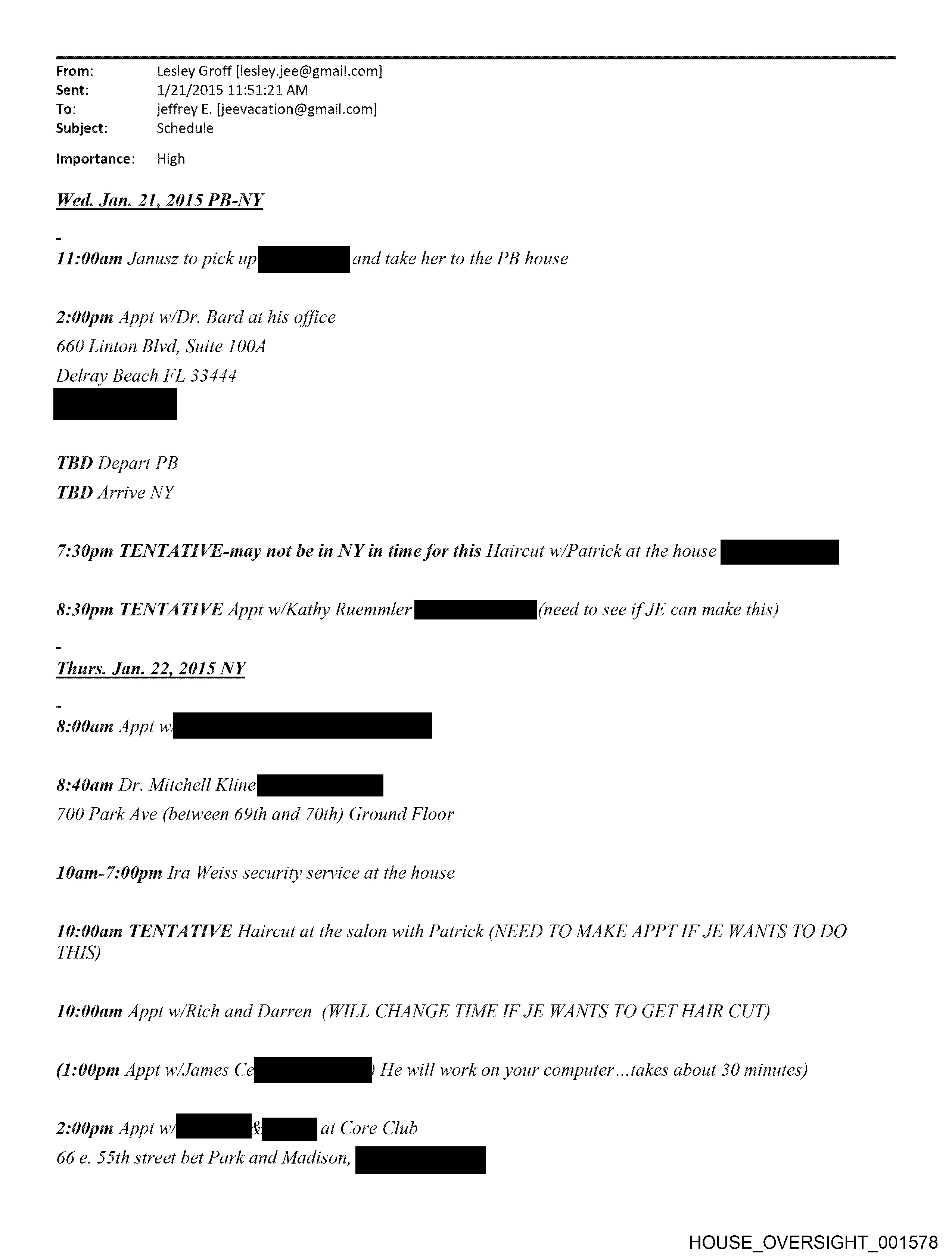From: Lesley Groff [lesley.jee@gmail.com] Sent: 1/21/2015 11:51:21 AM To: jeffrey E. [jeevacation@gmail.com] Subject: Schedule Importance: High 11:00am Janusz to pick __- and take her to the PB house 2:00pm Appt w/Dr. Bard at his office 660 Linton Blvd, Suite 100A Delray Beach FL 33444 TBD Depart PB TBD Arrive NY 7:30pm TENTATIVE-may not be in NY in time for this Haircut w/Patrick at the house a 8:30pm TENTATIVE Appt w/Kathy Ruemmler RRR (ced to see if JE can make this) 8:00am Appt vi 8:40am Dr. Mitchell iz 700 Park Ave (between 69th and 70th) Ground Floor 10am-7:00pm Ira Weiss security service at the house 10:00am TENTATIVE Haircut at the salon with Patrick (NEED TO MAKE APPT IF JE WANTS TO DO THIS) 10:00am Appt w/Rich and Darren (WILL CHANGE TIME IF JE WANTS TO GET HAIR CUT) (1:00pm Appt w/James i_—_—_—_—_- He will work on your computer ...takes about 30 minutes) 2:00pm Appt / aa at Core Club 66 e. 55th street bet Park and Madison, pe HOUSE_OVERSIGHT_001578