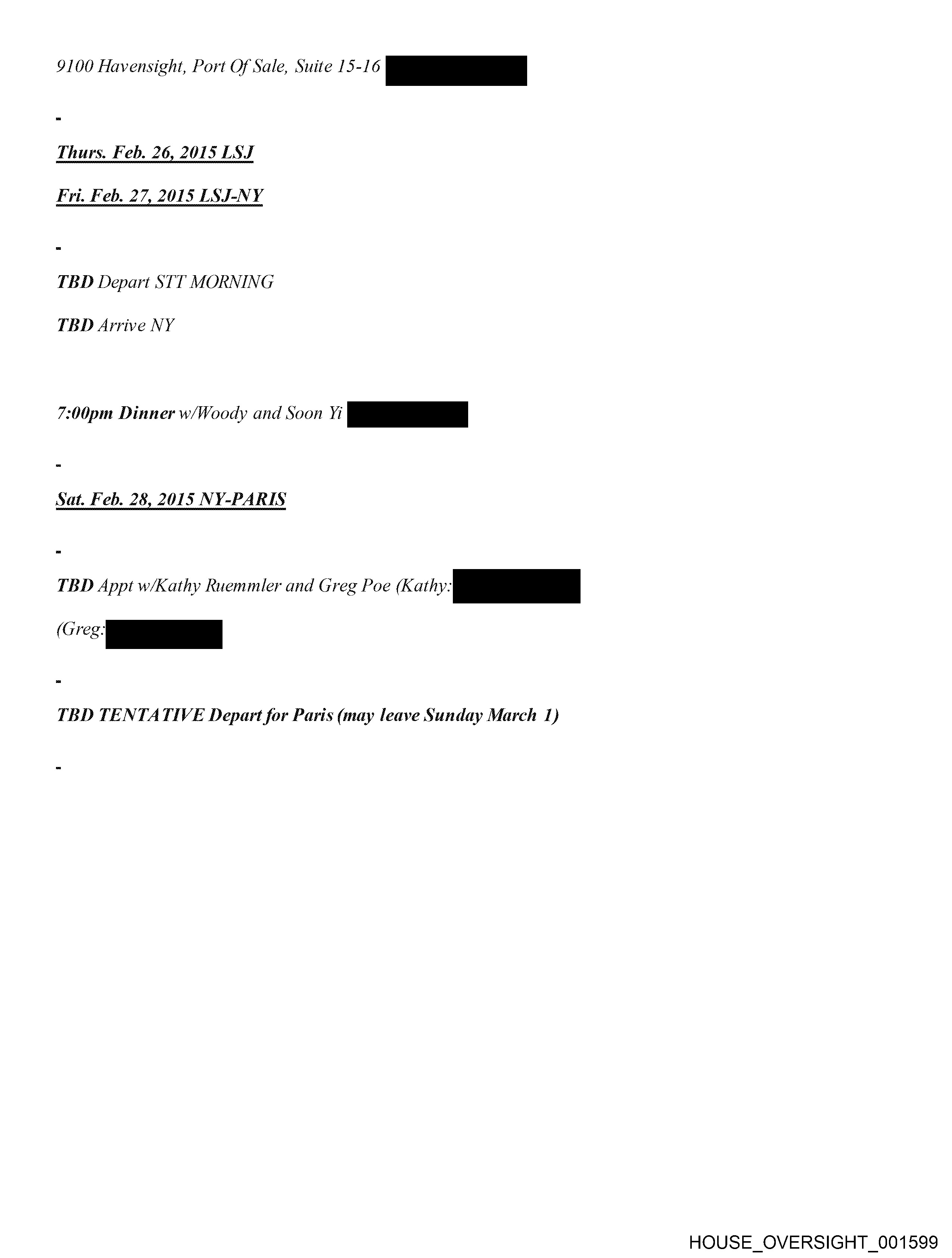 9100 Havensight, Port Of Sale, Suite 15-16 pS TBD Depart STT MORNING TBD Arrive NY 7:00pm Dinner w/Woody and Soon Yi pe Sat. Feb. 28, 2015 NY-PARIS TBD Appt w/Kathy Ruemmler and Greg Poe kon TBD TENTATIVE Depart for Paris (may leave Sunday March 1) HOUSE_OVERSIGHT_001599