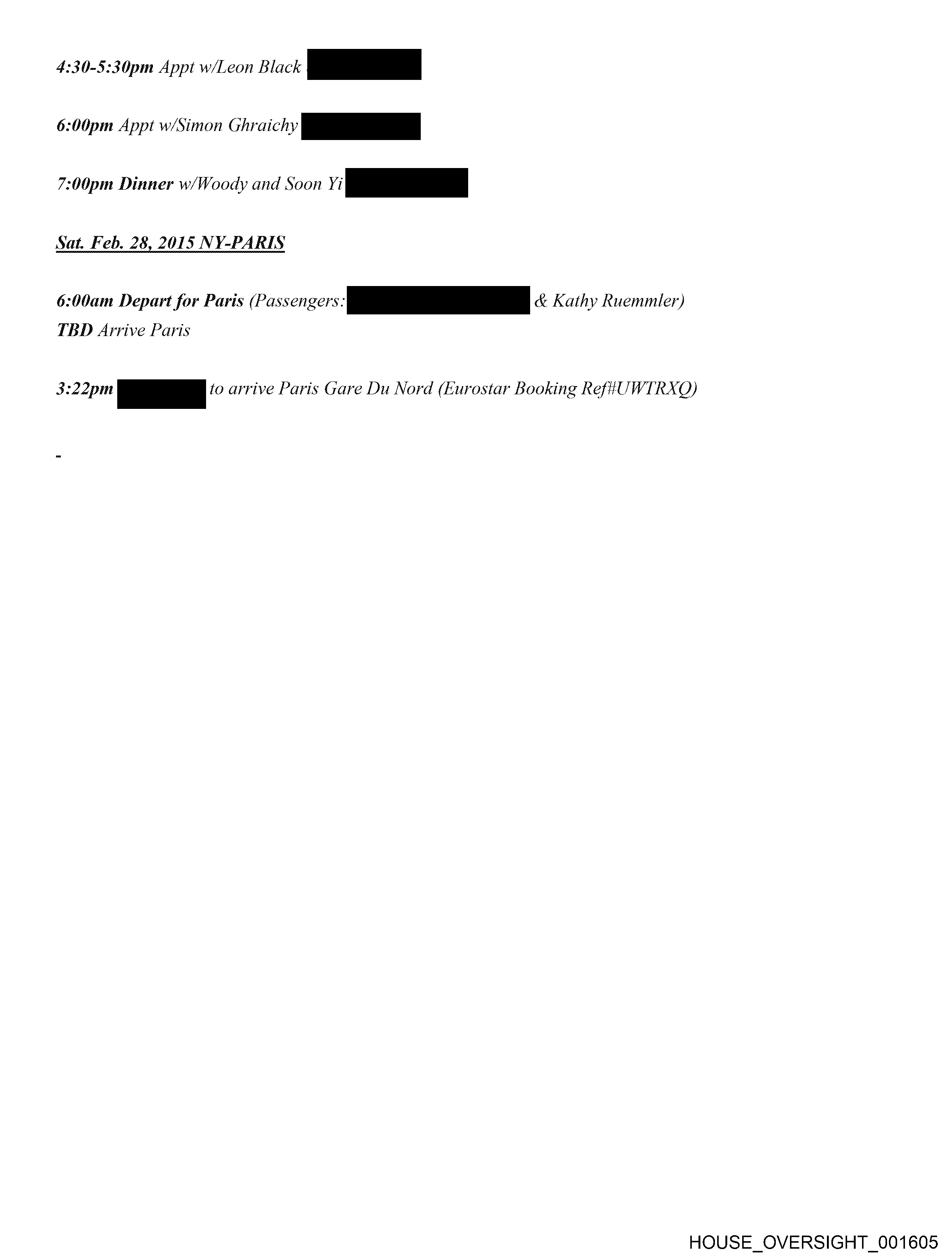 4:30-5:30pm Appt w/Leon Black pe 6:00pm Appt w/Simon Ghraichy pe 7:00pm Dinner w/Woody and Soon Y ; 6:00am Depart for Paris rsnccrs _—_—_—_—_—_—_—_, & Kathy Ruemmler) TBD Arrive Paris 3:22pm po to arrive Paris Gare Du Nord (Eurostar Booking ReftUWTRXO) HOUSE_OVERSIGHT_001605