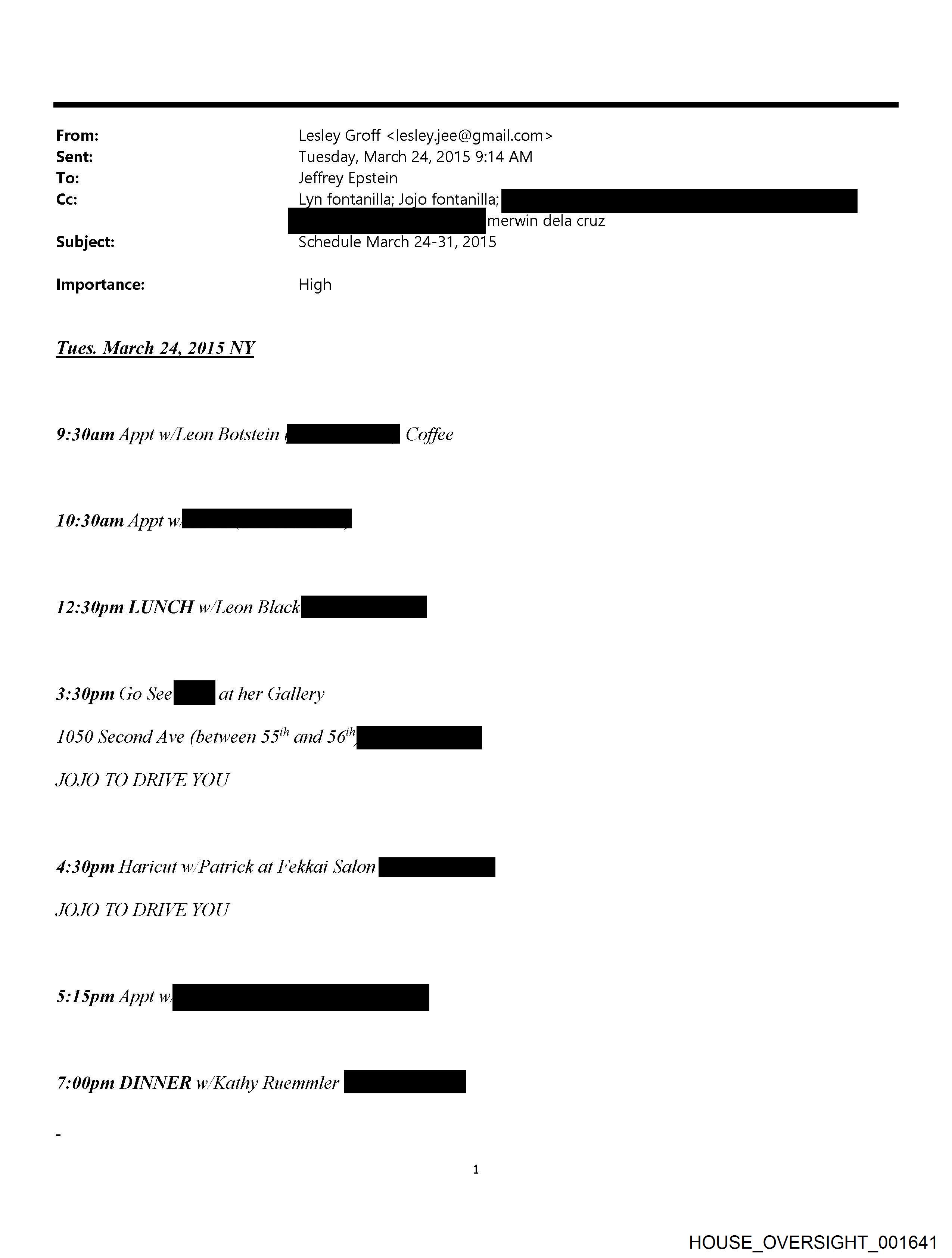 From: Lesley Groff <lesley.jee@qmail.com> Sent: Tuesday, March 24, 2015 9:14 AM To: Jeffrey Epstein Cc: Lyn fontanilla; Jojo fontanilla; merwin dela cruz Subject: Schedule March 24-31, 2015 Importance: High Tues. March 24, 2015 NY 9:30am Appt w/Leon Botstein RR Coffee 10:30am Ap \ 12:30pm LUNCH w/Leon Bo 3:30pm Go See ii at her Gallery 1050 Second Ave (between 55" and 5 —_ JOJO TO DRIVE YOU 4:30pm Haricut w/Patrick at Fekkai Sl; x JOJO TO DRIVE YOU 7:00pm DINNER w/Kathy Ruemmler P| HOUSE_OVERSIGHT_001641
