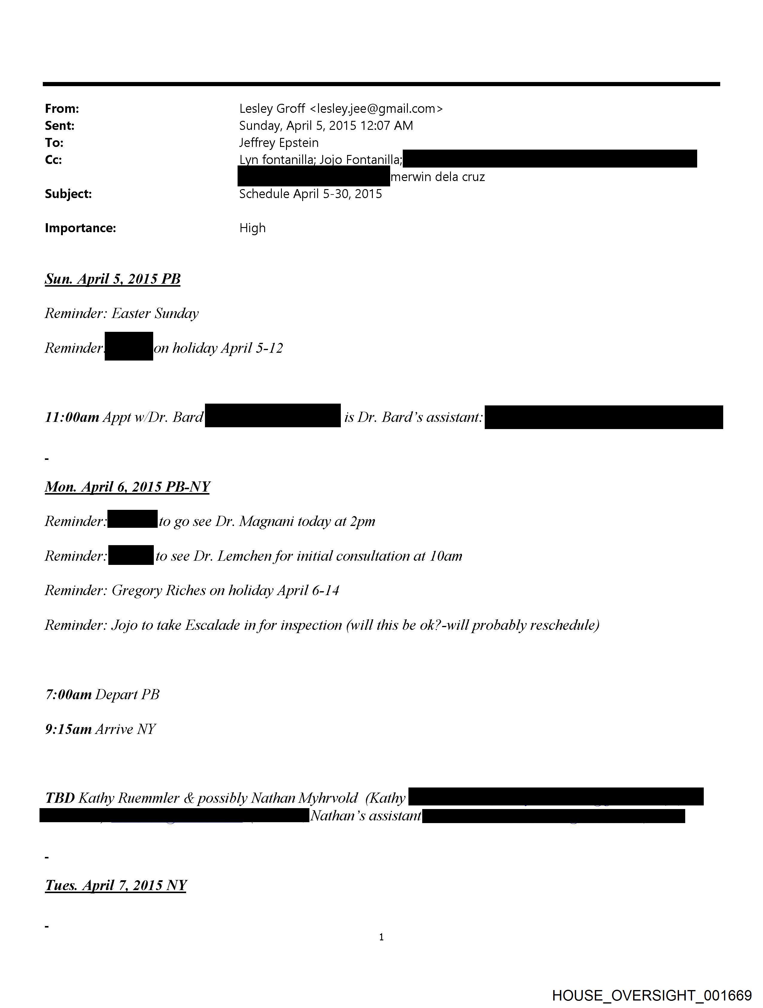 From: Lesley Groff <lesley.jee@qmail.com> Sent: Sunday, April 5, 2015 12:07 AM To: Jeffrey Epstein Cc: ™ _ - Fontanil| a; ls merwin dela cruz Subject: Schedule April 5-30, 2015 Importance: High Sun, April 5, 2015 PB Reminder: Easter Sunday Reminder on holiday April 5-12 11:00am Appt w/Dr. Bard pe is Dr. Bard’s assistant: ee Mon, April 6, 2015 PB-NY Remind to go see Dr. Magnani today at 2pm Reminder: to see Dr. Lemchen for initial consultation at 10am Reminder: Gregory Riches on holiday April 6-14 Reminder: Jojo to take Escalade in for inspection (will this be ok?-will probably reschedule) 7:00am Depart PB 9:15am Arrive NY TBD Kathy Ruemmler & possibly Nathan Myhrvold (Kathy ee Ps 6). 's oss Tues, April 7, 2015 NY HOUSE_OVERSIGHT_001669