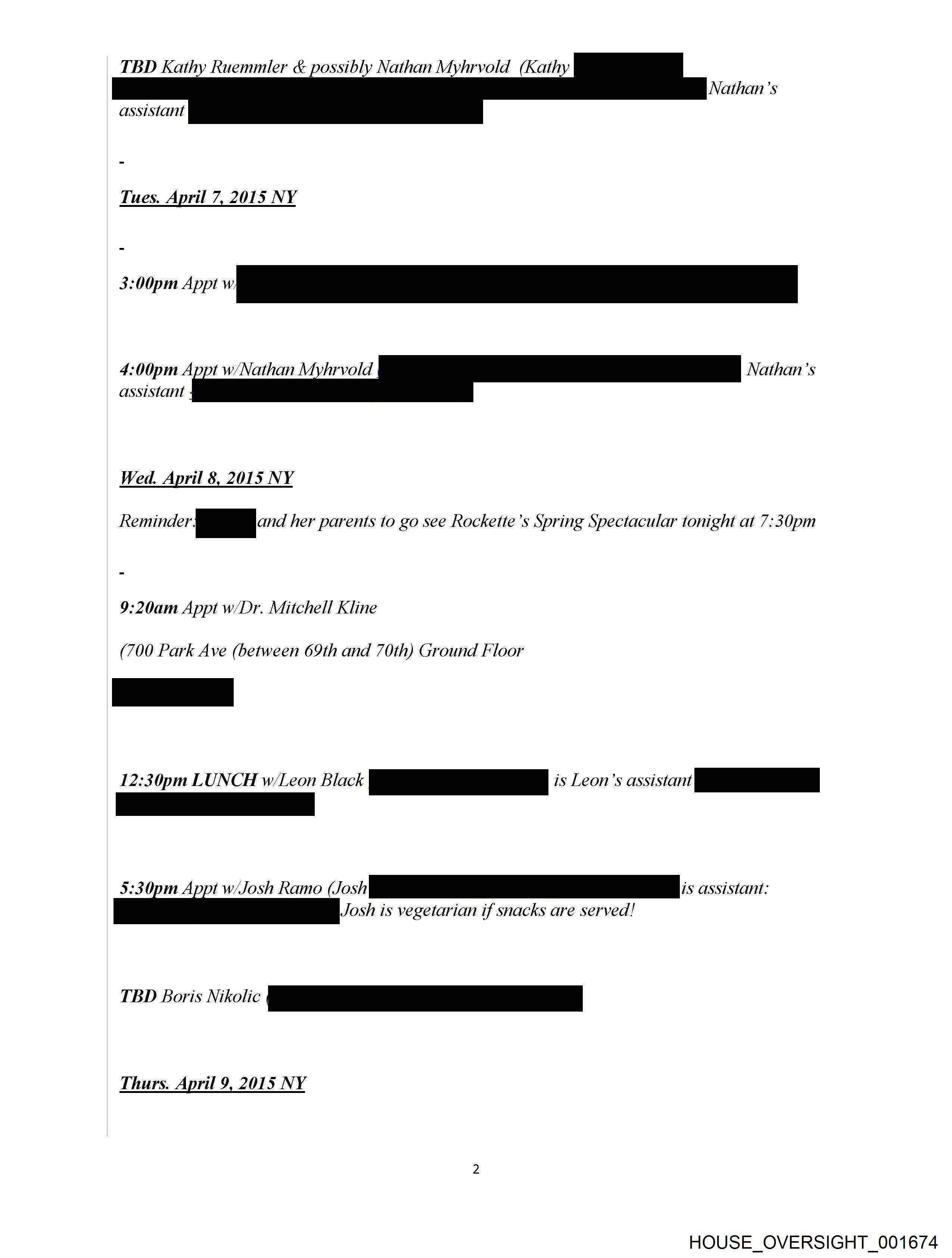 TBD Kathy Ruemmler & possibly Nathan Myhrvold (Kathy Nathan’s assistant Tues, April 7, 2015 NY 4:00pm Appt w/Nathan Myhrvold Nathan’s assistant Wed. April 8, 2015 NY Reminder SM and her parents to go see Rockette ’s Spring Spectacular tonight at 7:30pm 9:20am Appt w/Dr. Mitchell Kline (700 Park Ave (between 69th and 70th) Ground Floor 12:30pm LUNCH w/Leon Black pe is Leon’s sisi Josh is vegetarian if snacks are served! 523 ~ _ w/Josh Ramo i ee assistant: Thurs, April 9, 2015 NY HOUSE_OVERSIGHT_001674