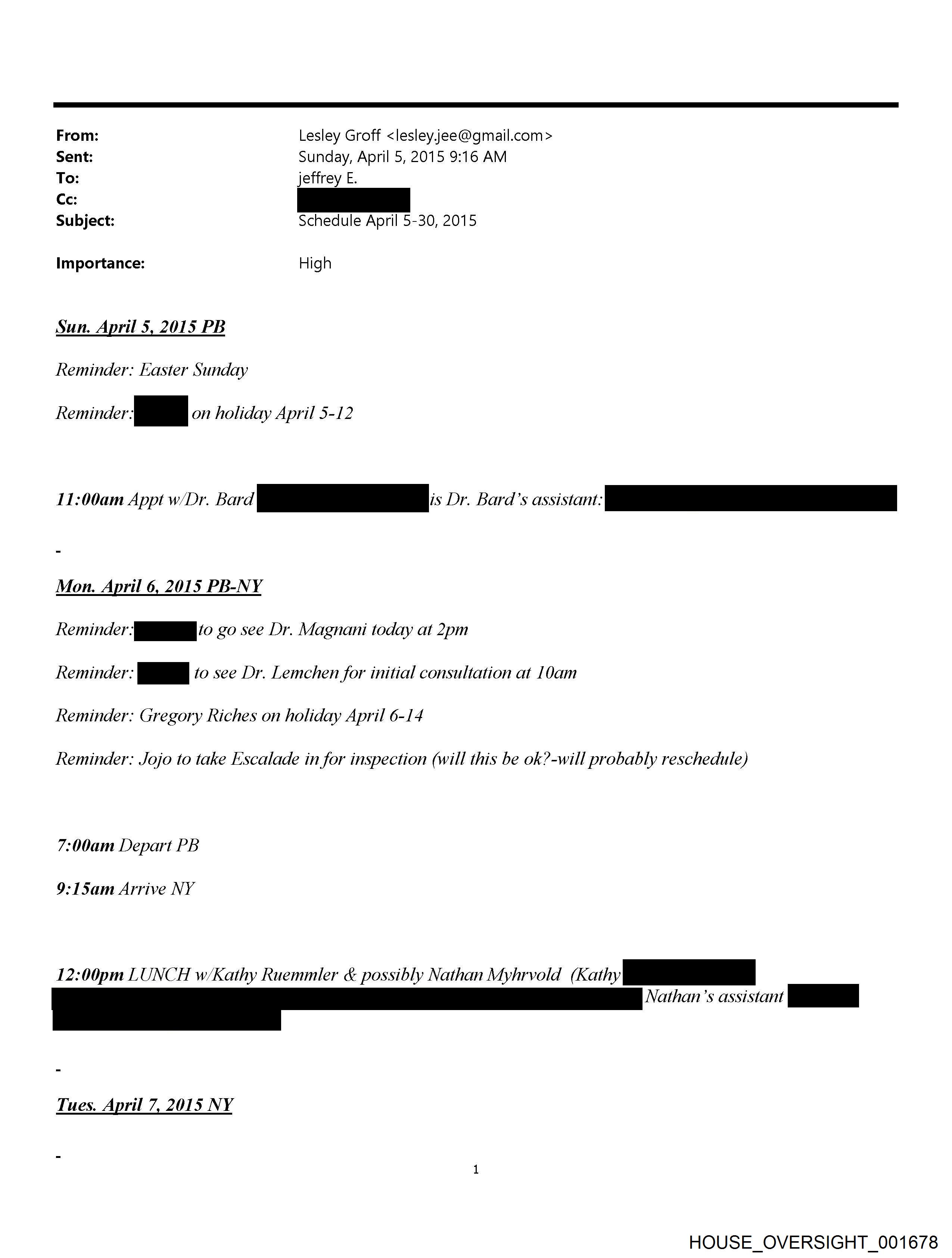 From: Lesley Groff <lesley.jee@qmail.com> Sent: Sunday, April 5, 2015 9:16 AM To: jeffrey E. Cc: Subject: Schedule April 5-30, 2015 Importance: High Sun, April 5, 2015 PB Reminder: Easter Sunday Reminder ia on holiday April 5-12 Mon, April 6, 2015 PB-NY Reminder ‘(QB 10 go see Dr. Magnani today at 2pm Reminder: po to see Dr. Lemchen for initial consultation at 10am Reminder: Gregory Riches on holiday April 6-14 Reminder: Jojo to take Escalade in for inspection (will this be ok?-will probably reschedule) 7:00am Depart PB 9:15am Arrive NY 12:00pm LUNCH w/Kathy Ruemmler & possibly Nathan Myhrvold on = Nathan’s assistant a Tues, April 7, 2015 NY HOUSE_OVERSIGHT_001678