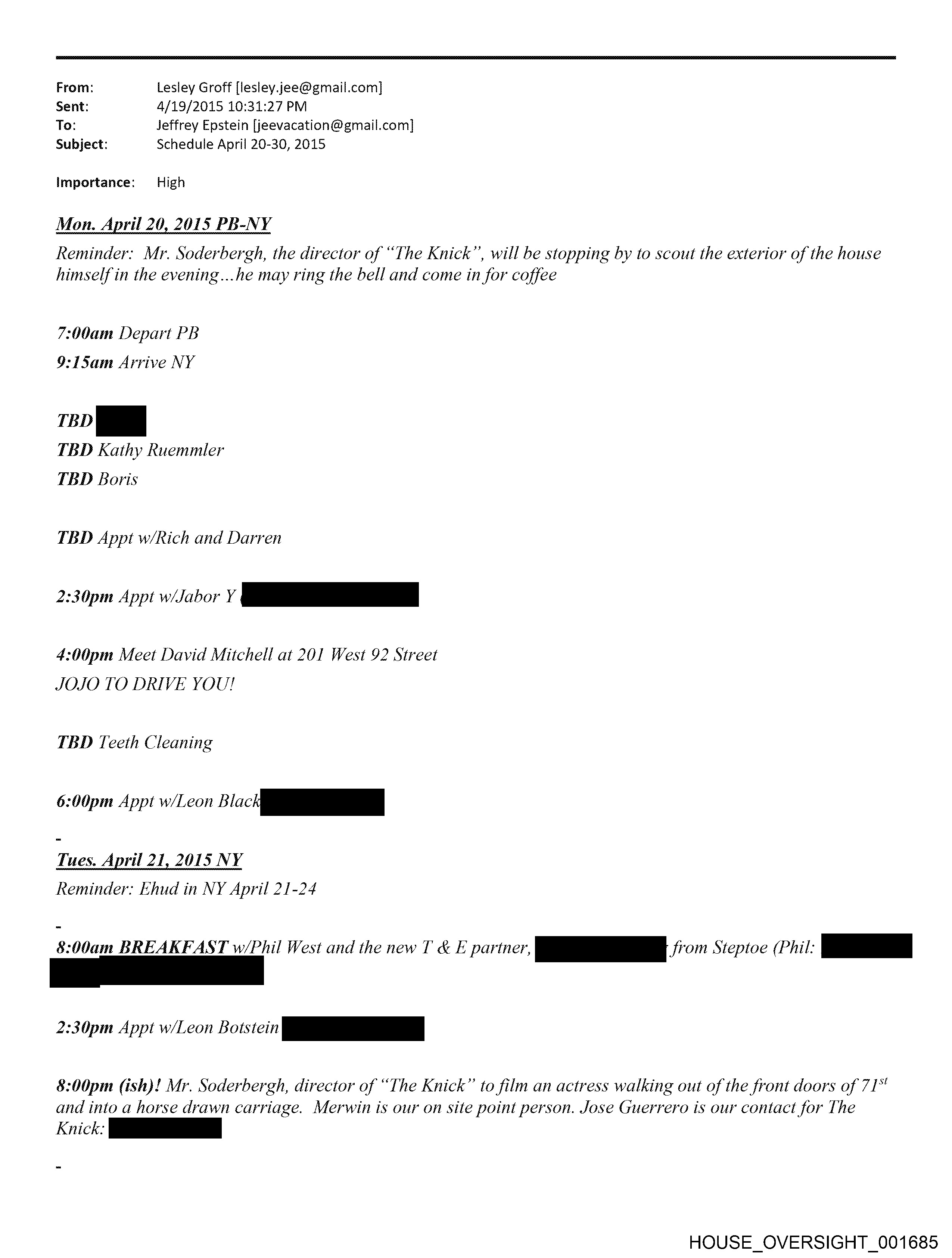 From: Lesley Groff [lesley.jee@gmail.com] Sent: 4/19/2015 10:31:27 PM To: Jeffrey Epstein [jeevacation@gmail.com] Subject: Schedule April 20-30, 2015 Importance: High Mon. April 20, 2015 PB-NY Reminder: Mr. Soderbergh, the director of “The Knick”, will be stopping by to scout the exterior of the house himself in the evening...he may ring the bell and come in for coffee 7:00am Depart PB 9:15am Arrive NY TBD a TBD Kathy Ruemmler TBD Boris TBD Appt w/Rich and Darren 2:30pm App wibo {is 4:00pm Meet David Mitchell at 201 West 92 Street JOJO TO DRIVE YOU! TBD Teeth Cleaning 6:00pm Appt w/Leon i _——_- Tues. April 21, 2015 NY Reminder: Ehud in NY April 21-24 8:00am BREAKFAST w/Phil West and the new T & E partner, pT from Steptoe (Phil: po 2:30pm Appt w/Leon Botstein B 8:00pm (ish)! Mr. Soderbergh, director of “The Knick” to film an actress walking out of the front doors of 71° and into a horse drawn carriage. Merwin is our on site point person. Jose Guerrero is our contact for The Knick: HOUSE_OVERSIGHT_001685