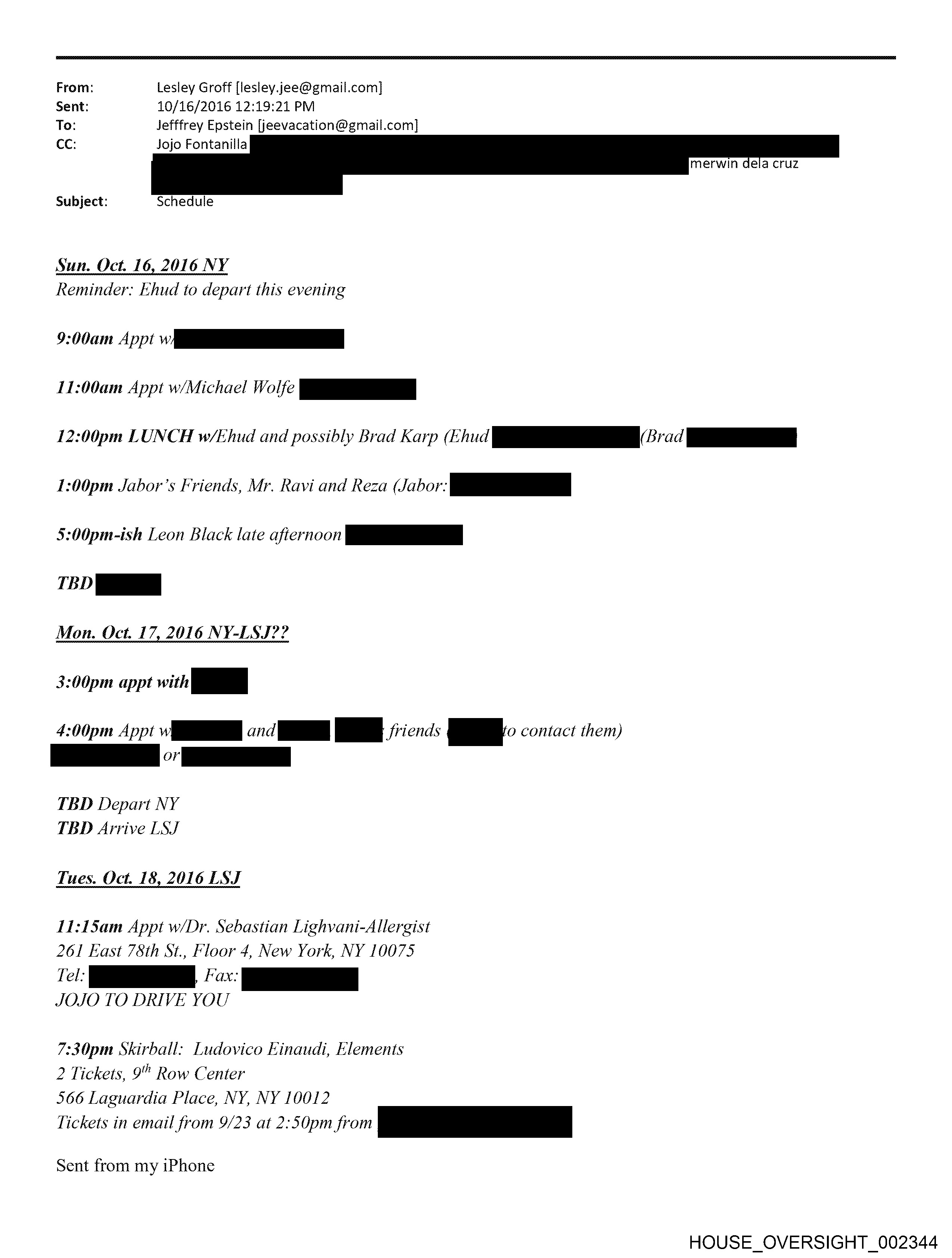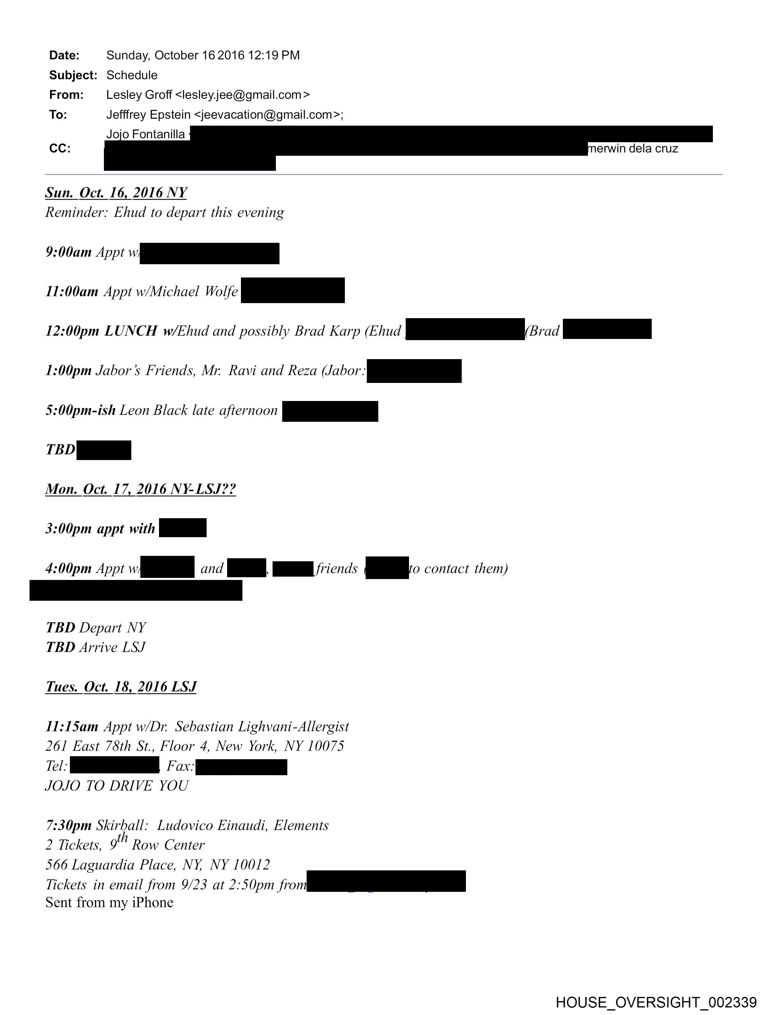 Date: Sunday, October 16 2016 12:19 PM Subject: Schedule From: Lesley Groff <lesley.jee@gmail.com > To: Jefffrey Epstein <jeevacation@gmail.com>; Jojo Fontanilla CC: erwin dela cruz Sun. Oct. 16, 2016 NY Reminder: Ehud to depart this evening 11:00am Appt w/Michael Wolfe Bp 12:00pm LUNCH w/Ehud and possibly Brad Karp (Ehud } a 1:00pm Jabor'’s Friends, Mr. Ravi and Reza i i _—_—_—_ 5:00pm-ish Leon Black late afternoon a WI Mon. Oct. 17, 2016 NY-LSJ?? 3:00pm appt with P| 4:00pm Appt wll and | BE friends ae. contact them) ee TBD Depart NY TBD Arrive LSJ Tues. Oct. 18, 2016 LSJ 11:15am Appt w/Dr. Sebastian Lighvani-Allergist 261 East 7Sth St., Floor 4, New York, NY 10075 fel JOJO TO DRIVE YOU 7:30pm Skirball: Ludovico Einaudi, Elements 2 Tickets, gf Row Center 566 Laguardia Place, NY, NY 10012 Tickets in email from 9/23 at 2:50pm jo _———— Sent from my iPhone HOUSE_OVERSIGHT_002339