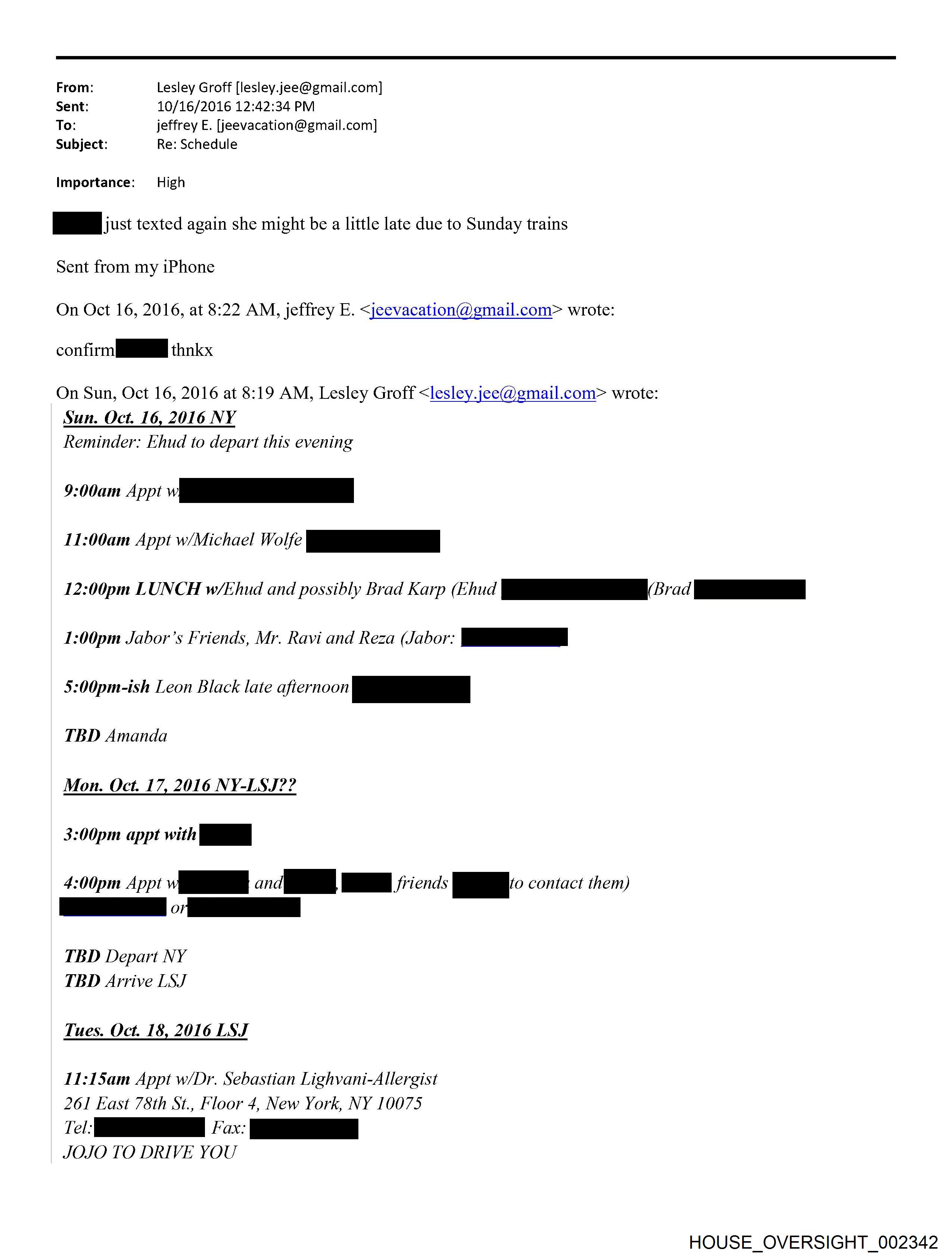 From: Lesley Groff [lesley.jee@gmail.com] Sent: 10/16/2016 12:42:34 PM To: jeffrey E. [jeevacation@gmail.com] Subject: Re: Schedule Importance: — High po just texted again she might be a little late due to Sunday trains Sent from my iPhone On Oct 16, 2016, at 8:22 AM, jeffrey E. <jeevacation@gmail.com> wrote: confirm Mga thnkx On Sun, Oct 16, 2016 at 8:19 AM, Lesley Groff <lesley.jee@gmail.com> wrote: Sun. Oct. 16, 2016 NY Reminder: Ehud to depart this evening 11:00am Appt w/Michael Wolfe Pp 12:00pm LUNCH w/Ehud and possibly Brad Karp (th, xxx Ene 1:00pm Jabor’s Friends, Mr. Ravi and Reza (Jabor: Po 5:00pm-ish Leon Black late afternoon pe TBD Amanda Mon. Oct. 17, 2016 NY-LSJ?? 3:00pm appt with po 4:00pm Appt mY ond ME friends i contact them) iE) Pe O TBD Depart NY TBD Arrive LSJ Tues. Oct. 18, 2016 LSJ 11:15am Appt w/Dr. Sebastian Lighvani-Allergist 261 East 78th St., Floor 4, New York, NY 10075 JOJO TO DRIVE YOU HOUSE_OVERSIGHT_002342
