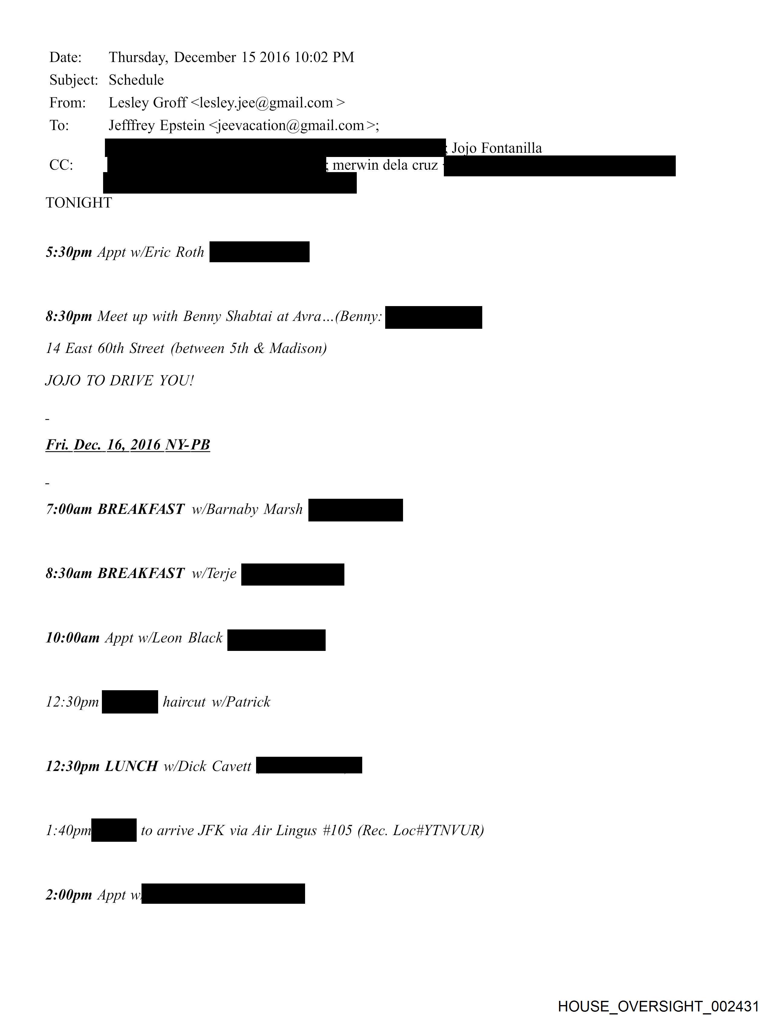 Date: Thursday, December 15 2016 10:02 PM Subject: Schedule From: Lesley Groff <lesley.jee@gmail.com > To: Jefffrey Epstein <jeevacation@gmail.com >; Jojo Fontanilla CC: merwin dela cruz TONIGHT 5:30pm Appt w/Eric Roth pS 8:30pm Meet up with Benny Shabtai at Avra...(Benny: pe 14 East 60th Street (between Sth & Madison) JOJO TO DRIVE YOU! Fri. Dec. 16, 2016 NY-PB 7:00am BREAKFAST w/Barnaby Marsh po 8:30am BREAKFAST wreije ii—_—_- 10:00am Appt w/Leon Black pe 12:30pm po haircut w/Patrick 12:30pm LUNCH w/Dick Cavett PO 1:40pr fH to arrive JFK via Air Lingus #105 (Rec. Loc#YTNVUR) 2:00pm Ap "_ ___ HOUSE_OVERSIGHT_002431