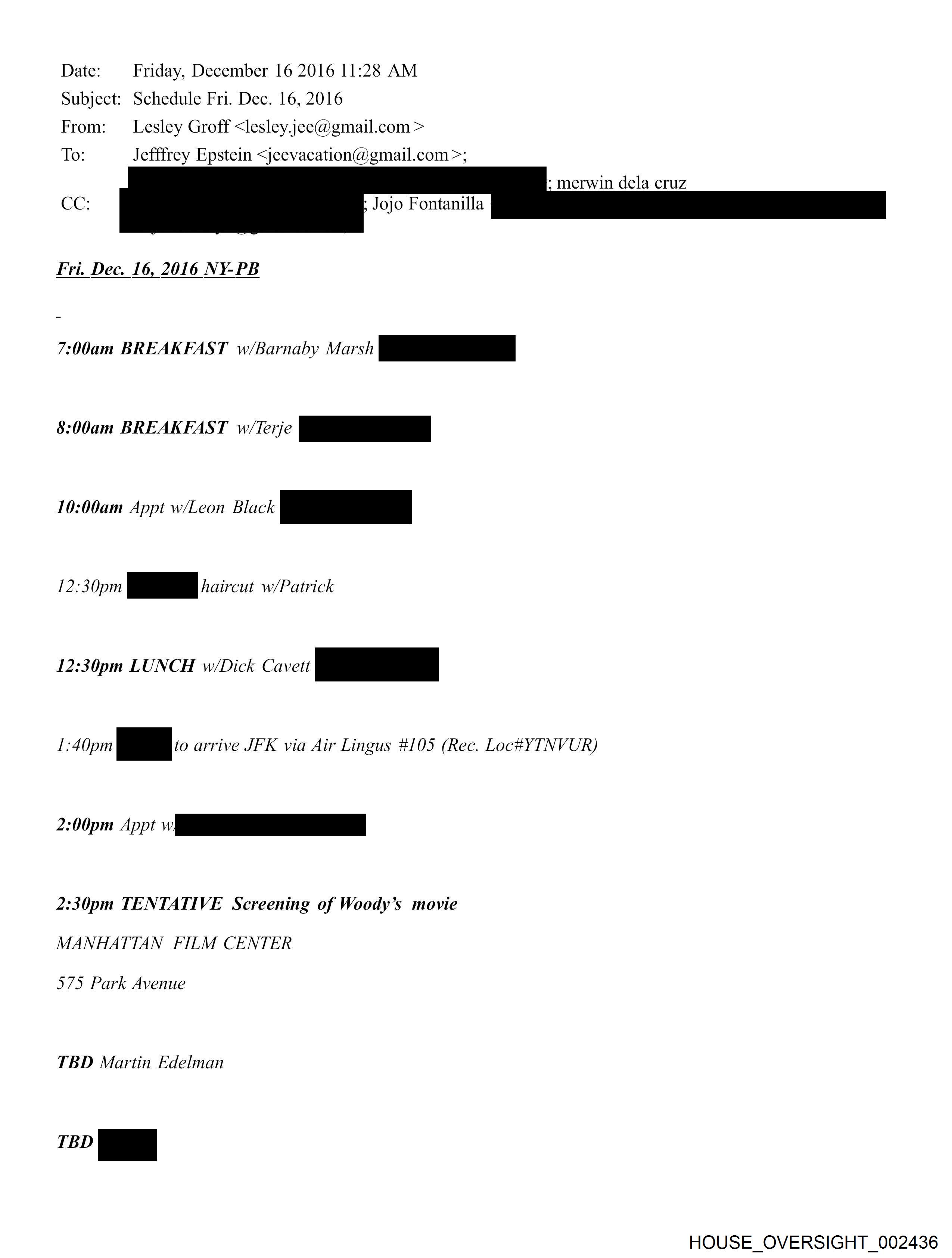 Date: Friday, December 16 2016 11:28 AM Subject: Schedule Fri. Dec. 16, 2016 From: Lesley Groff <lesley.jee@gmail.com > To: Jefffrey Epstein <jeevacation@gmail.com >; ‘merwin dela cruz Ae, ; Jojo Fontanilla Fri. Dec. 16, 2016 NY-PB vation BREAKFAST w/Barnaby os 8:00am BREAKFAST w/t iii 10:00am Appt w/Leon Black a 12:30pm po haircut w/Patrick 12:30pm LUNCH w/Dick Cavett ee 1:40pm ff arrive JFK via Air Lingus #105 (Rec. Loc#YTNVUR) 2:00pm Ap 2:30pm TENTATIVE Screening of Woody’s movie MANHATTAN FILM CENTER 575 Park Avenue TBD Martin Edelman TBD a HOUSE_OVERSIGHT_002436
