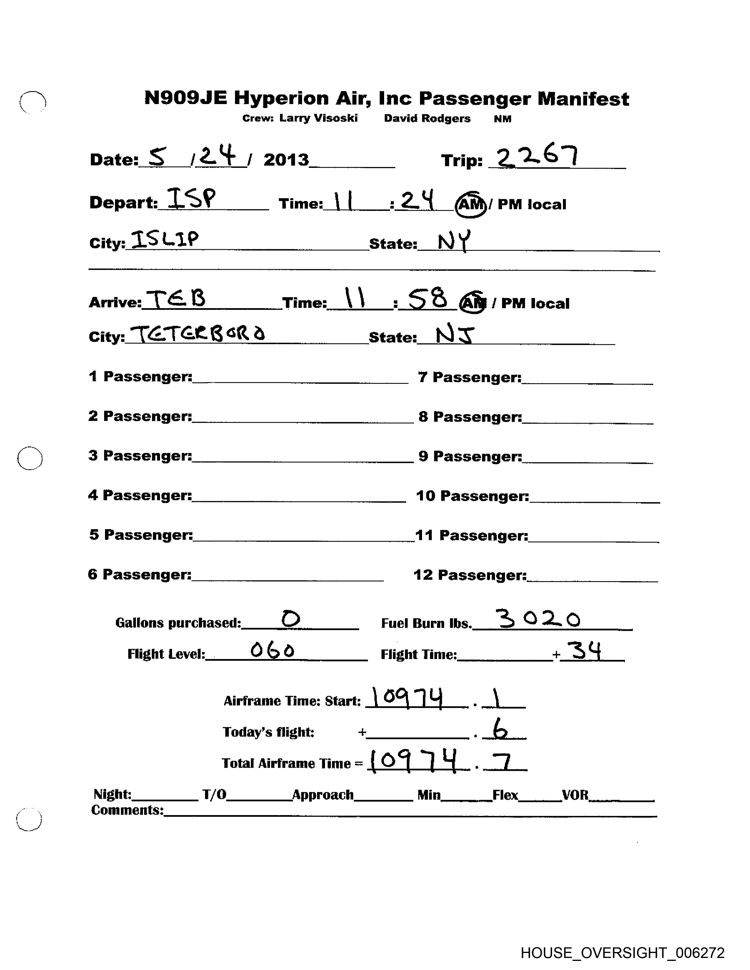NSO9SJE Hyperion Air, Inc Passenger Manifest