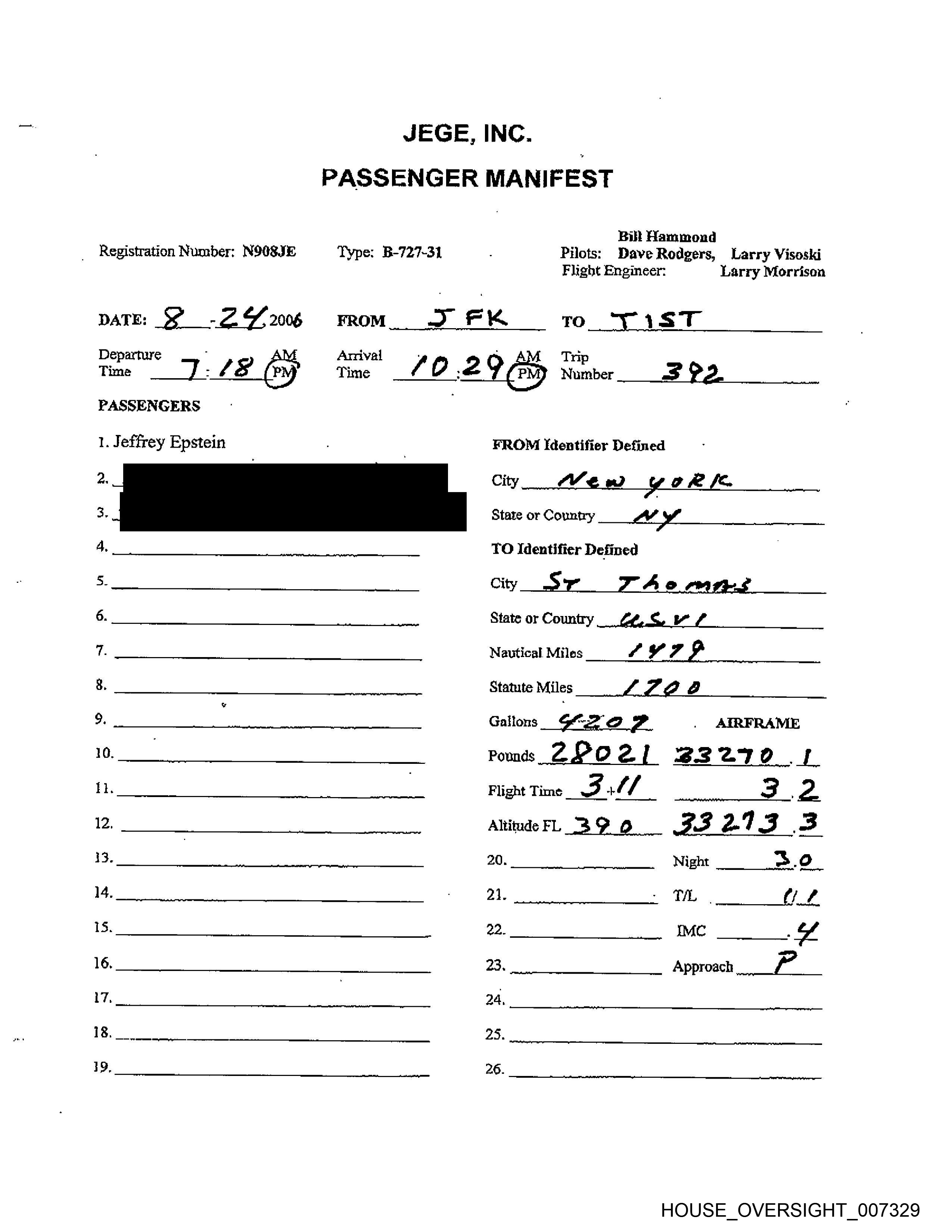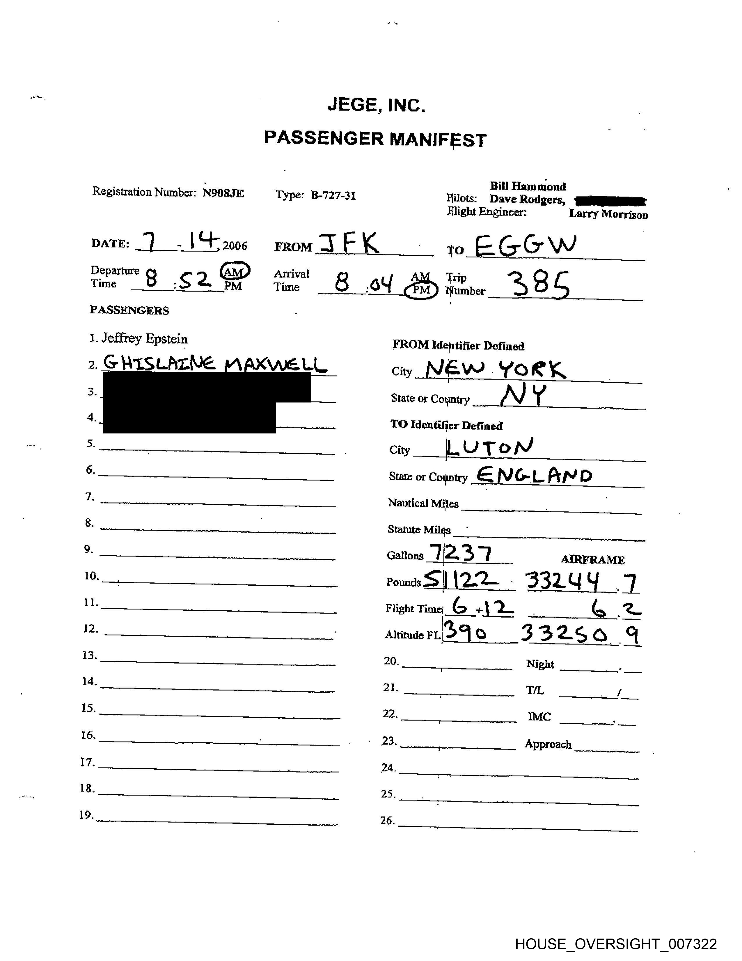 Registration Number: N908JE Type: B-727-31 Pilots: Dave Rodgers, Qi