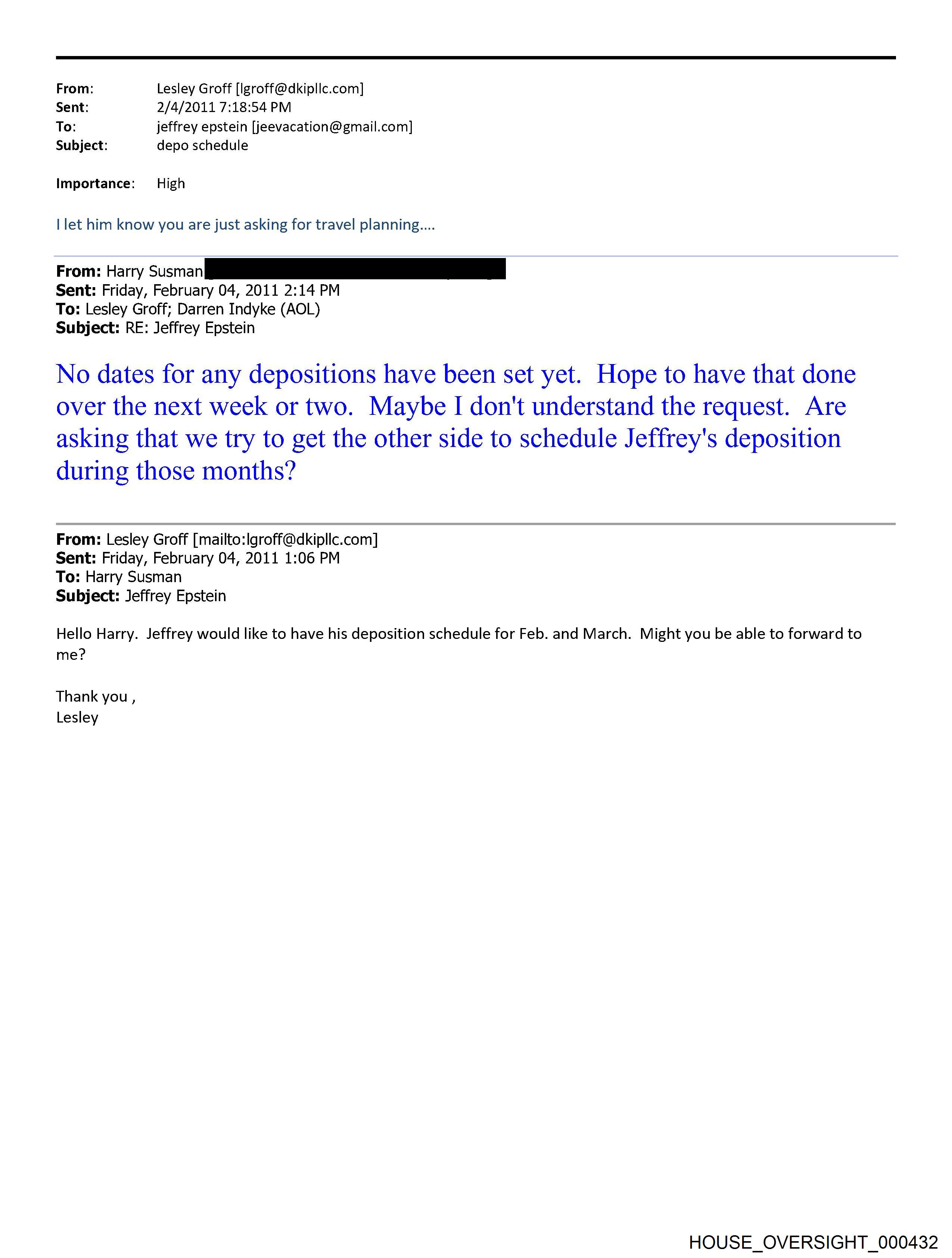 Hello Harry. Jeffrey would like to have his deposition schedule for Feb. and March. Might you be able to forward to