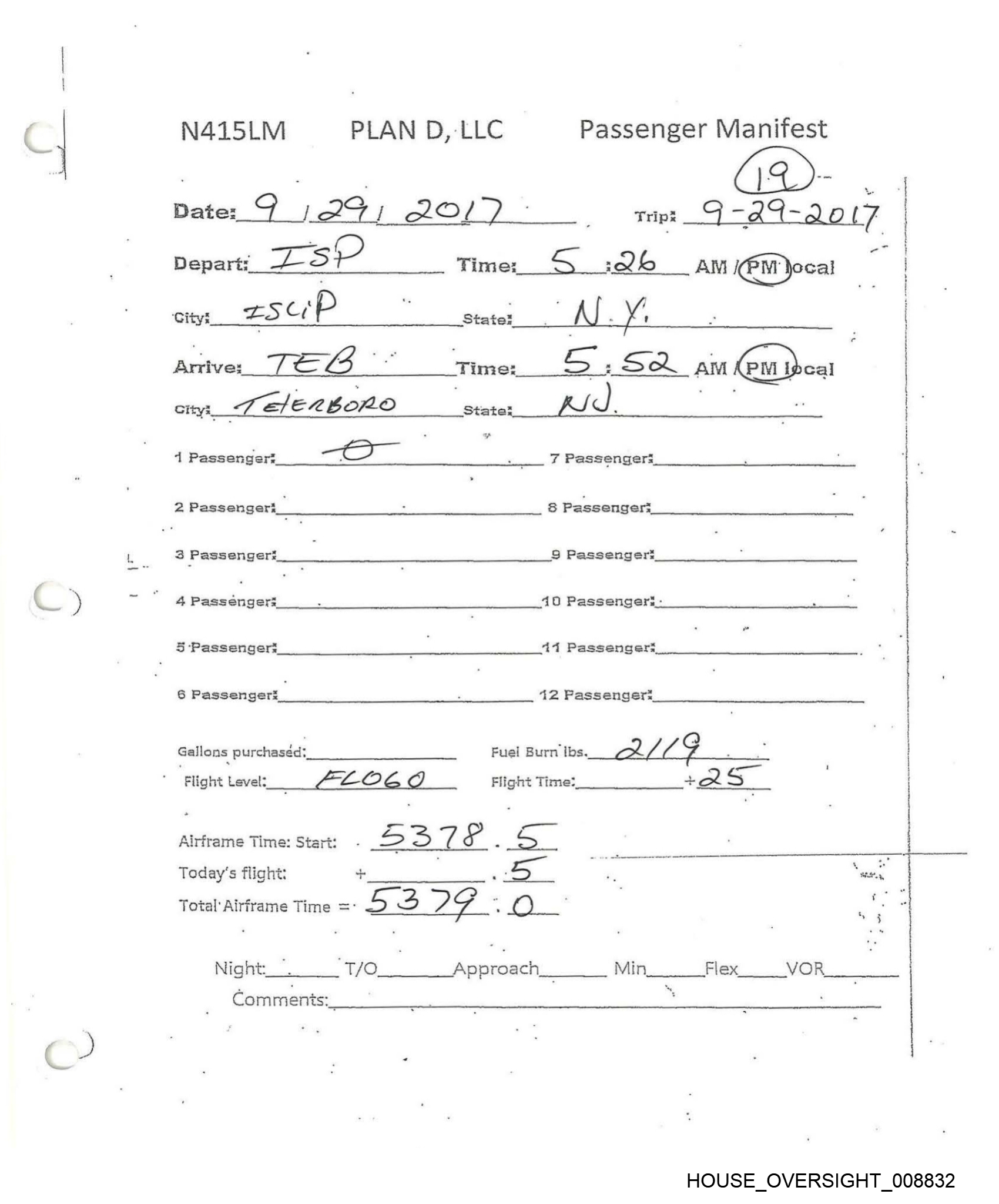 N415kM PLAN D, LLC Passenger Manifest