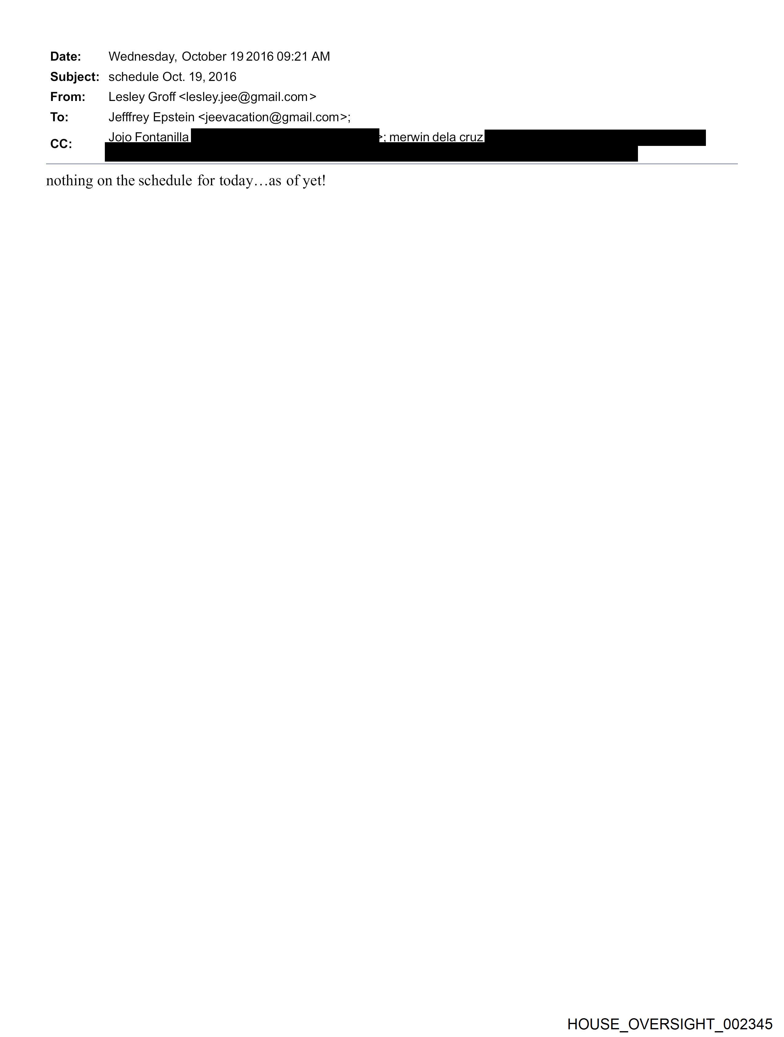 Date: Wednesday, October 19 2016 09:21 AM Subject: schedule Oct. 19, 2016 From: Lesley Groff <lesley.jee@gmail.com > To: Jefffrey Epstein <jeevacation@gmail.com>; CC: Jojo Fontanilla ‘merwin dela cruz nothing on the schedule for today...as of yet! HOUSE_OVERSIGHT_002345