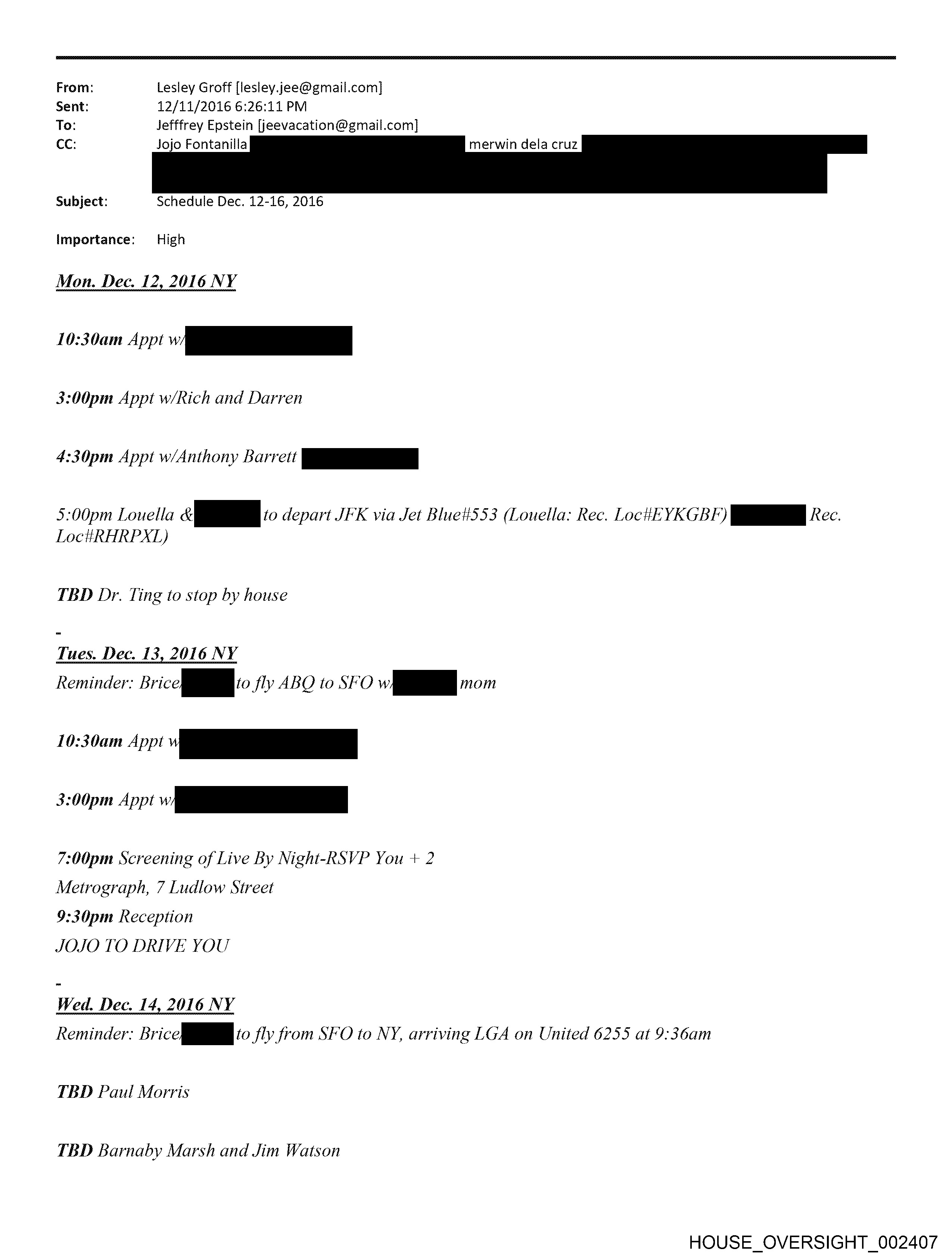 From: Lesley Groff [lesley.jee@gmail.com] Sent: 12/11/2016 6:26:11 PM To: Jefffrey Epstein [jeevacation@gmail.com] Cc: Jojo Fontanilla merwin dela cruz Subject: Schedule Dec. 12-16, 2016 Mon. Dec. 12, 2016 NY 3:00pm Appt w/Rich and Darren 4:30pm Appt w/Anthony Barrett pe 5:00pm Louella & ae depart JFK via Jet Bluet#553 (Louella: Rec. Loc#E YKGBF) fr Rec. Loc#RAHARPXTL) TBD Dr. Ting to stop by house Tues. Dec. 13, 2016 NY Reminder: Bric lo fly ABQ to SFO VE 20m 10:30 Ap 3:00pm Ap 7:00pm Screening of Live By Night-RSVP You + 2 Metrograph, 7 Ludlow Street 9:30pm Reception JOJO TO DRIVE YOU TBD Paul Morris TBD Barnaby Marsh and Jim Watson HOUSE_OVERSIGHT_002411