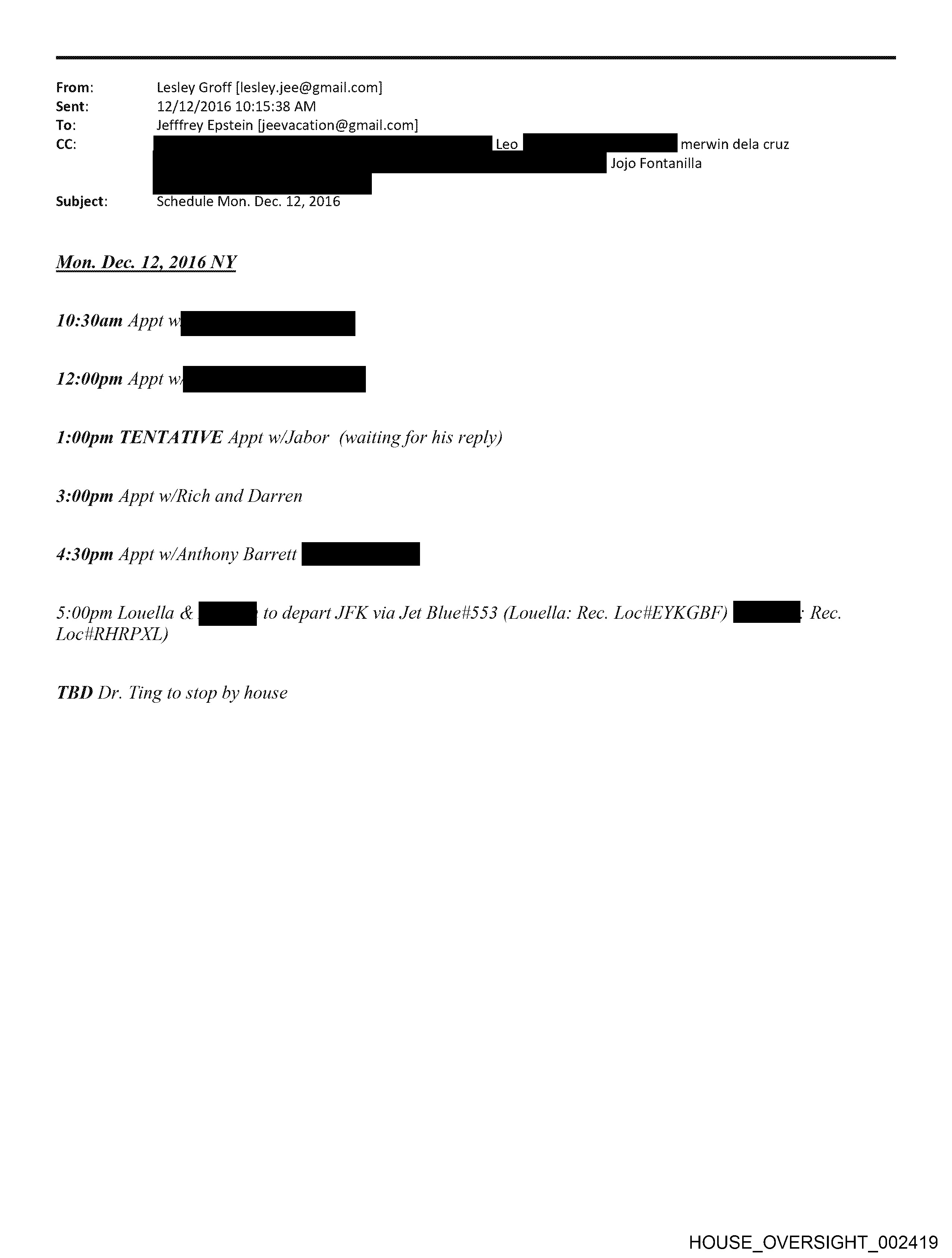 From: Lesley Groff [lesley.jee@gmail.com] Sent: 12/12/2016 10:15:38 AM To: Jefffrey Epstein [jeevacation@gmail.com] merwin dela cruz Jojo Fontanilla Subject: Schedule Mon. Dec. 12, 2016 Mon. Dec. 12, 2016 NY 1:00pm TENTATIVE Appt w/Jabor (waiting for his reply) 3:00pm Appt w/Rich and Darren 4:30pm Appt w/Anthony Barrett Pe 5:00pm Louella & PY] to depart JFK via Jet Bluet#553 (Louella: Rec. LochHE YKGBF) a. Rec. Loc#RARPXT) TBD Dr. Ting to stop by house HOUSE_OVERSIGHT_002419