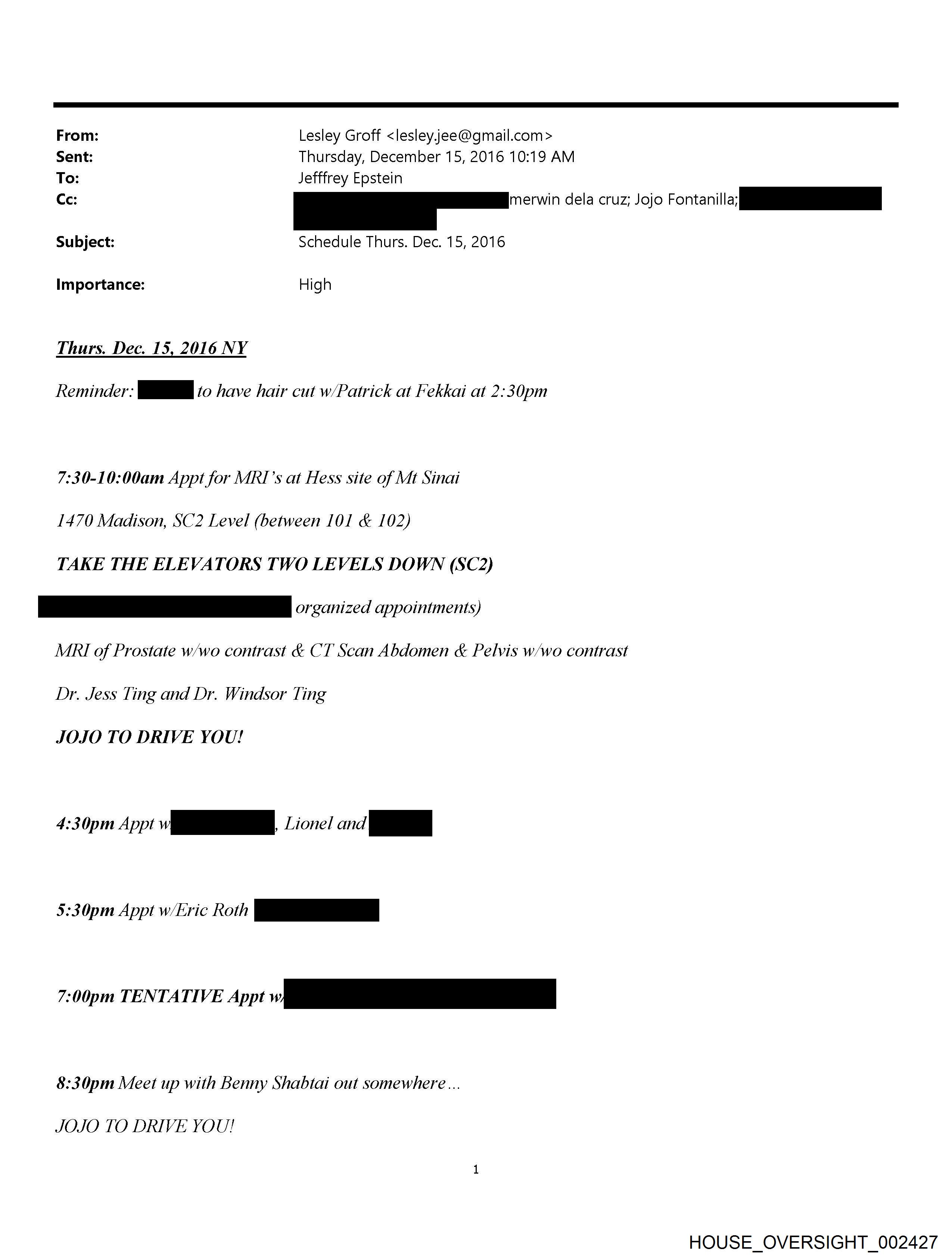 From: Lesley Groff <lesley.jee@qmail.com> Sent: Thursday, December 15, 2016 10:19 AM To: Jefffrey Epstein Cc: merwin dela cruz; Jojo Fontanilla ii Subject: Schedule Thurs. Dec. 15, 2016 Importance: High Thurs. Dec. 15, 2016 NY Reminder: WM to have hair cut w/Patrick at Fekkai at 2:30pm 7:30-10:00am Appt for MRI’s at Hess site of Mt Sinai 1470 Madison, SC2 Level (between 101 & 102) TAKE THE ELEVATORS TWO LEVELS DOWN (SC2) a © 20115:2¢4 appointments) MRI of Prostate w/wo contrast & CT Scan Abdomen & Pelvis w/wo contrast Dr. Jess Ting and Dr. Windsor Ting JOJO TO DRIVE YOU! 4:30pm App VEE Lionel ond 5:30pm Appt w/Eric Roth i 7:00pm TENTATIVE App! 8:30pm Meet up with Benny Shabtai out somewhere... JOJO TO DRIVE YOU! HOUSE_OVERSIGHT_002427