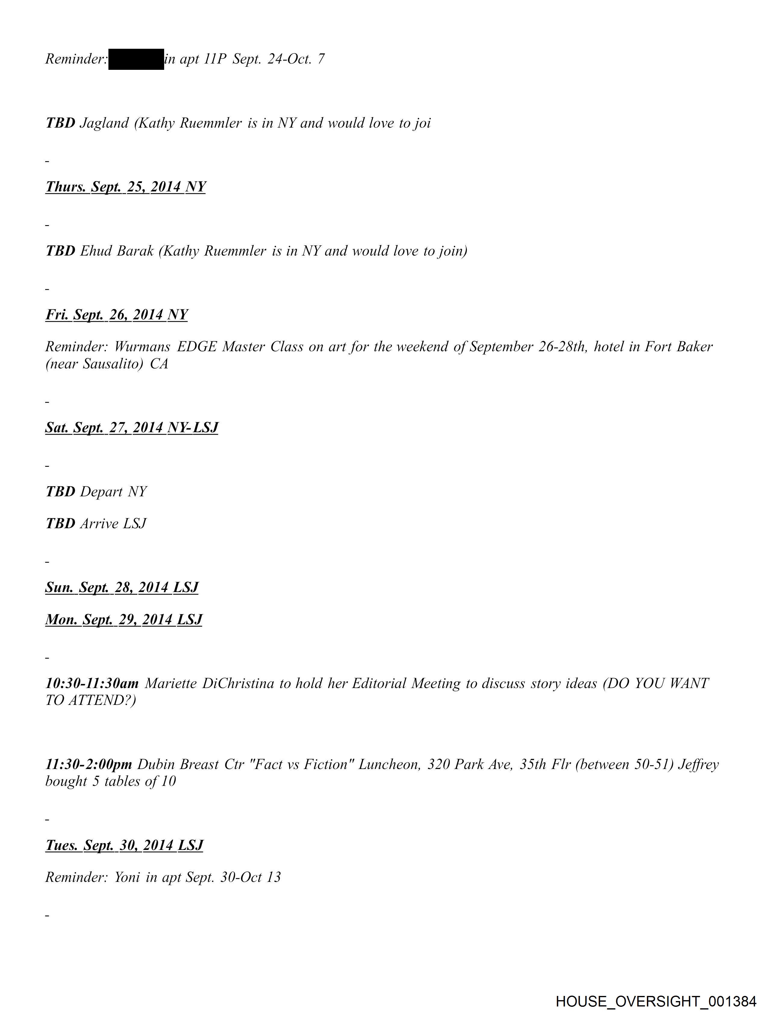 Reminder J in apt 11P Sept. 24-Oct. 7 a