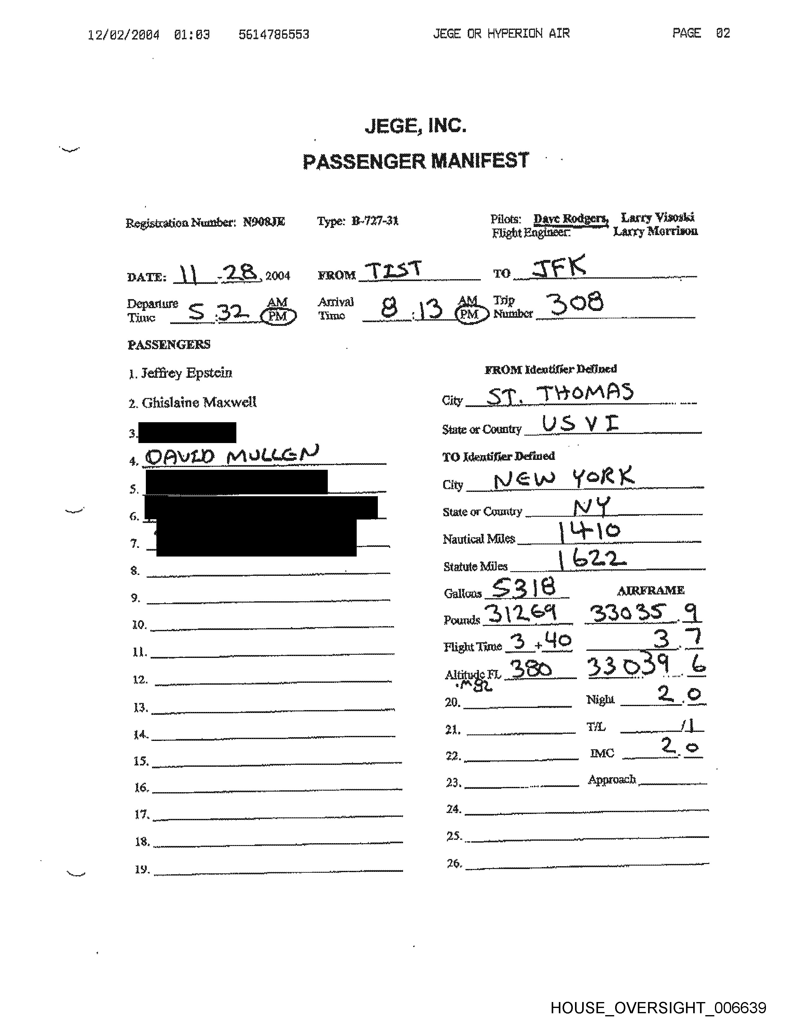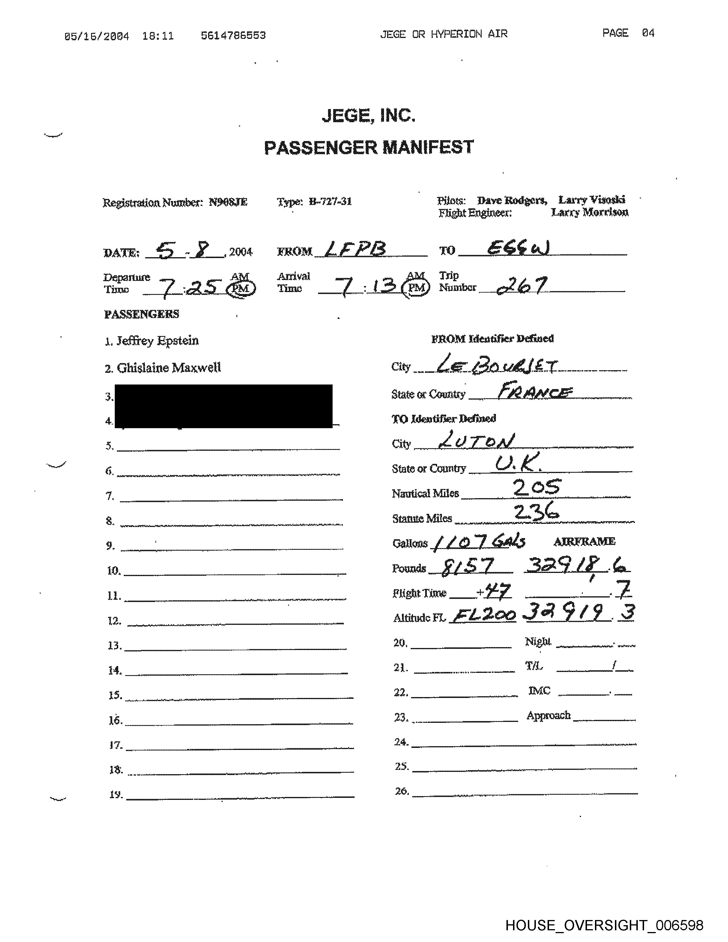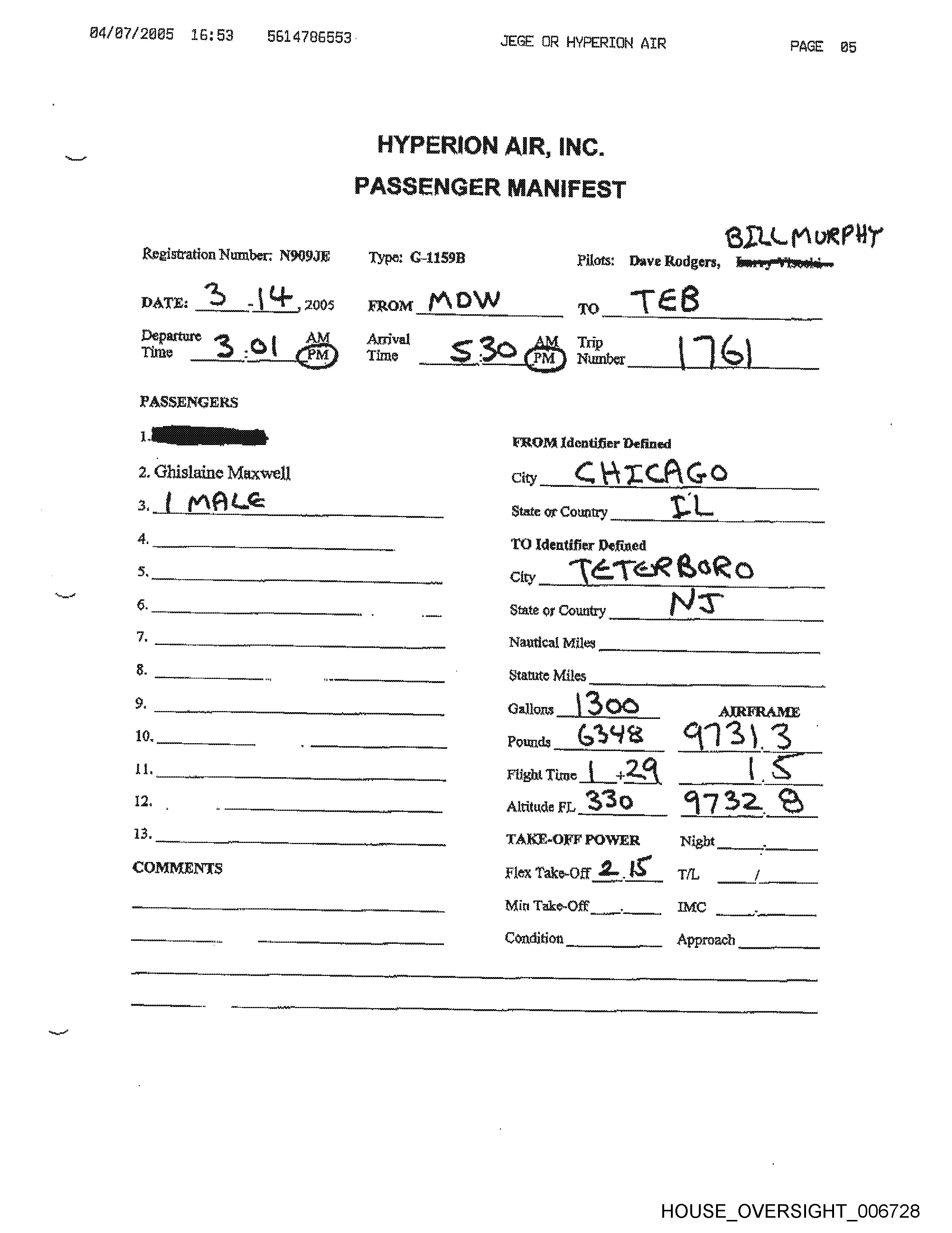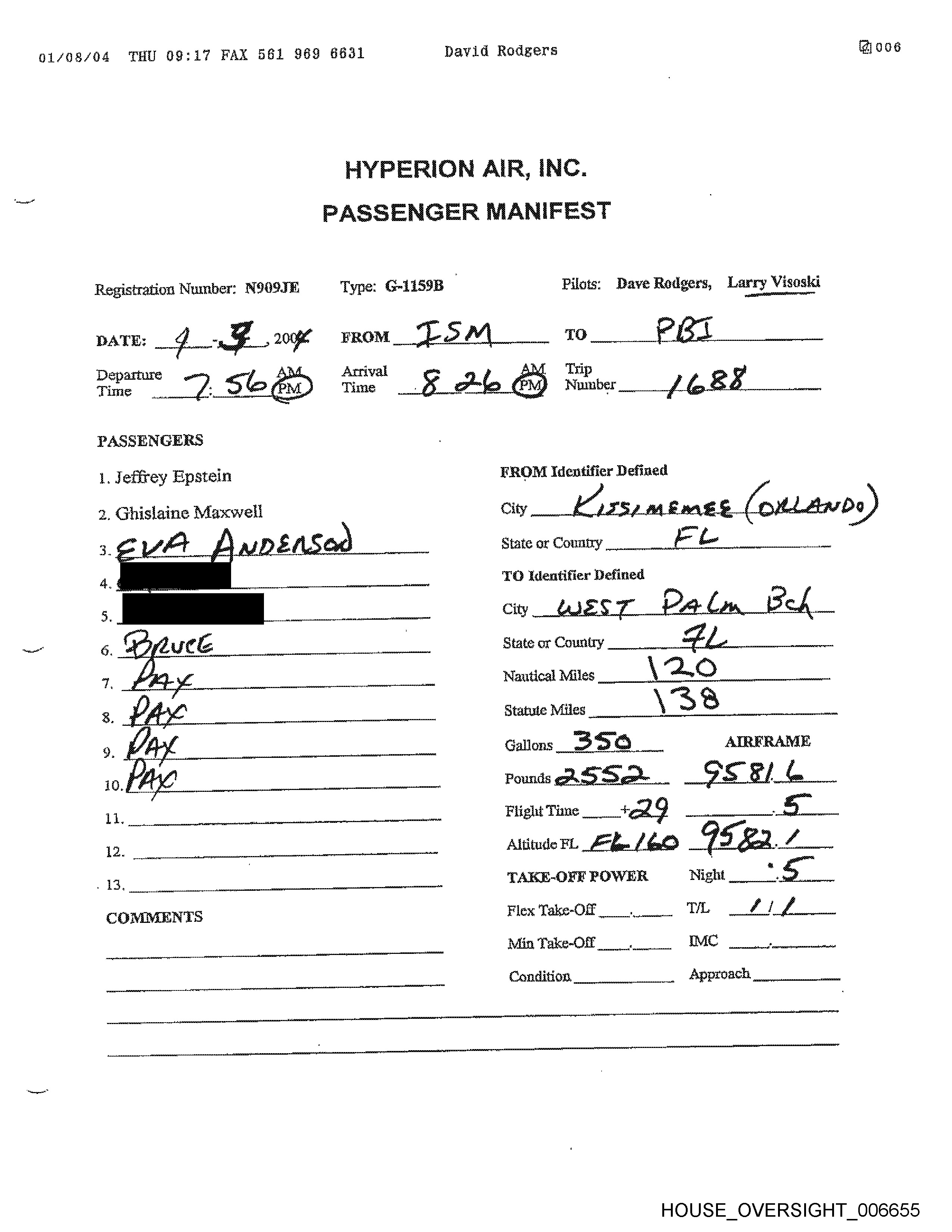 01/98/04 THU 09:17 FAX 561 969 8601 David Rodgers idioo6 Registration Number: NO09JE Type: G-1159B Pilots: Dave Rodgers, Larry Visoski DATE: J i : Departure Time 7: PASSENGERS TO Arrival Time Trip Number 1. Jefirey Epstein FROM Identifier Defined 4, Ghislaine Maxwell | City 3b mt £) sf PENnSad State or Country TO Identifier Defined City State or Country Nautical Miles Statute Miles Altitule FL 4h f Gi TAKE-OFF POWER Night Flex Take-Off T/L fife Min Take-Off. mc Condition, _ Approach HOUSE OVERSIGHT _006655