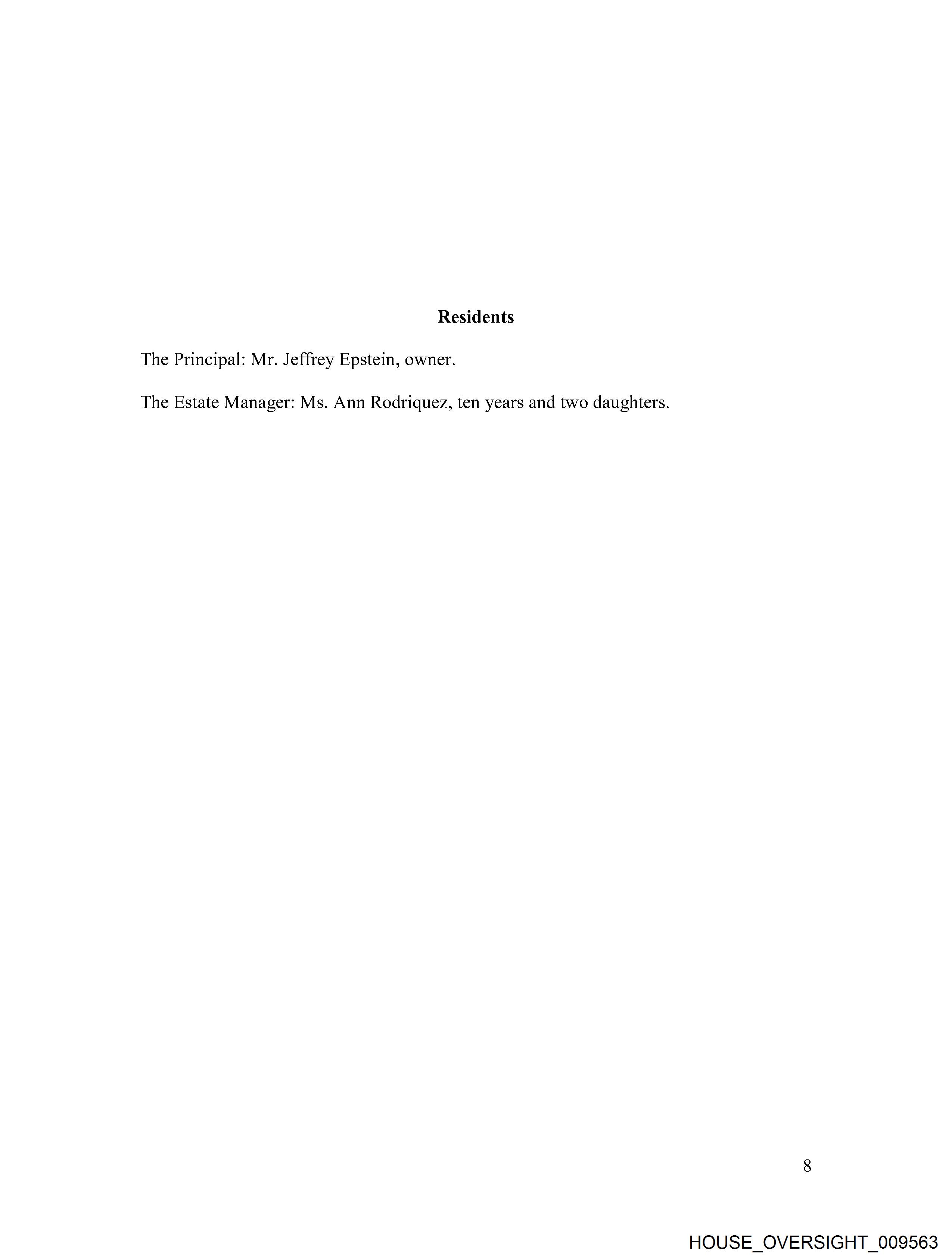 Safety & Security Principal prefers to reside in a safe environment with all required systems to insure such and to travel safely in well maintained vehicles, jets, helicopters or boats. Principal does not require personal security in residence or during travel to or from. Guest, Elder, Children, and Animal Care Principal has no elders, children or pets to care for. Principal prefers all guests to be taken care of to the highest standard. Principal’s Schedules Principal sets his own schedule. He is in residence on average two weeks each month. Usually he has business meetings and time with friends arranged before arrival. His day ranges from early morning into the evening depending on how many people he is seeing. "The information contained in this document is confidential and is intended only for the use of the authorized recipient. It is the property of Jeffrey Epstein. Unauthorized use, disclosure or copying of this document or any part thereof is strictly prohibited and may be unlawful. © 2013 Jeffrey Epstein - All rights reserved" HOUSE_OVERSIGHT_009637