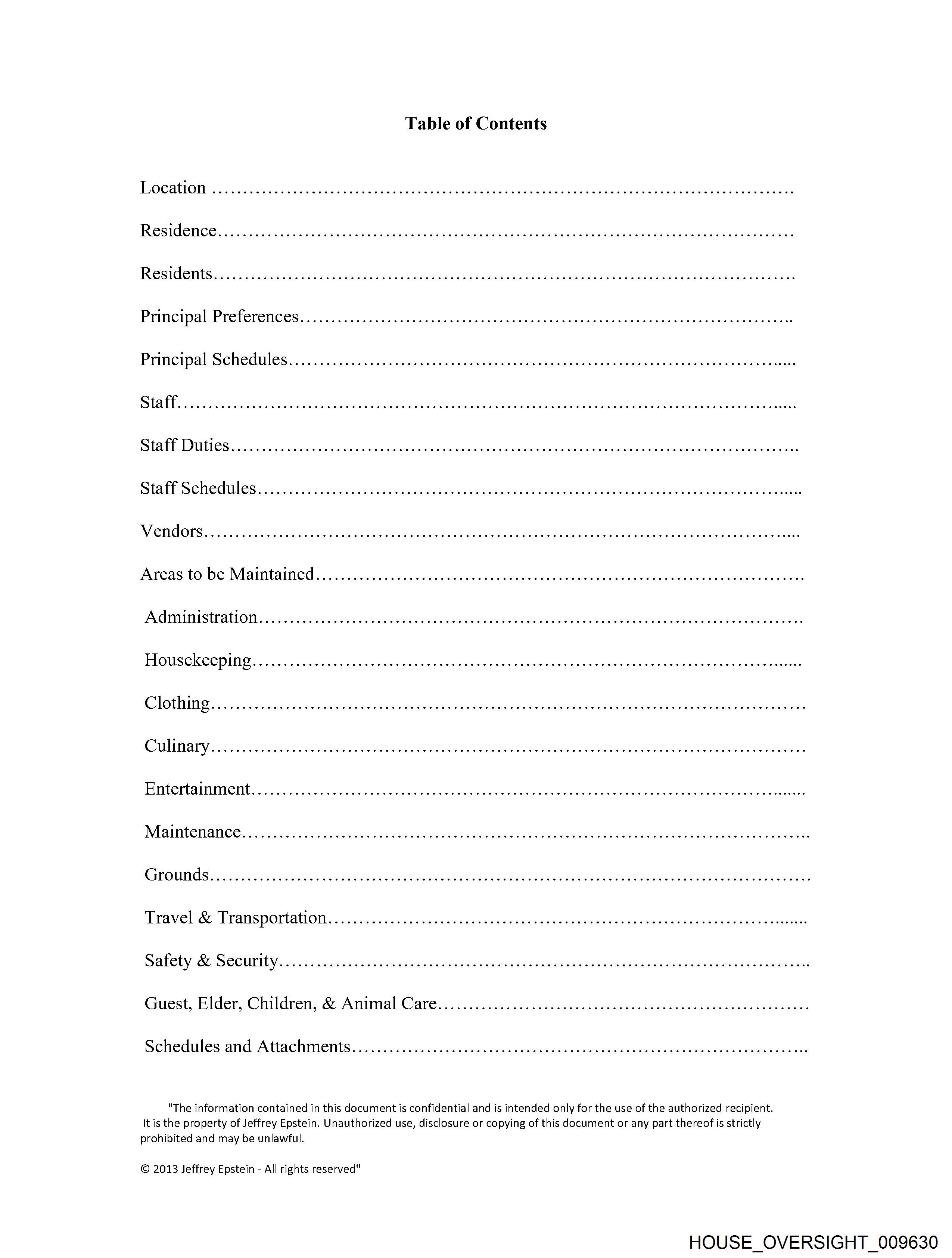 Table of Contents LOCATION 2... cece ccc ccc ccc cee cece ec ee cee ceeceuceueeuuvuevuevgeucengeunenneneengeneeceeueeteseetesnnes RESICCNCE. 2... ccc ccc ccc ccc cece cece cee ueececueuueceecenceuceueeuaenueueveevgeuengenenengentesennes Residents... .... cc ccc cece cece cece ececececeueetecucececeneneetentgeneuteaeeeventeneaeertetuteenteenees Ao 16 0) 6 Areas to be Maintained ........... cece ccc cece cece cnc n ene nee e eee e eee e sees eee eeeeeeeeeeeeneneeeeees AOHMIS AUD: «sss cmemns exasssnamome seas ¢cmmema eyes us eamome seas saumemegyssessameme sess 4s aumemagyss Jes COLES) Coley 0) 0 0 oe eT CCC OO Te CULIMALY... 2. cece eee EEE EE EEE EEE EEE EEE EEE EEE EEE EEE EEE EEE EEE eet eee eet es Entertainment. ....... 0... ccc cece cece cece ccc ce cee cucecececeneuteceeeentetngecentgeneeteneeneutesnstees Travel & Transportation........ 0... cece cece cece nee e een e ence eee ence eee eee eee e eee eeeenenneneeeeesy BALGLY Ge SCOUT Gis ss 1 assua0 05544 aswmune 4 44444 aswmua 444444 acmmmine 44544 RcmmwmIe 844 518 acomm 8 88 8 8 corm Guest, Elder, Children, & Animal Care..... 0... c cc cece ec ee ne cee eeeeseeueeueceeuceunes Schedules and Attachments............ 0.0... ccc cece cece ccc cccccccccccceceaceuceaeeesenveeseneeenenss "The information contained in this document is confidential and is intended only for the use of the authorized recipient. It is the property of Jeffrey Epstein. Unauthorized use, disclosure or copying of this document or any part thereo