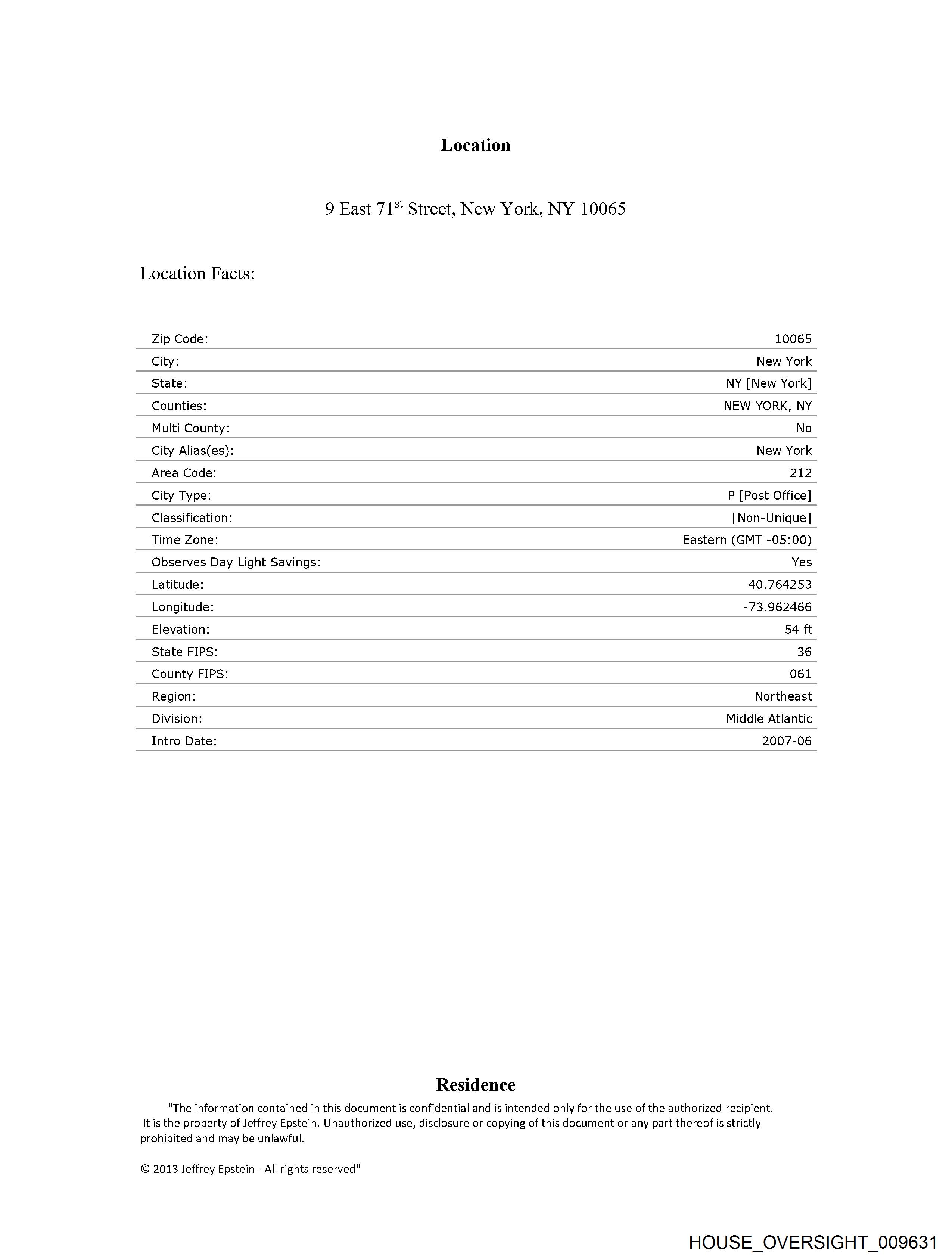 Location Facts: Zip Code: City: State: Counties: Multi County: City Alias(es): Area Code: City Type: Classification: Time Zone: Observes Day Light Savings: Latitude: Longitude: Elevation: State FIPS: County FIPS: Region: Division: Intro Date: Location 9 East 71%‘ Street, New York, NY 10065 Residence 10065 New York NY [New York] NEW YORK, NY No New York 212 P [Post Office] [Non-Unique] Eastern (GMT -05:00) Yes 40.764253 -73.962466 54 ft 36 061 Northeast Middle Atlantic 2007-06 "The information contained in this document is confidential and is intended only for the use of the authorized recipient. It is the property of Jeffrey Epstein. Unauthorized use, disclosure or copying of this document or any part thereof is strictly prohibited and may be unlawful. © 2013 Jeffrey Epstein - All rights reserved" HOUSE_OVERSIGHT_009631