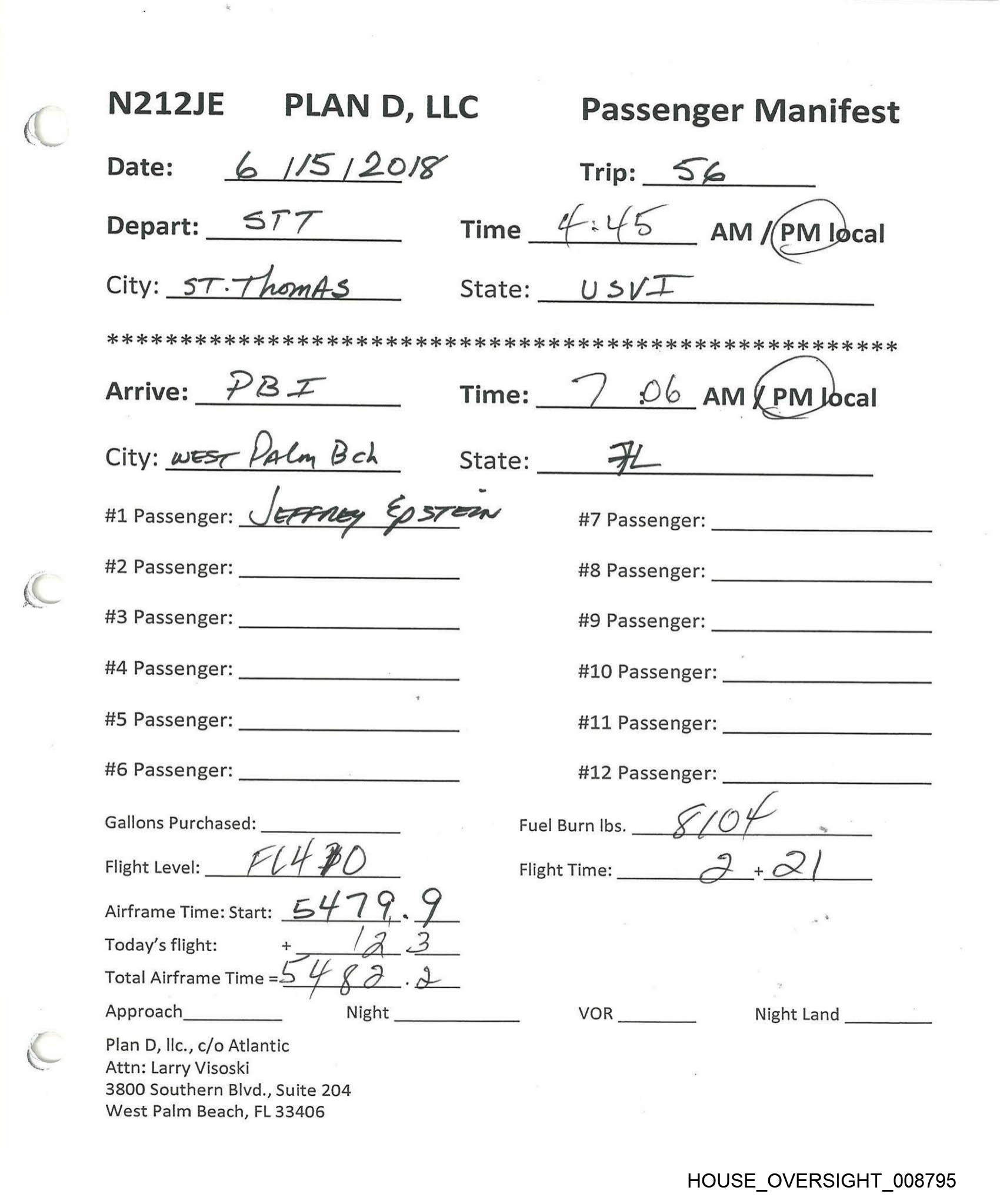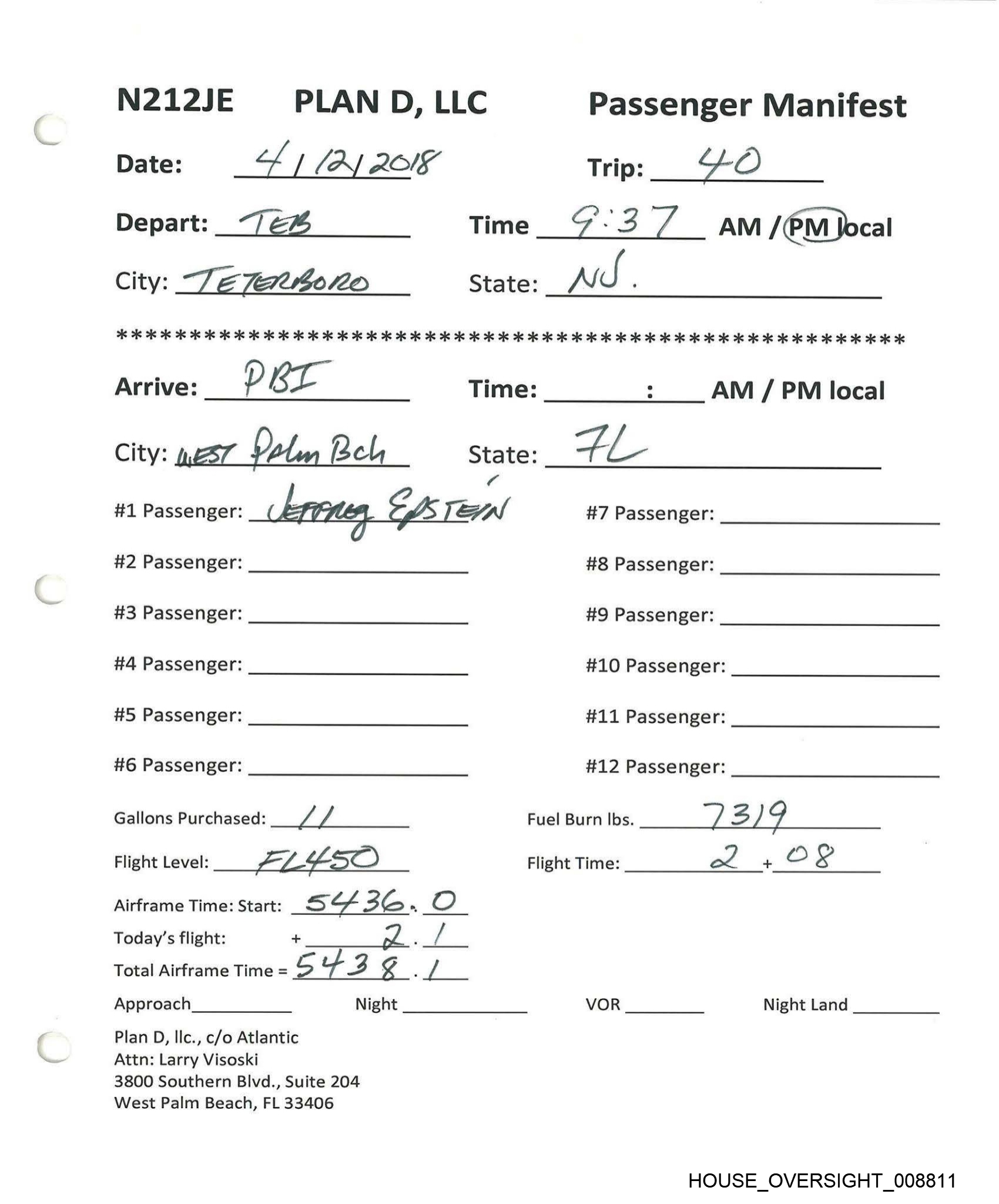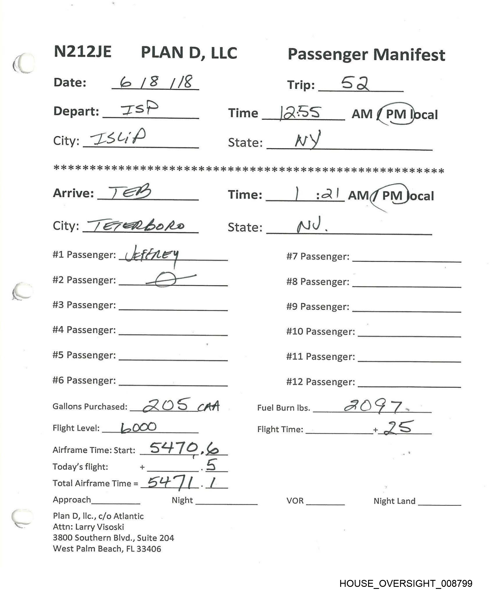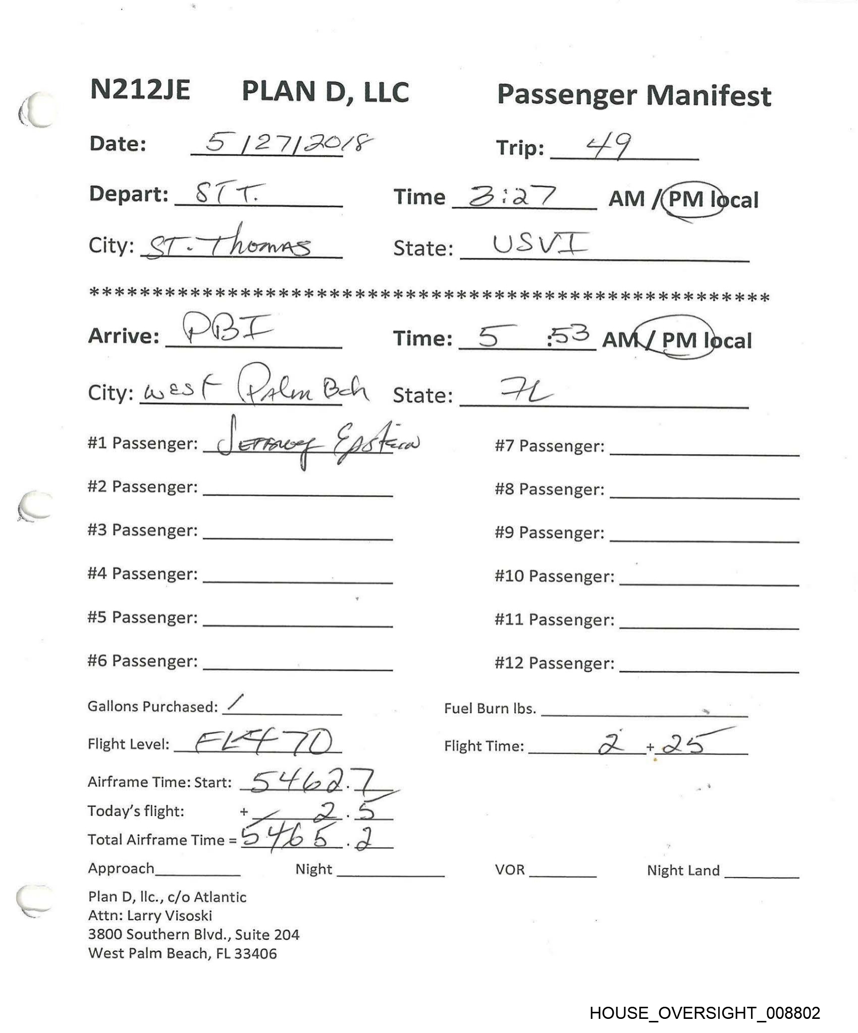 N212JE PLAN D, LLC Passenger Manifest